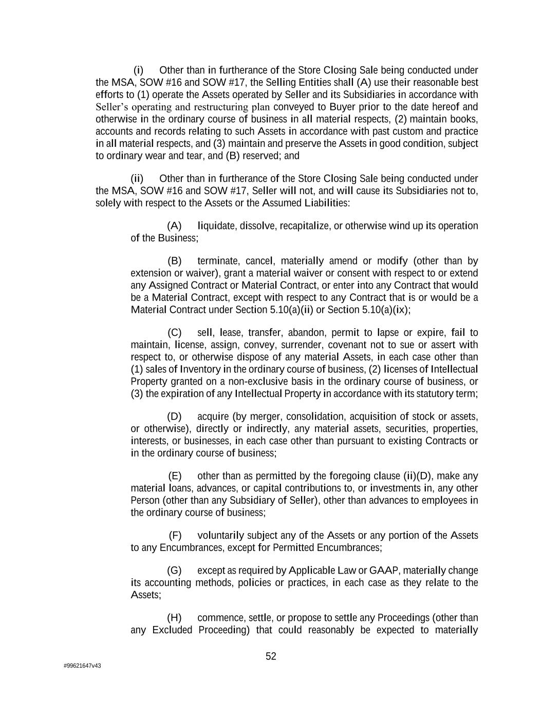 52 #99621647v43 (i) Other than in furtherance of the Store Closing Sale being conducted under the MSA, SOW #16 and SOW #17, the Selling Entities shall (A) use their reasonable best efforts to (1) operate the Assets operated by Seller and its Subsidiaries in accordance with Seller’s operating and restructuring plan conveyed to Buyer prior to the date hereof and otherwise in the ordinary course of business in all material respects, (2) maintain books, accounts and records relating to such Assets in accordance with past custom and practice in all material respects, and (3) maintain and preserve the Assets in good condition, subject to ordinary wear and tear, and (B) reserved; and (ii) Other than in furtherance of the Store Closing Sale being conducted under the MSA, SOW #16 and SOW #17, Seller will not, and will cause its Subsidiaries not to, solely with respect to the Assets or the Assumed Liabilities: (A) liquidate, dissolve, recapitalize, or otherwise wind up its operation of the Business; (B) terminate, cancel, materially amend or modify (other than by extension or waiver), grant a material waiver or consent with respect to or extend any Assigned Contract or Material Contract, or enter into any Contract that would be a Material Contract, except with respect to any Contract that is or would be a Material Contract under Section 5.10(a)(ii) or Section 5.10(a)(ix); (C) sell, lease, transfer, abandon, permit to lapse or expire, fail to maintain, license, assign, convey, surrender, covenant not to sue or assert with respect to, or otherwise dispose of any material Assets, in each case other than (1) sales of Inventory in the ordinary course of business, (2) licenses of Intellectual Property granted on a non-exclusive basis in the ordinary course of business, or (3) the expiration of any Intellectual Property in accordance with its statutory term; (D) acquire (by merger, consolidation, acquisition of stock or assets, or otherwise), directly or indirectly, any material assets, securities, properties, interests, or businesses, in each case other than pursuant to existing Contracts or in the ordinary course of business; (E) other than as permitted by the foregoing clause (ii)(D), make any material loans, advances, or capital contributions to, or investments in, any other Person (other than any Subsidiary of Seller), other than advances to employees in the ordinary course of business; (F) voluntarily subject any of the Assets or any portion of the Assets to any Encumbrances, except for Permitted Encumbrances; (G) except as required by Applicable Law or GAAP, materially change its accounting methods, policies or practices, in each case as they relate to the Assets; (H) commence, settle, or propose to settle any Proceedings (other than any Excluded Proceeding) that could reasonably be expected to materially