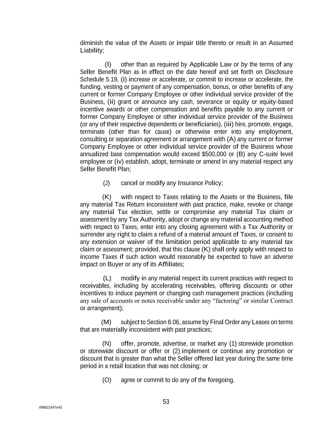 53 #99621647v43 diminish the value of the Assets or impair title thereto or result in an Assumed Liability; (I) other than as required by Applicable Law or by the terms of any Seller Benefit Plan as in effect on the date hereof and set forth on Disclosure Schedule 5.19, (i) increase or accelerate, or commit to increase or accelerate, the funding, vesting or payment of any compensation, bonus, or other benefits of any current or former Company Employee or other individual service provider of the Business, (ii) grant or announce any cash, severance or equity or equity-based incentive awards or other compensation and benefits payable to any current or former Company Employee or other individual service provider of the Business (or any of their respective dependents or beneficiaries), (iii) hire, promote, engage, terminate (other than for cause) or otherwise enter into any employment, consulting or separation agreement or arrangement with (A) any current or former Company Employee or other individual service provider of the Business whose annualized base compensation would exceed $500,000 or (B) any C-suite level employee or (iv) establish, adopt, terminate or amend in any material respect any Seller Benefit Plan; (J) cancel or modify any Insurance Policy; (K) with respect to Taxes relating to the Assets or the Business, file any material Tax Return inconsistent with past practice, make, revoke or change any material Tax election, settle or compromise any material Tax claim or assessment by any Tax Authority, adopt or change any material accounting method with respect to Taxes, enter into any closing agreement with a Tax Authority or surrender any right to claim a refund of a material amount of Taxes, or consent to any extension or waiver of the limitation period applicable to any material tax claim or assessment; provided, that this clause (K) shall only apply with respect to income Taxes if such action would reasonably be expected to have an adverse impact on Buyer or any of its Affiliates; (L) modify in any material respect its current practices with respect to receivables, including by accelerating receivables, offering discounts or other incentives to induce payment or changing cash management practices (including any sale of accounts or notes receivable under any “factoring” or similar Contract or arrangement); (M) subject to Section 8.06, assume by Final Order any Leases on terms that are materially inconsistent with past practices; (N) offer, promote, advertise, or market any (1) storewide promotion or storewide discount or offer or (2) implement or continue any promotion or discount that is greater than what the Seller offered last year during the same time period in a retail location that was not closing; or (O) agree or commit to do any of the foregoing.