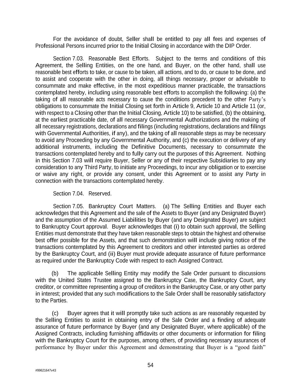 54 #99621647v43 For the avoidance of doubt, Seller shall be entitled to pay all fees and expenses of Professional Persons incurred prior to the Initial Closing in accordance with the DIP Order. Section 7.03. Reasonable Best Efforts. Subject to the terms and conditions of this Agreement, the Selling Entities, on the one hand, and Buyer, on the other hand, shall use reasonable best efforts to take, or cause to be taken, all actions, and to do, or cause to be done, and to assist and cooperate with the other in doing, all things necessary, proper or advisable to consummate and make effective, in the most expeditious manner practicable, the transactions contemplated hereby, including using reasonable best efforts to accomplish the following: (a) the taking of all reasonable acts necessary to cause the conditions precedent to the other Party’s obligations to consummate the Initial Closing set forth in Article 9, Article 10 and Article 11 (or, with respect to a Closing other than the Initial Closing, Article 10) to be satisfied, (b) the obtaining, at the earliest practicable date, of all necessary Governmental Authorizations and the making of all necessary registrations, declarations and filings (including registrations, declarations and filings with Governmental Authorities, if any), and the taking of all reasonable steps as may be necessary to avoid any Proceeding by any Governmental Authority, and (c) the execution or delivery of any additional instruments, including the Definitive Documents, necessary to consummate the transactions contemplated hereby and to fully carry out the purposes of this Agreement. Nothing in this Section 7.03 will require Buyer, Seller or any of their respective Subsidiaries to pay any consideration to any Third Party, to initiate any Proceedings, to incur any obligation or to exercise or waive any right, or provide any consent, under this Agreement or to assist any Party in connection with the transactions contemplated hereby. Section 7.04. Reserved. Section 7.05. Bankruptcy Court Matters. (a) The Selling Entities and Buyer each acknowledges that this Agreement and the sale of the Assets to Buyer (and any Designated Buyer) and the assumption of the Assumed Liabilities by Buyer (and any Designated Buyer) are subject to Bankruptcy Court approval. Buyer acknowledges that (i) to obtain such approval, the Selling Entities must demonstrate that they have taken reasonable steps to obtain the highest and otherwise best offer possible for the Assets, and that such demonstration will include giving notice of the transactions contemplated by this Agreement to creditors and other interested parties as ordered by the Bankruptcy Court, and (ii) Buyer must provide adequate assurance of future performance as required under the Bankruptcy Code with respect to each Assigned Contract. (b) The applicable Selling Entity may modify the Sale Order pursuant to discussions with the United States Trustee assigned to the Bankruptcy Case, the Bankruptcy Court, any creditor, or committee representing a group of creditors in the Bankruptcy Case, or any other party in interest; provided that any such modifications to the Sale Order shall be reasonably satisfactory to the Parties. (c) Buyer agrees that it will promptly take such actions as are reasonably requested by the Selling Entities to assist in obtaining entry of the Sale Order and a finding of adequate assurance of future performance by Buyer (and any Designated Buyer, where applicable) of the Assigned Contracts, including furnishing affidavits or other documents or information for filing with the Bankruptcy Court for the purposes, among others, of providing necessary assurances of performance by Buyer under this Agreement and demonstrating that Buyer is a “good faith”