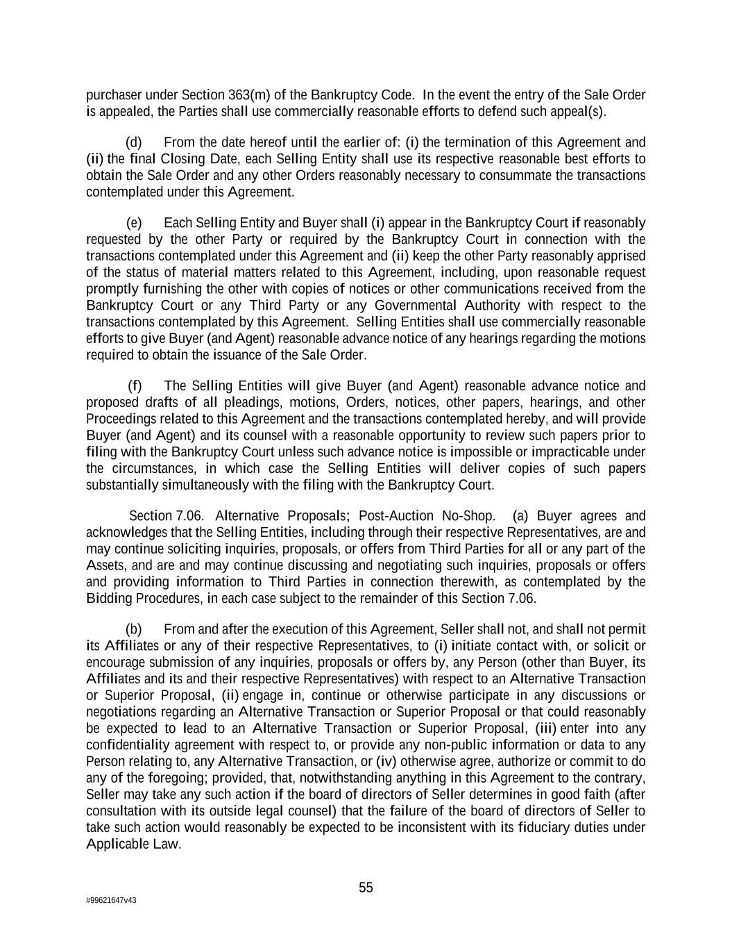 55 #99621647v43 purchaser under Section 363(m) of the Bankruptcy Code. In the event the entry of the Sale Order is appealed, the Parties shall use commercially reasonable efforts to defend such appeal(s). (d) From the date hereof until the earlier of: (i) the termination of this Agreement and (ii) the final Closing Date, each Selling Entity shall use its respective reasonable best efforts to obtain the Sale Order and any other Orders reasonably necessary to consummate the transactions contemplated under this Agreement. (e) Each Selling Entity and Buyer shall (i) appear in the Bankruptcy Court if reasonably requested by the other Party or required by the Bankruptcy Court in connection with the transactions contemplated under this Agreement and (ii) keep the other Party reasonably apprised of the status of material matters related to this Agreement, including, upon reasonable request promptly furnishing the other with copies of notices or other communications received from the Bankruptcy Court or any Third Party or any Governmental Authority with respect to the transactions contemplated by this Agreement. Selling Entities shall use commercially reasonable efforts to give Buyer (and Agent) reasonable advance notice of any hearings regarding the motions required to obtain the issuance of the Sale Order. (f) The Selling Entities will give Buyer (and Agent) reasonable advance notice and proposed drafts of all pleadings, motions, Orders, notices, other papers, hearings, and other Proceedings related to this Agreement and the transactions contemplated hereby, and will provide Buyer (and Agent) and its counsel with a reasonable opportunity to review such papers prior to filing with the Bankruptcy Court unless such advance notice is impossible or impracticable under the circumstances, in which case the Selling Entities will deliver copies of such papers substantially simultaneously with the filing with the Bankruptcy Court. Section 7.06. Alternative Proposals; Post-Auction No-Shop. (a) Buyer agrees and acknowledges that the Selling Entities, including through their respective Representatives, are and may continue soliciting inquiries, proposals, or offers from Third Parties for all or any part of the Assets, and are and may continue discussing and negotiating such inquiries, proposals or offers and providing information to Third Parties in connection therewith, as contemplated by the Bidding Procedures, in each case subject to the remainder of this Section 7.06. (b) From and after the execution of this Agreement, Seller shall not, and shall not permit its Affiliates or any of their respective Representatives, to (i) initiate contact with, or solicit or encourage submission of any inquiries, proposals or offers by, any Person (other than Buyer, its Affiliates and its and their respective Representatives) with respect to an Alternative Transaction or Superior Proposal, (ii) engage in, continue or otherwise participate in any discussions or negotiations regarding an Alternative Transaction or Superior Proposal or that could reasonably be expected to lead to an Alternative Transaction or Superior Proposal, (iii) enter into any confidentiality agreement with respect to, or provide any non-public information or data to any Person relating to, any Alternative Transaction, or (iv) otherwise agree, authorize or commit to do any of the foregoing; provided, that, notwithstanding anything in this Agreement to the contrary, Seller may take any such action if the board of directors of Seller determines in good faith (after consultation with its outside legal counsel) that the failure of the board of directors of Seller to take such action would reasonably be expected to be inconsistent with its fiduciary duties under Applicable Law.
