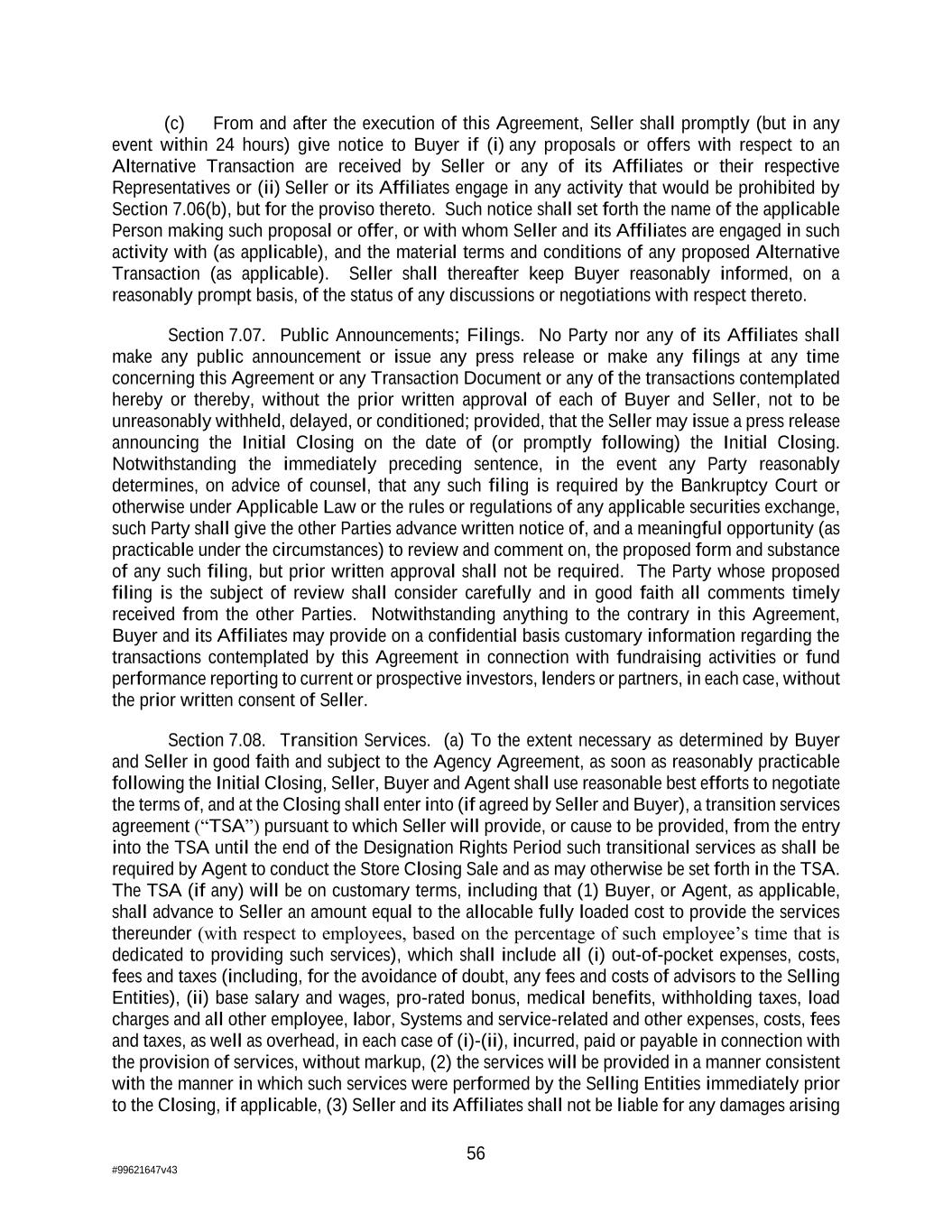 56 #99621647v43 (c) From and after the execution of this Agreement, Seller shall promptly (but in any event within 24 hours) give notice to Buyer if (i) any proposals or offers with respect to an Alternative Transaction are received by Seller or any of its Affiliates or their respective Representatives or (ii) Seller or its Affiliates engage in any activity that would be prohibited by Section 7.06(b), but for the proviso thereto. Such notice shall set forth the name of the applicable Person making such proposal or offer, or with whom Seller and its Affiliates are engaged in such activity with (as applicable), and the material terms and conditions of any proposed Alternative Transaction (as applicable). Seller shall thereafter keep Buyer reasonably informed, on a reasonably prompt basis, of the status of any discussions or negotiations with respect thereto. Section 7.07. Public Announcements; Filings. No Party nor any of its Affiliates shall make any public announcement or issue any press release or make any filings at any time concerning this Agreement or any Transaction Document or any of the transactions contemplated hereby or thereby, without the prior written approval of each of Buyer and Seller, not to be unreasonably withheld, delayed, or conditioned; provided, that the Seller may issue a press release announcing the Initial Closing on the date of (or promptly following) the Initial Closing. Notwithstanding the immediately preceding sentence, in the event any Party reasonably determines, on advice of counsel, that any such filing is required by the Bankruptcy Court or otherwise under Applicable Law or the rules or regulations of any applicable securities exchange, such Party shall give the other Parties advance written notice of, and a meaningful opportunity (as practicable under the circumstances) to review and comment on, the proposed form and substance of any such filing, but prior written approval shall not be required. The Party whose proposed filing is the subject of review shall consider carefully and in good faith all comments timely received from the other Parties. Notwithstanding anything to the contrary in this Agreement, Buyer and its Affiliates may provide on a confidential basis customary information regarding the transactions contemplated by this Agreement in connection with fundraising activities or fund performance reporting to current or prospective investors, lenders or partners, in each case, without the prior written consent of Seller. Section 7.08. Transition Services. (a) To the extent necessary as determined by Buyer and Seller in good faith and subject to the Agency Agreement, as soon as reasonably practicable following the Initial Closing, Seller, Buyer and Agent shall use reasonable best efforts to negotiate the terms of, and at the Closing shall enter into (if agreed by Seller and Buyer), a transition services agreement (“TSA”) pursuant to which Seller will provide, or cause to be provided, from the entry into the TSA until the end of the Designation Rights Period such transitional services as shall be required by Agent to conduct the Store Closing Sale and as may otherwise be set forth in the TSA. The TSA (if any) will be on customary terms, including that (1) Buyer, or Agent, as applicable, shall advance to Seller an amount equal to the allocable fully loaded cost to provide the services thereunder (with respect to employees, based on the percentage of such employee’s time that is dedicated to providing such services), which shall include all (i) out-of-pocket expenses, costs, fees and taxes (including, for the avoidance of doubt, any fees and costs of advisors to the Selling Entities), (ii) base salary and wages, pro-rated bonus, medical benefits, withholding taxes, load charges and all other employee, labor, Systems and service-related and other expenses, costs, fees and taxes, as well as overhead, in each case of (i)-(ii), incurred, paid or payable in connection with the provision of services, without markup, (2) the services will be provided in a manner consistent with the manner in which such services were performed by the Selling Entities immediately prior to the Closing, if applicable, (3) Seller and its Affiliates shall not be liable for any damages arising