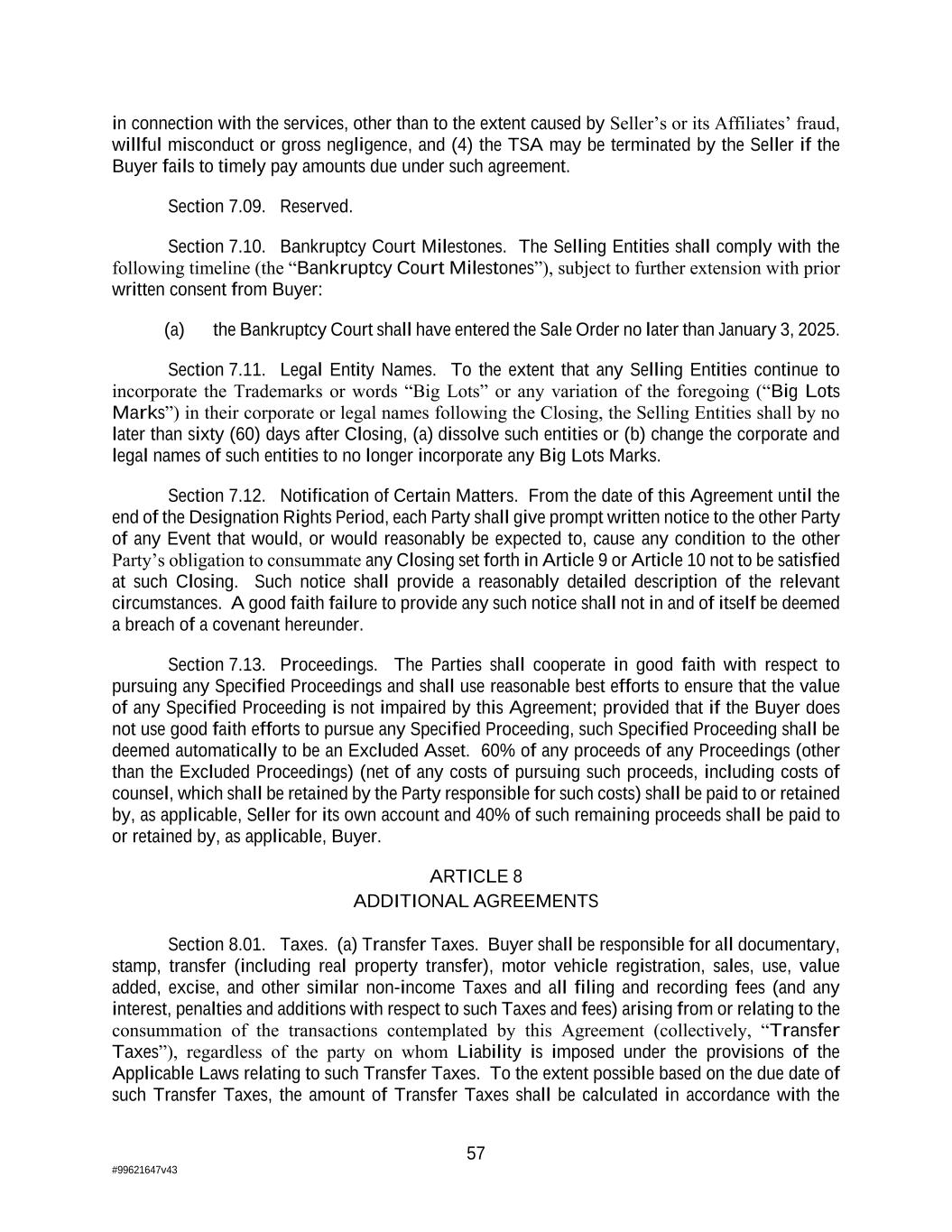 57 #99621647v43 in connection with the services, other than to the extent caused by Seller’s or its Affiliates’ fraud, willful misconduct or gross negligence, and (4) the TSA may be terminated by the Seller if the Buyer fails to timely pay amounts due under such agreement. Section 7.09. Reserved. Section 7.10. Bankruptcy Court Milestones. The Selling Entities shall comply with the following timeline (the “Bankruptcy Court Milestones”), subject to further extension with prior written consent from Buyer: (a) the Bankruptcy Court shall have entered the Sale Order no later than January 3, 2025. Section 7.11. Legal Entity Names. To the extent that any Selling Entities continue to incorporate the Trademarks or words “Big Lots” or any variation of the foregoing (“Big Lots Marks”) in their corporate or legal names following the Closing, the Selling Entities shall by no later than sixty (60) days after Closing, (a) dissolve such entities or (b) change the corporate and legal names of such entities to no longer incorporate any Big Lots Marks. Section 7.12. Notification of Certain Matters. From the date of this Agreement until the end of the Designation Rights Period, each Party shall give prompt written notice to the other Party of any Event that would, or would reasonably be expected to, cause any condition to the other Party’s obligation to consummate any Closing set forth in Article 9 or Article 10 not to be satisfied at such Closing. Such notice shall provide a reasonably detailed description of the relevant circumstances. A good faith failure to provide any such notice shall not in and of itself be deemed a breach of a covenant hereunder. Section 7.13. Proceedings. The Parties shall cooperate in good faith with respect to pursuing any Specified Proceedings and shall use reasonable best efforts to ensure that the value of any Specified Proceeding is not impaired by this Agreement; provided that if the Buyer does not use good faith efforts to pursue any Specified Proceeding, such Specified Proceeding shall be deemed automatically to be an Excluded Asset. 60% of any proceeds of any Proceedings (other than the Excluded Proceedings) (net of any costs of pursuing such proceeds, including costs of counsel, which shall be retained by the Party responsible for such costs) shall be paid to or retained by, as applicable, Seller for its own account and 40% of such remaining proceeds shall be paid to or retained by, as applicable, Buyer. ARTICLE 8 ADDITIONAL AGREEMENTS Section 8.01. Taxes. (a) Transfer Taxes. Buyer shall be responsible for all documentary, stamp, transfer (including real property transfer), motor vehicle registration, sales, use, value added, excise, and other similar non-income Taxes and all filing and recording fees (and any interest, penalties and additions with respect to such Taxes and fees) arising from or relating to the consummation of the transactions contemplated by this Agreement (collectively, “Transfer Taxes”), regardless of the party on whom Liability is imposed under the provisions of the Applicable Laws relating to such Transfer Taxes. To the extent possible based on the due date of such Transfer Taxes, the amount of Transfer Taxes shall be calculated in accordance with the