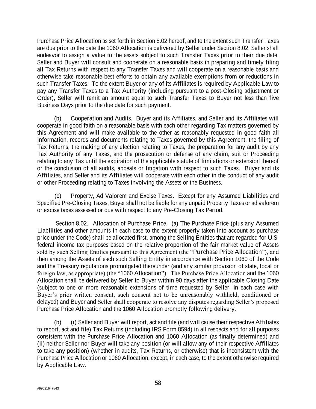 58 #99621647v43 Purchase Price Allocation as set forth in Section 8.02 hereof, and to the extent such Transfer Taxes are due prior to the date the 1060 Allocation is delivered by Seller under Section 8.02, Seller shall endeavor to assign a value to the assets subject to such Transfer Taxes prior to their due date. Seller and Buyer will consult and cooperate on a reasonable basis in preparing and timely filing all Tax Returns with respect to any Transfer Taxes and will cooperate on a reasonable basis and otherwise take reasonable best efforts to obtain any available exemptions from or reductions in such Transfer Taxes. To the extent Buyer or any of its Affiliates is required by Applicable Law to pay any Transfer Taxes to a Tax Authority (including pursuant to a post-Closing adjustment or Order), Seller will remit an amount equal to such Transfer Taxes to Buyer not less than five Business Days prior to the due date for such payment. (b) Cooperation and Audits. Buyer and its Affiliates, and Seller and its Affiliates will cooperate in good faith on a reasonable basis with each other regarding Tax matters governed by this Agreement and will make available to the other as reasonably requested in good faith all information, records and documents relating to Taxes governed by this Agreement, the filing of Tax Returns, the making of any election relating to Taxes, the preparation for any audit by any Tax Authority of any Taxes, and the prosecution or defense of any claim, suit or Proceeding relating to any Tax until the expiration of the applicable statute of limitations or extension thereof or the conclusion of all audits, appeals or litigation with respect to such Taxes. Buyer and its Affiliates, and Seller and its Affiliates will cooperate with each other in the conduct of any audit or other Proceeding relating to Taxes involving the Assets or the Business. (c) Property, Ad Valorem and Excise Taxes. Except for any Assumed Liabilities and Specified Pre-Closing Taxes, Buyer shall not be liable for any unpaid Property Taxes or ad valorem or excise taxes assessed or due with respect to any Pre-Closing Tax Period. Section 8.02. Allocation of Purchase Price. (a) The Purchase Price (plus any Assumed Liabilities and other amounts in each case to the extent properly taken into account as purchase price under the Code) shall be allocated first, among the Selling Entities that are regarded for U.S. federal income tax purposes based on the relative proportion of the fair market value of Assets sold by such Selling Entities pursuant to this Agreement (the “Purchase Price Allocation”), and then among the Assets of each such Selling Entity in accordance with Section 1060 of the Code and the Treasury regulations promulgated thereunder (and any similar provision of state, local or foreign law, as appropriate) (the “1060 Allocation”). The Purchase Price Allocation and the 1060 Allocation shall be delivered by Seller to Buyer within 90 days after the applicable Closing Date (subject to one or more reasonable extensions of time requested by Seller, in each case with Buyer’s prior written consent, such consent not to be unreasonably withheld, conditioned or delayed) and Buyer and Seller shall cooperate to resolve any disputes regarding Seller’s proposed Purchase Price Allocation and the 1060 Allocation promptly following delivery. (b) (i) Seller and Buyer will report, act and file (and will cause their respective Affiliates to report, act and file) Tax Returns (including IRS Form 8594) in all respects and for all purposes consistent with the Purchase Price Allocation and 1060 Allocation (as finally determined) and (ii) neither Seller nor Buyer will take any position (or will allow any of their respective Affiliates to take any position) (whether in audits, Tax Returns, or otherwise) that is inconsistent with the Purchase Price Allocation or 1060 Allocation, except, in each case, to the extent otherwise required by Applicable Law.