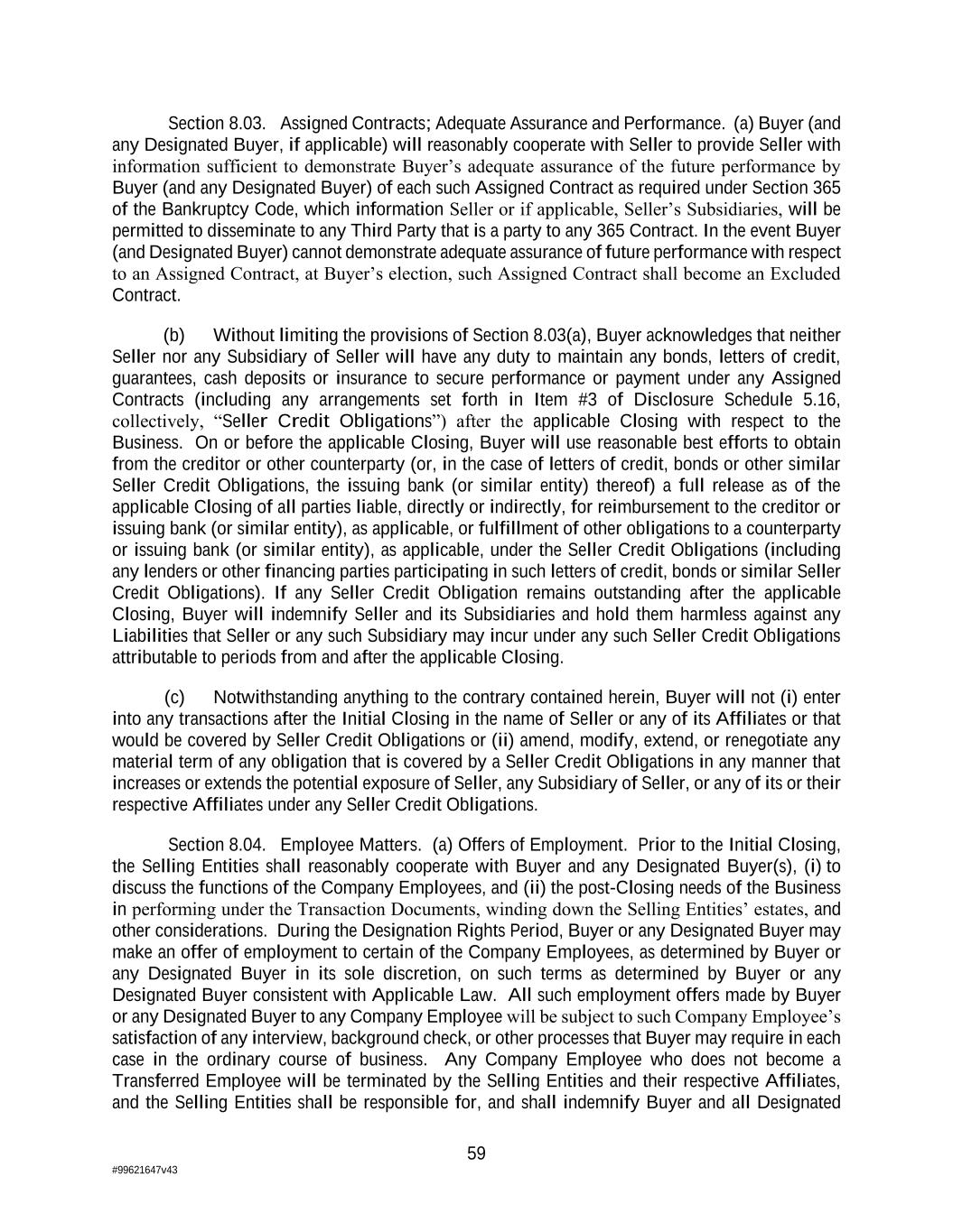 59 #99621647v43 Section 8.03. Assigned Contracts; Adequate Assurance and Performance. (a) Buyer (and any Designated Buyer, if applicable) will reasonably cooperate with Seller to provide Seller with information sufficient to demonstrate Buyer’s adequate assurance of the future performance by Buyer (and any Designated Buyer) of each such Assigned Contract as required under Section 365 of the Bankruptcy Code, which information Seller or if applicable, Seller’s Subsidiaries, will be permitted to disseminate to any Third Party that is a party to any 365 Contract. In the event Buyer (and Designated Buyer) cannot demonstrate adequate assurance of future performance with respect to an Assigned Contract, at Buyer’s election, such Assigned Contract shall become an Excluded Contract. (b) Without limiting the provisions of Section 8.03(a), Buyer acknowledges that neither Seller nor any Subsidiary of Seller will have any duty to maintain any bonds, letters of credit, guarantees, cash deposits or insurance to secure performance or payment under any Assigned Contracts (including any arrangements set forth in Item #3 of Disclosure Schedule 5.16, collectively, “Seller Credit Obligations”) after the applicable Closing with respect to the Business. On or before the applicable Closing, Buyer will use reasonable best efforts to obtain from the creditor or other counterparty (or, in the case of letters of credit, bonds or other similar Seller Credit Obligations, the issuing bank (or similar entity) thereof) a full release as of the applicable Closing of all parties liable, directly or indirectly, for reimbursement to the creditor or issuing bank (or similar entity), as applicable, or fulfillment of other obligations to a counterparty or issuing bank (or similar entity), as applicable, under the Seller Credit Obligations (including any lenders or other financing parties participating in such letters of credit, bonds or similar Seller Credit Obligations). If any Seller Credit Obligation remains outstanding after the applicable Closing, Buyer will indemnify Seller and its Subsidiaries and hold them harmless against any Liabilities that Seller or any such Subsidiary may incur under any such Seller Credit Obligations attributable to periods from and after the applicable Closing. (c) Notwithstanding anything to the contrary contained herein, Buyer will not (i) enter into any transactions after the Initial Closing in the name of Seller or any of its Affiliates or that would be covered by Seller Credit Obligations or (ii) amend, modify, extend, or renegotiate any material term of any obligation that is covered by a Seller Credit Obligations in any manner that increases or extends the potential exposure of Seller, any Subsidiary of Seller, or any of its or their respective Affiliates under any Seller Credit Obligations. Section 8.04. Employee Matters. (a) Offers of Employment. Prior to the Initial Closing, the Selling Entities shall reasonably cooperate with Buyer and any Designated Buyer(s), (i) to discuss the functions of the Company Employees, and (ii) the post-Closing needs of the Business in performing under the Transaction Documents, winding down the Selling Entities’ estates, and other considerations. During the Designation Rights Period, Buyer or any Designated Buyer may make an offer of employment to certain of the Company Employees, as determined by Buyer or any Designated Buyer in its sole discretion, on such terms as determined by Buyer or any Designated Buyer consistent with Applicable Law. All such employment offers made by Buyer or any Designated Buyer to any Company Employee will be subject to such Company Employee’s satisfaction of any interview, background check, or other processes that Buyer may require in each case in the ordinary course of business. Any Company Employee who does not become a Transferred Employee will be terminated by the Selling Entities and their respective Affiliates, and the Selling Entities shall be responsible for, and shall indemnify Buyer and all Designated