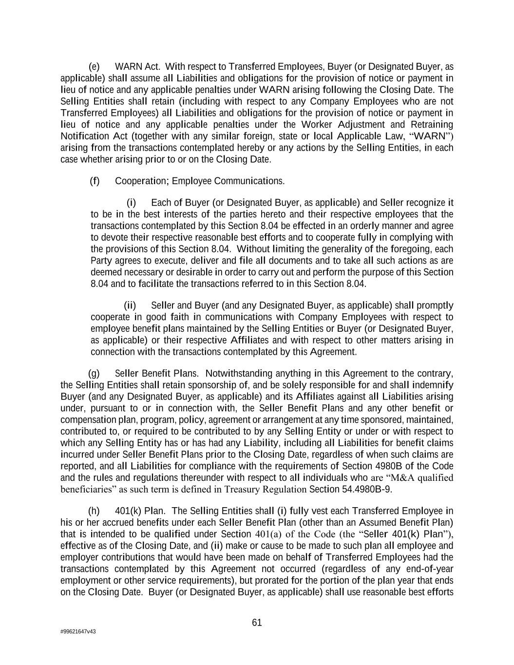 61 #99621647v43 (e) WARN Act. With respect to Transferred Employees, Buyer (or Designated Buyer, as applicable) shall assume all Liabilities and obligations for the provision of notice or payment in lieu of notice and any applicable penalties under WARN arising following the Closing Date. The Selling Entities shall retain (including with respect to any Company Employees who are not Transferred Employees) all Liabilities and obligations for the provision of notice or payment in lieu of notice and any applicable penalties under the Worker Adjustment and Retraining Notification Act (together with any similar foreign, state or local Applicable Law, “WARN”) arising from the transactions contemplated hereby or any actions by the Selling Entities, in each case whether arising prior to or on the Closing Date. (f) Cooperation; Employee Communications. (i) Each of Buyer (or Designated Buyer, as applicable) and Seller recognize it to be in the best interests of the parties hereto and their respective employees that the transactions contemplated by this Section 8.04 be effected in an orderly manner and agree to devote their respective reasonable best efforts and to cooperate fully in complying with the provisions of this Section 8.04. Without limiting the generality of the foregoing, each Party agrees to execute, deliver and file all documents and to take all such actions as are deemed necessary or desirable in order to carry out and perform the purpose of this Section 8.04 and to facilitate the transactions referred to in this Section 8.04. (ii) Seller and Buyer (and any Designated Buyer, as applicable) shall promptly cooperate in good faith in communications with Company Employees with respect to employee benefit plans maintained by the Selling Entities or Buyer (or Designated Buyer, as applicable) or their respective Affiliates and with respect to other matters arising in connection with the transactions contemplated by this Agreement. (g) Seller Benefit Plans. Notwithstanding anything in this Agreement to the contrary, the Selling Entities shall retain sponsorship of, and be solely responsible for and shall indemnify Buyer (and any Designated Buyer, as applicable) and its Affiliates against all Liabilities arising under, pursuant to or in connection with, the Seller Benefit Plans and any other benefit or compensation plan, program, policy, agreement or arrangement at any time sponsored, maintained, contributed to, or required to be contributed to by any Selling Entity or under or with respect to which any Selling Entity has or has had any Liability, including all Liabilities for benefit claims incurred under Seller Benefit Plans prior to the Closing Date, regardless of when such claims are reported, and all Liabilities for compliance with the requirements of Section 4980B of the Code and the rules and regulations thereunder with respect to all individuals who are “M&A qualified beneficiaries” as such term is defined in Treasury Regulation Section 54.4980B-9. (h) 401(k) Plan. The Selling Entities shall (i) fully vest each Transferred Employee in his or her accrued benefits under each Seller Benefit Plan (other than an Assumed Benefit Plan) that is intended to be qualified under Section 401(a) of the Code (the “Seller 401(k) Plan”), effective as of the Closing Date, and (ii) make or cause to be made to such plan all employee and employer contributions that would have been made on behalf of Transferred Employees had the transactions contemplated by this Agreement not occurred (regardless of any end-of-year employment or other service requirements), but prorated for the portion of the plan year that ends on the Closing Date. Buyer (or Designated Buyer, as applicable) shall use reasonable best efforts