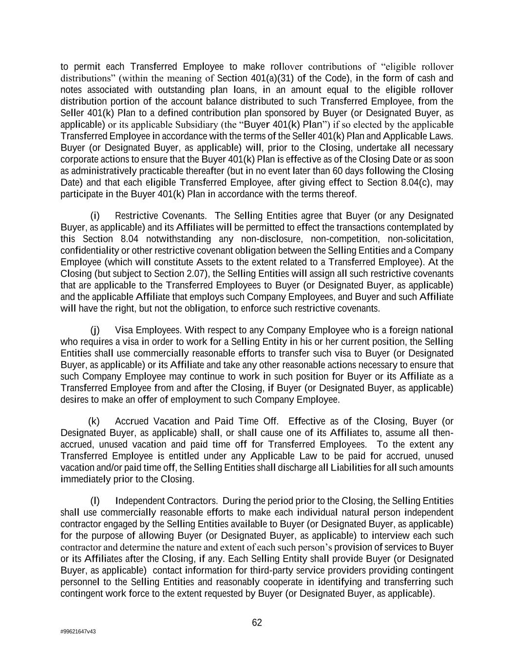 62 #99621647v43 to permit each Transferred Employee to make rollover contributions of “eligible rollover distributions” (within the meaning of Section 401(a)(31) of the Code), in the form of cash and notes associated with outstanding plan loans, in an amount equal to the eligible rollover distribution portion of the account balance distributed to such Transferred Employee, from the Seller 401(k) Plan to a defined contribution plan sponsored by Buyer (or Designated Buyer, as applicable) or its applicable Subsidiary (the “Buyer 401(k) Plan”) if so elected by the applicable Transferred Employee in accordance with the terms of the Seller 401(k) Plan and Applicable Laws. Buyer (or Designated Buyer, as applicable) will, prior to the Closing, undertake all necessary corporate actions to ensure that the Buyer 401(k) Plan is effective as of the Closing Date or as soon as administratively practicable thereafter (but in no event later than 60 days following the Closing Date) and that each eligible Transferred Employee, after giving effect to Section 8.04(c), may participate in the Buyer 401(k) Plan in accordance with the terms thereof. (i) Restrictive Covenants. The Selling Entities agree that Buyer (or any Designated Buyer, as applicable) and its Affiliates will be permitted to effect the transactions contemplated by this Section 8.04 notwithstanding any non-disclosure, non-competition, non-solicitation, confidentiality or other restrictive covenant obligation between the Selling Entities and a Company Employee (which will constitute Assets to the extent related to a Transferred Employee). At the Closing (but subject to Section 2.07), the Selling Entities will assign all such restrictive covenants that are applicable to the Transferred Employees to Buyer (or Designated Buyer, as applicable) and the applicable Affiliate that employs such Company Employees, and Buyer and such Affiliate will have the right, but not the obligation, to enforce such restrictive covenants. (j) Visa Employees. With respect to any Company Employee who is a foreign national who requires a visa in order to work for a Selling Entity in his or her current position, the Selling Entities shall use commercially reasonable efforts to transfer such visa to Buyer (or Designated Buyer, as applicable) or its Affiliate and take any other reasonable actions necessary to ensure that such Company Employee may continue to work in such position for Buyer or its Affiliate as a Transferred Employee from and after the Closing, if Buyer (or Designated Buyer, as applicable) desires to make an offer of employment to such Company Employee. (k) Accrued Vacation and Paid Time Off. Effective as of the Closing, Buyer (or Designated Buyer, as applicable) shall, or shall cause one of its Affiliates to, assume all then- accrued, unused vacation and paid time off for Transferred Employees. To the extent any Transferred Employee is entitled under any Applicable Law to be paid for accrued, unused vacation and/or paid time off, the Selling Entities shall discharge all Liabilities for all such amounts immediately prior to the Closing. (l) Independent Contractors. During the period prior to the Closing, the Selling Entities shall use commercially reasonable efforts to make each individual natural person independent contractor engaged by the Selling Entities available to Buyer (or Designated Buyer, as applicable) for the purpose of allowing Buyer (or Designated Buyer, as applicable) to interview each such contractor and determine the nature and extent of each such person’s provision of services to Buyer or its Affiliates after the Closing, if any. Each Selling Entity shall provide Buyer (or Designated Buyer, as applicable) contact information for third-party service providers providing contingent personnel to the Selling Entities and reasonably cooperate in identifying and transferring such contingent work force to the extent requested by Buyer (or Designated Buyer, as applicable).