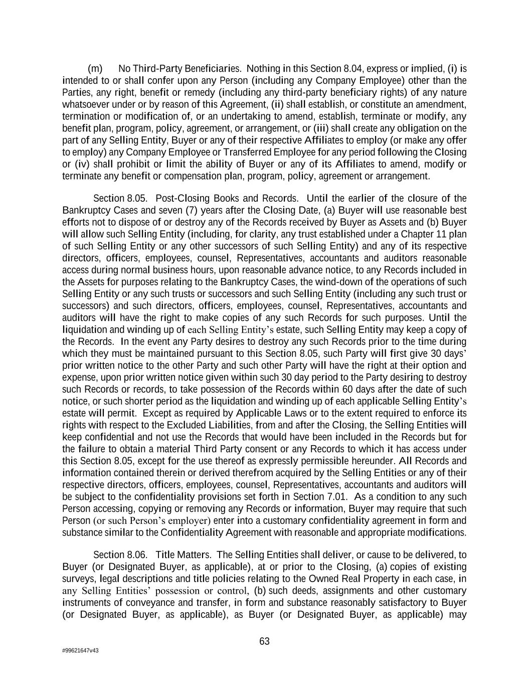 63 #99621647v43 (m) No Third-Party Beneficiaries. Nothing in this Section 8.04, express or implied, (i) is intended to or shall confer upon any Person (including any Company Employee) other than the Parties, any right, benefit or remedy (including any third-party beneficiary rights) of any nature whatsoever under or by reason of this Agreement, (ii) shall establish, or constitute an amendment, termination or modification of, or an undertaking to amend, establish, terminate or modify, any benefit plan, program, policy, agreement, or arrangement, or (iii) shall create any obligation on the part of any Selling Entity, Buyer or any of their respective Affiliates to employ (or make any offer to employ) any Company Employee or Transferred Employee for any period following the Closing or (iv) shall prohibit or limit the ability of Buyer or any of its Affiliates to amend, modify or terminate any benefit or compensation plan, program, policy, agreement or arrangement. Section 8.05. Post-Closing Books and Records. Until the earlier of the closure of the Bankruptcy Cases and seven (7) years after the Closing Date, (a) Buyer will use reasonable best efforts not to dispose of or destroy any of the Records received by Buyer as Assets and (b) Buyer will allow such Selling Entity (including, for clarity, any trust established under a Chapter 11 plan of such Selling Entity or any other successors of such Selling Entity) and any of its respective directors, officers, employees, counsel, Representatives, accountants and auditors reasonable access during normal business hours, upon reasonable advance notice, to any Records included in the Assets for purposes relating to the Bankruptcy Cases, the wind-down of the operations of such Selling Entity or any such trusts or successors and such Selling Entity (including any such trust or successors) and such directors, officers, employees, counsel, Representatives, accountants and auditors will have the right to make copies of any such Records for such purposes. Until the liquidation and winding up of each Selling Entity’s estate, such Selling Entity may keep a copy of the Records. In the event any Party desires to destroy any such Records prior to the time during which they must be maintained pursuant to this Section 8.05, such Party will first give 30 days’ prior written notice to the other Party and such other Party will have the right at their option and expense, upon prior written notice given within such 30 day period to the Party desiring to destroy such Records or records, to take possession of the Records within 60 days after the date of such notice, or such shorter period as the liquidation and winding up of each applicable Selling Entity’s estate will permit. Except as required by Applicable Laws or to the extent required to enforce its rights with respect to the Excluded Liabilities, from and after the Closing, the Selling Entities will keep confidential and not use the Records that would have been included in the Records but for the failure to obtain a material Third Party consent or any Records to which it has access under this Section 8.05, except for the use thereof as expressly permissible hereunder. All Records and information contained therein or derived therefrom acquired by the Selling Entities or any of their respective directors, officers, employees, counsel, Representatives, accountants and auditors will be subject to the confidentiality provisions set forth in Section 7.01. As a condition to any such Person accessing, copying or removing any Records or information, Buyer may require that such Person (or such Person’s employer) enter into a customary confidentiality agreement in form and substance similar to the Confidentiality Agreement with reasonable and appropriate modifications. Section 8.06. Title Matters. The Selling Entities shall deliver, or cause to be delivered, to Buyer (or Designated Buyer, as applicable), at or prior to the Closing, (a) copies of existing surveys, legal descriptions and title policies relating to the Owned Real Property in each case, in any Selling Entities’ possession or control, (b) such deeds, assignments and other customary instruments of conveyance and transfer, in form and substance reasonably satisfactory to Buyer (or Designated Buyer, as applicable), as Buyer (or Designated Buyer, as applicable) may