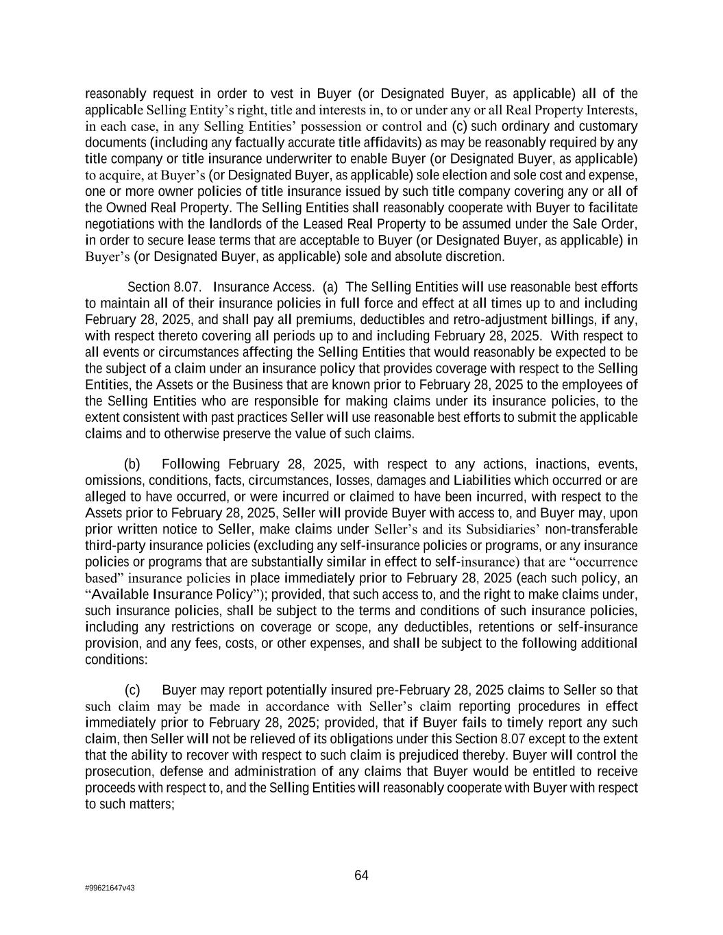 64 #99621647v43 reasonably request in order to vest in Buyer (or Designated Buyer, as applicable) all of the applicable Selling Entity’s right, title and interests in, to or under any or all Real Property Interests, in each case, in any Selling Entities’ possession or control and (c) such ordinary and customary documents (including any factually accurate title affidavits) as may be reasonably required by any title company or title insurance underwriter to enable Buyer (or Designated Buyer, as applicable) to acquire, at Buyer’s (or Designated Buyer, as applicable) sole election and sole cost and expense, one or more owner policies of title insurance issued by such title company covering any or all of the Owned Real Property. The Selling Entities shall reasonably cooperate with Buyer to facilitate negotiations with the landlords of the Leased Real Property to be assumed under the Sale Order, in order to secure lease terms that are acceptable to Buyer (or Designated Buyer, as applicable) in Buyer’s (or Designated Buyer, as applicable) sole and absolute discretion. Section 8.07. Insurance Access. (a) The Selling Entities will use reasonable best efforts to maintain all of their insurance policies in full force and effect at all times up to and including February 28, 2025, and shall pay all premiums, deductibles and retro-adjustment billings, if any, with respect thereto covering all periods up to and including February 28, 2025. With respect to all events or circumstances affecting the Selling Entities that would reasonably be expected to be the subject of a claim under an insurance policy that provides coverage with respect to the Selling Entities, the Assets or the Business that are known prior to February 28, 2025 to the employees of the Selling Entities who are responsible for making claims under its insurance policies, to the extent consistent with past practices Seller will use reasonable best efforts to submit the applicable claims and to otherwise preserve the value of such claims. (b) Following February 28, 2025, with respect to any actions, inactions, events, omissions, conditions, facts, circumstances, losses, damages and Liabilities which occurred or are alleged to have occurred, or were incurred or claimed to have been incurred, with respect to the Assets prior to February 28, 2025, Seller will provide Buyer with access to, and Buyer may, upon prior written notice to Seller, make claims under Seller’s and its Subsidiaries’ non-transferable third-party insurance policies (excluding any self-insurance policies or programs, or any insurance policies or programs that are substantially similar in effect to self-insurance) that are “occurrence based” insurance policies in place immediately prior to February 28, 2025 (each such policy, an “Available Insurance Policy”); provided, that such access to, and the right to make claims under, such insurance policies, shall be subject to the terms and conditions of such insurance policies, including any restrictions on coverage or scope, any deductibles, retentions or self-insurance provision, and any fees, costs, or other expenses, and shall be subject to the following additional conditions: (c) Buyer may report potentially insured pre-February 28, 2025 claims to Seller so that such claim may be made in accordance with Seller’s claim reporting procedures in effect immediately prior to February 28, 2025; provided, that if Buyer fails to timely report any such claim, then Seller will not be relieved of its obligations under this Section 8.07 except to the extent that the ability to recover with respect to such claim is prejudiced thereby. Buyer will control the prosecution, defense and administration of any claims that Buyer would be entitled to receive proceeds with respect to, and the Selling Entities will reasonably cooperate with Buyer with respect to such matters;