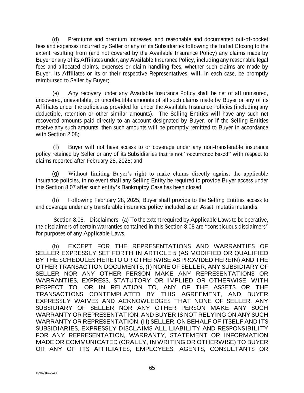 65 #99621647v43 (d) Premiums and premium increases, and reasonable and documented out-of-pocket fees and expenses incurred by Seller or any of its Subsidiaries following the Initial Closing to the extent resulting from (and not covered by the Available Insurance Policy) any claims made by Buyer or any of its Affiliates under, any Available Insurance Policy, including any reasonable legal fees and allocated claims, expenses or claim handling fees, whether such claims are made by Buyer, its Affiliates or its or their respective Representatives, will, in each case, be promptly reimbursed to Seller by Buyer; (e) Any recovery under any Available Insurance Policy shall be net of all uninsured, uncovered, unavailable, or uncollectible amounts of all such claims made by Buyer or any of its Affiliates under the policies as provided for under the Available Insurance Policies (including any deductible, retention or other similar amounts). The Selling Entities will have any such net recovered amounts paid directly to an account designated by Buyer, or if the Selling Entities receive any such amounts, then such amounts will be promptly remitted to Buyer in accordance with Section 2.08; (f) Buyer will not have access to or coverage under any non-transferable insurance policy retained by Seller or any of its Subsidiaries that is not “occurrence based” with respect to claims reported after February 28, 2025; and (g) Without limiting Buyer’s right to make claims directly against the applicable insurance policies, in no event shall any Selling Entity be required to provide Buyer access under this Section 8.07 after such entity’s Bankruptcy Case has been closed. (h) Following February 28, 2025, Buyer shall provide to the Selling Entities access to and coverage under any transferable insurance policy included as an Asset, mutatis mutandis. Section 8.08. Disclaimers. (a) To the extent required by Applicable Laws to be operative, the disclaimers of certain warranties contained in this Section 8.08 are “conspicuous disclaimers” for purposes of any Applicable Laws. (b) EXCEPT FOR THE REPRESENTATIONS AND WARRANTIES OF SELLER EXPRESSLY SET FORTH IN ARTICLE 5 (AS MODIFIED OR QUALIFIED BY THE SCHEDULES HERETO OR OTHERWISE AS PROVIDED HEREIN) AND THE OTHER TRANSACTION DOCUMENTS, (I) NONE OF SELLER, ANY SUBSIDIARY OF SELLER NOR ANY OTHER PERSON MAKE ANY REPRESENTATIONS OR WARRANTIES, EXPRESS, STATUTORY OR IMPLIED OR OTHERWISE, WITH RESPECT TO, OR IN RELATION TO, ANY OF THE ASSETS OR THE TRANSACTIONS CONTEMPLATED BY THIS AGREEMENT, AND BUYER EXPRESSLY WAIVES AND ACKNOWLEDGES THAT NONE OF SELLER, ANY SUBSIDIARY OF SELLER NOR ANY OTHER PERSON MAKE ANY SUCH WARRANTY OR REPRESENTATION, AND BUYER IS NOT RELYING ON ANY SUCH WARRANTY OR REPRESENTATION, (II) SELLER, ON BEHALF OF ITSELF AND ITS SUBSIDIARIES, EXPRESSLY DISCLAIMS ALL LIABILITY AND RESPONSIBILITY FOR ANY REPRESENTATION, WARRANTY, STATEMENT OR INFORMATION MADE OR COMMUNICATED (ORALLY, IN WRITING OR OTHERWISE) TO BUYER OR ANY OF ITS AFFILIATES, EMPLOYEES, AGENTS, CONSULTANTS OR
