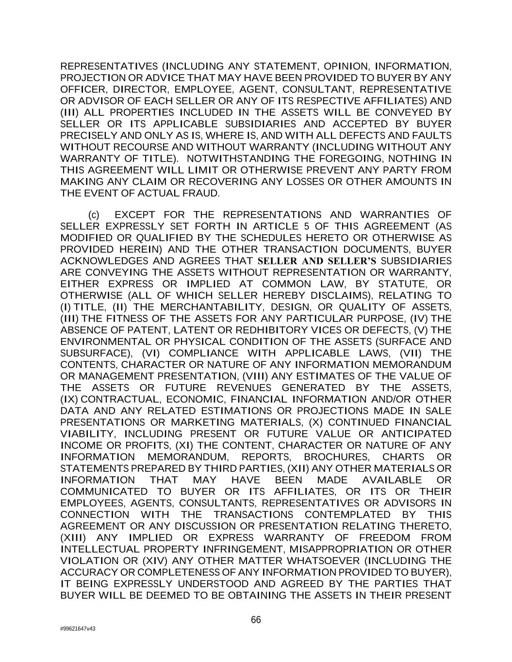 66 #99621647v43 REPRESENTATIVES (INCLUDING ANY STATEMENT, OPINION, INFORMATION, PROJECTION OR ADVICE THAT MAY HAVE BEEN PROVIDED TO BUYER BY ANY OFFICER, DIRECTOR, EMPLOYEE, AGENT, CONSULTANT, REPRESENTATIVE OR ADVISOR OF EACH SELLER OR ANY OF ITS RESPECTIVE AFFILIATES) AND (III) ALL PROPERTIES INCLUDED IN THE ASSETS WILL BE CONVEYED BY SELLER OR ITS APPLICABLE SUBSIDIARIES AND ACCEPTED BY BUYER PRECISELY AND ONLY AS IS, WHERE IS, AND WITH ALL DEFECTS AND FAULTS WITHOUT RECOURSE AND WITHOUT WARRANTY (INCLUDING WITHOUT ANY WARRANTY OF TITLE). NOTWITHSTANDING THE FOREGOING, NOTHING IN THIS AGREEMENT WILL LIMIT OR OTHERWISE PREVENT ANY PARTY FROM MAKING ANY CLAIM OR RECOVERING ANY LOSSES OR OTHER AMOUNTS IN THE EVENT OF ACTUAL FRAUD. (c) EXCEPT FOR THE REPRESENTATIONS AND WARRANTIES OF SELLER EXPRESSLY SET FORTH IN ARTICLE 5 OF THIS AGREEMENT (AS MODIFIED OR QUALIFIED BY THE SCHEDULES HERETO OR OTHERWISE AS PROVIDED HEREIN) AND THE OTHER TRANSACTION DOCUMENTS, BUYER ACKNOWLEDGES AND AGREES THAT SELLER AND SELLER’S SUBSIDIARIES ARE CONVEYING THE ASSETS WITHOUT REPRESENTATION OR WARRANTY, EITHER EXPRESS OR IMPLIED AT COMMON LAW, BY STATUTE, OR OTHERWISE (ALL OF WHICH SELLER HEREBY DISCLAIMS), RELATING TO (I) TITLE, (II) THE MERCHANTABILITY, DESIGN, OR QUALITY OF ASSETS, (III) THE FITNESS OF THE ASSETS FOR ANY PARTICULAR PURPOSE, (IV) THE ABSENCE OF PATENT, LATENT OR REDHIBITORY VICES OR DEFECTS, (V) THE ENVIRONMENTAL OR PHYSICAL CONDITION OF THE ASSETS (SURFACE AND SUBSURFACE), (VI) COMPLIANCE WITH APPLICABLE LAWS, (VII) THE CONTENTS, CHARACTER OR NATURE OF ANY INFORMATION MEMORANDUM OR MANAGEMENT PRESENTATION, (VIII) ANY ESTIMATES OF THE VALUE OF THE ASSETS OR FUTURE REVENUES GENERATED BY THE ASSETS, (IX) CONTRACTUAL, ECONOMIC, FINANCIAL INFORMATION AND/OR OTHER DATA AND ANY RELATED ESTIMATIONS OR PROJECTIONS MADE IN SALE PRESENTATIONS OR MARKETING MATERIALS, (X) CONTINUED FINANCIAL VIABILITY, INCLUDING PRESENT OR FUTURE VALUE OR ANTICIPATED INCOME OR PROFITS, (XI) THE CONTENT, CHARACTER OR NATURE OF ANY INFORMATION MEMORANDUM, REPORTS, BROCHURES, CHARTS OR STATEMENTS PREPARED BY THIRD PARTIES, (XII) ANY OTHER MATERIALS OR INFORMATION THAT MAY HAVE BEEN MADE AVAILABLE OR COMMUNICATED TO BUYER OR ITS AFFILIATES, OR ITS OR THEIR EMPLOYEES, AGENTS, CONSULTANTS, REPRESENTATIVES OR ADVISORS IN CONNECTION WITH THE TRANSACTIONS CONTEMPLATED BY THIS AGREEMENT OR ANY DISCUSSION OR PRESENTATION RELATING THERETO, (XIII) ANY IMPLIED OR EXPRESS WARRANTY OF FREEDOM FROM INTELLECTUAL PROPERTY INFRINGEMENT, MISAPPROPRIATION OR OTHER VIOLATION OR (XIV) ANY OTHER MATTER WHATSOEVER (INCLUDING THE ACCURACY OR COMPLETENESS OF ANY INFORMATION PROVIDED TO BUYER), IT BEING EXPRESSLY UNDERSTOOD AND AGREED BY THE PARTIES THAT BUYER WILL BE DEEMED TO BE OBTAINING THE ASSETS IN THEIR PRESENT