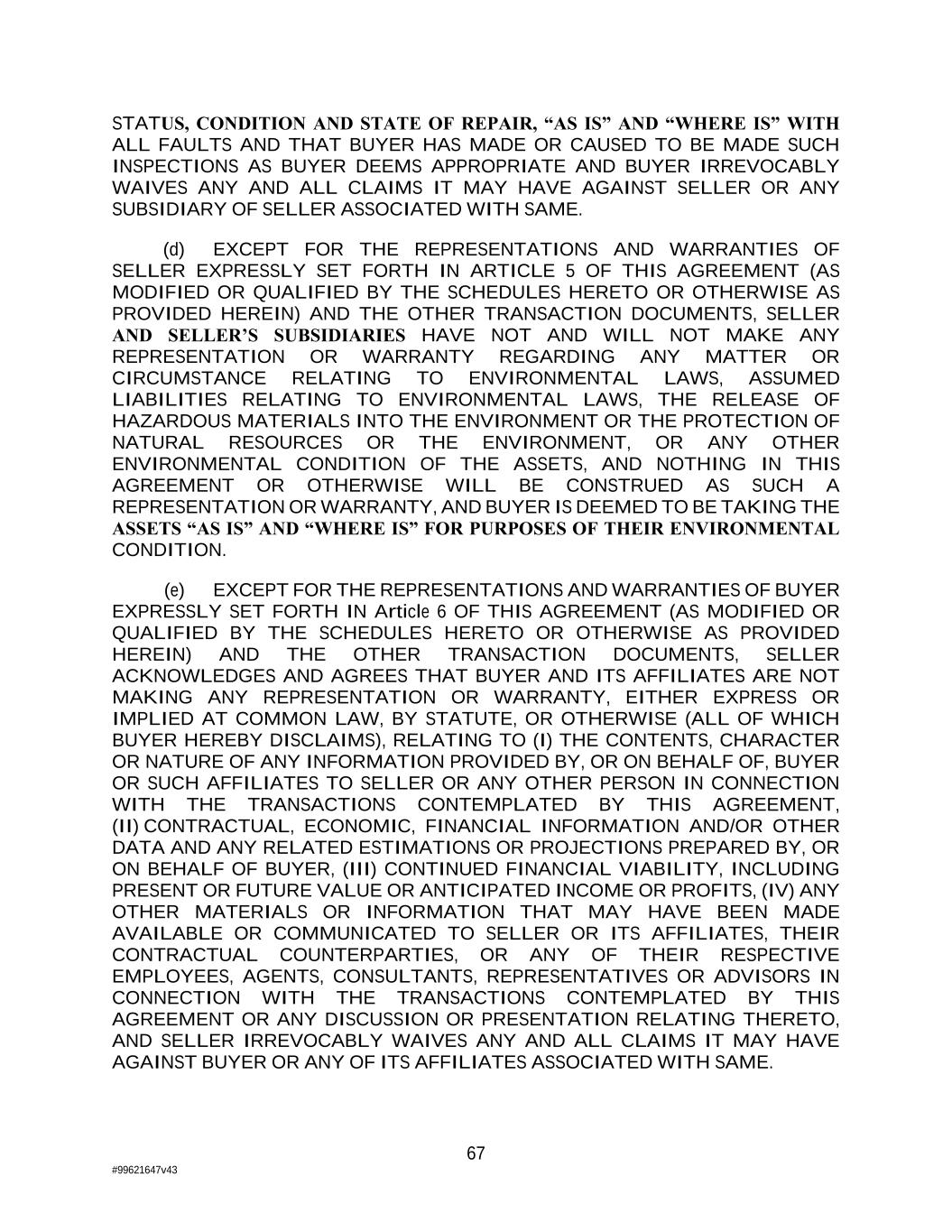 67 #99621647v43 STATUS, CONDITION AND STATE OF REPAIR, “AS IS” AND “WHERE IS” WITH ALL FAULTS AND THAT BUYER HAS MADE OR CAUSED TO BE MADE SUCH INSPECTIONS AS BUYER DEEMS APPROPRIATE AND BUYER IRREVOCABLY WAIVES ANY AND ALL CLAIMS IT MAY HAVE AGAINST SELLER OR ANY SUBSIDIARY OF SELLER ASSOCIATED WITH SAME. (d) EXCEPT FOR THE REPRESENTATIONS AND WARRANTIES OF SELLER EXPRESSLY SET FORTH IN ARTICLE 5 OF THIS AGREEMENT (AS MODIFIED OR QUALIFIED BY THE SCHEDULES HERETO OR OTHERWISE AS PROVIDED HEREIN) AND THE OTHER TRANSACTION DOCUMENTS, SELLER AND SELLER’S SUBSIDIARIES HAVE NOT AND WILL NOT MAKE ANY REPRESENTATION OR WARRANTY REGARDING ANY MATTER OR CIRCUMSTANCE RELATING TO ENVIRONMENTAL LAWS, ASSUMED LIABILITIES RELATING TO ENVIRONMENTAL LAWS, THE RELEASE OF HAZARDOUS MATERIALS INTO THE ENVIRONMENT OR THE PROTECTION OF NATURAL RESOURCES OR THE ENVIRONMENT, OR ANY OTHER ENVIRONMENTAL CONDITION OF THE ASSETS, AND NOTHING IN THIS AGREEMENT OR OTHERWISE WILL BE CONSTRUED AS SUCH A REPRESENTATION OR WARRANTY, AND BUYER IS DEEMED TO BE TAKING THE ASSETS “AS IS” AND “WHERE IS” FOR PURPOSES OF THEIR ENVIRONMENTAL CONDITION. (e) EXCEPT FOR THE REPRESENTATIONS AND WARRANTIES OF BUYER EXPRESSLY SET FORTH IN Article 6 OF THIS AGREEMENT (AS MODIFIED OR QUALIFIED BY THE SCHEDULES HERETO OR OTHERWISE AS PROVIDED HEREIN) AND THE OTHER TRANSACTION DOCUMENTS, SELLER ACKNOWLEDGES AND AGREES THAT BUYER AND ITS AFFILIATES ARE NOT MAKING ANY REPRESENTATION OR WARRANTY, EITHER EXPRESS OR IMPLIED AT COMMON LAW, BY STATUTE, OR OTHERWISE (ALL OF WHICH BUYER HEREBY DISCLAIMS), RELATING TO (I) THE CONTENTS, CHARACTER OR NATURE OF ANY INFORMATION PROVIDED BY, OR ON BEHALF OF, BUYER OR SUCH AFFILIATES TO SELLER OR ANY OTHER PERSON IN CONNECTION WITH THE TRANSACTIONS CONTEMPLATED BY THIS AGREEMENT, (II) CONTRACTUAL, ECONOMIC, FINANCIAL INFORMATION AND/OR OTHER DATA AND ANY RELATED ESTIMATIONS OR PROJECTIONS PREPARED BY, OR ON BEHALF OF BUYER, (III) CONTINUED FINANCIAL VIABILITY, INCLUDING PRESENT OR FUTURE VALUE OR ANTICIPATED INCOME OR PROFITS, (IV) ANY OTHER MATERIALS OR INFORMATION THAT MAY HAVE BEEN MADE AVAILABLE OR COMMUNICATED TO SELLER OR ITS AFFILIATES, THEIR CONTRACTUAL COUNTERPARTIES, OR ANY OF THEIR RESPECTIVE EMPLOYEES, AGENTS, CONSULTANTS, REPRESENTATIVES OR ADVISORS IN CONNECTION WITH THE TRANSACTIONS CONTEMPLATED BY THIS AGREEMENT OR ANY DISCUSSION OR PRESENTATION RELATING THERETO, AND SELLER IRREVOCABLY WAIVES ANY AND ALL CLAIMS IT MAY HAVE AGAINST BUYER OR ANY OF ITS AFFILIATES ASSOCIATED WITH SAME.