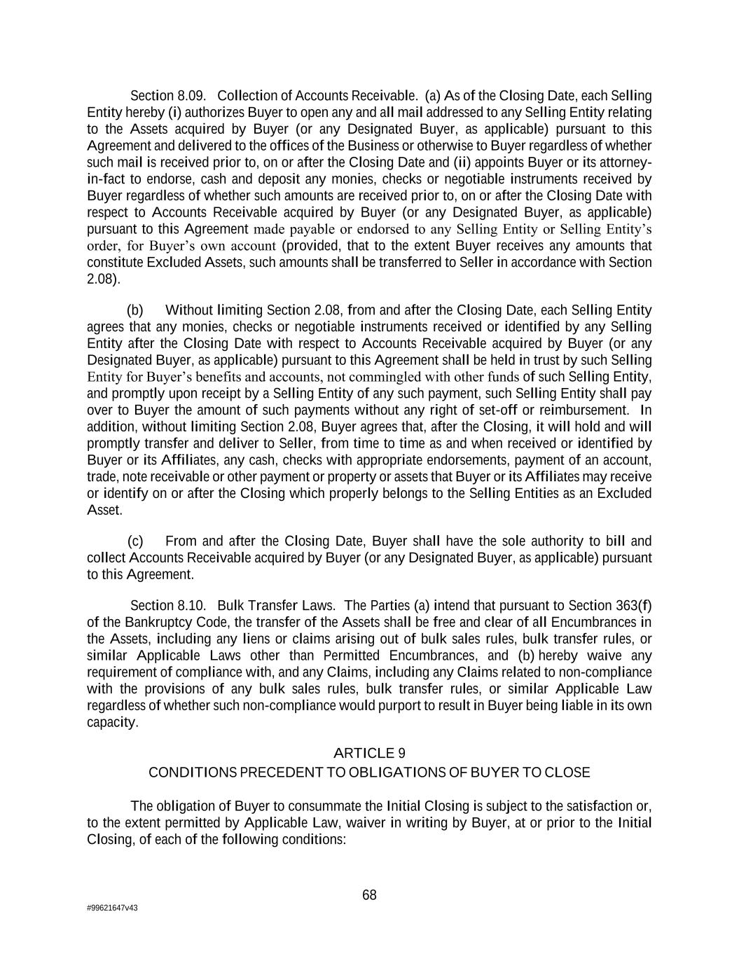 68 #99621647v43 Section 8.09. Collection of Accounts Receivable. (a) As of the Closing Date, each Selling Entity hereby (i) authorizes Buyer to open any and all mail addressed to any Selling Entity relating to the Assets acquired by Buyer (or any Designated Buyer, as applicable) pursuant to this Agreement and delivered to the offices of the Business or otherwise to Buyer regardless of whether such mail is received prior to, on or after the Closing Date and (ii) appoints Buyer or its attorney- in-fact to endorse, cash and deposit any monies, checks or negotiable instruments received by Buyer regardless of whether such amounts are received prior to, on or after the Closing Date with respect to Accounts Receivable acquired by Buyer (or any Designated Buyer, as applicable) pursuant to this Agreement made payable or endorsed to any Selling Entity or Selling Entity’s order, for Buyer’s own account (provided, that to the extent Buyer receives any amounts that constitute Excluded Assets, such amounts shall be transferred to Seller in accordance with Section 2.08). (b) Without limiting Section 2.08, from and after the Closing Date, each Selling Entity agrees that any monies, checks or negotiable instruments received or identified by any Selling Entity after the Closing Date with respect to Accounts Receivable acquired by Buyer (or any Designated Buyer, as applicable) pursuant to this Agreement shall be held in trust by such Selling Entity for Buyer’s benefits and accounts, not commingled with other funds of such Selling Entity, and promptly upon receipt by a Selling Entity of any such payment, such Selling Entity shall pay over to Buyer the amount of such payments without any right of set-off or reimbursement. In addition, without limiting Section 2.08, Buyer agrees that, after the Closing, it will hold and will promptly transfer and deliver to Seller, from time to time as and when received or identified by Buyer or its Affiliates, any cash, checks with appropriate endorsements, payment of an account, trade, note receivable or other payment or property or assets that Buyer or its Affiliates may receive or identify on or after the Closing which properly belongs to the Selling Entities as an Excluded Asset. (c) From and after the Closing Date, Buyer shall have the sole authority to bill and collect Accounts Receivable acquired by Buyer (or any Designated Buyer, as applicable) pursuant to this Agreement. Section 8.10. Bulk Transfer Laws. The Parties (a) intend that pursuant to Section 363(f) of the Bankruptcy Code, the transfer of the Assets shall be free and clear of all Encumbrances in the Assets, including any liens or claims arising out of bulk sales rules, bulk transfer rules, or similar Applicable Laws other than Permitted Encumbrances, and (b) hereby waive any requirement of compliance with, and any Claims, including any Claims related to non-compliance with the provisions of any bulk sales rules, bulk transfer rules, or similar Applicable Law regardless of whether such non-compliance would purport to result in Buyer being liable in its own capacity. ARTICLE 9 CONDITIONS PRECEDENT TO OBLIGATIONS OF BUYER TO CLOSE The obligation of Buyer to consummate the Initial Closing is subject to the satisfaction or, to the extent permitted by Applicable Law, waiver in writing by Buyer, at or prior to the Initial Closing, of each of the following conditions: