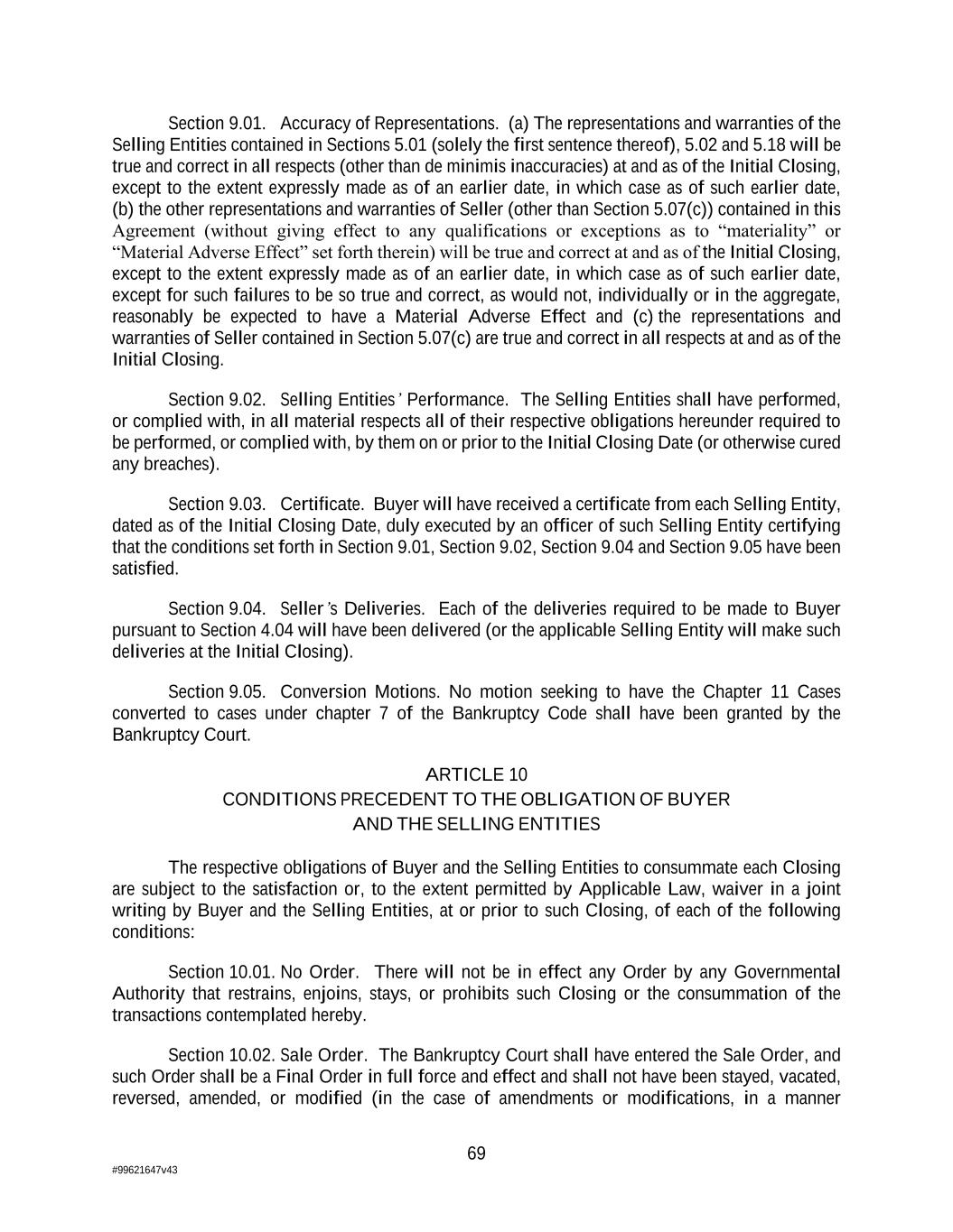 69 #99621647v43 Section 9.01. Accuracy of Representations. (a) The representations and warranties of the Selling Entities contained in Sections 5.01 (solely the first sentence thereof), 5.02 and 5.18 will be true and correct in all respects (other than de minimis inaccuracies) at and as of the Initial Closing, except to the extent expressly made as of an earlier date, in which case as of such earlier date, (b) the other representations and warranties of Seller (other than Section 5.07(c)) contained in this Agreement (without giving effect to any qualifications or exceptions as to “materiality” or “Material Adverse Effect” set forth therein) will be true and correct at and as of the Initial Closing, except to the extent expressly made as of an earlier date, in which case as of such earlier date, except for such failures to be so true and correct, as would not, individually or in the aggregate, reasonably be expected to have a Material Adverse Effect and (c) the representations and warranties of Seller contained in Section 5.07(c) are true and correct in all respects at and as of the Initial Closing. Section 9.02. Selling Entities’ Performance. The Selling Entities shall have performed, or complied with, in all material respects all of their respective obligations hereunder required to be performed, or complied with, by them on or prior to the Initial Closing Date (or otherwise cured any breaches). Section 9.03. Certificate. Buyer will have received a certificate from each Selling Entity, dated as of the Initial Closing Date, duly executed by an officer of such Selling Entity certifying that the conditions set forth in Section 9.01, Section 9.02, Section 9.04 and Section 9.05 have been satisfied. Section 9.04. Seller’s Deliveries. Each of the deliveries required to be made to Buyer pursuant to Section 4.04 will have been delivered (or the applicable Selling Entity will make such deliveries at the Initial Closing). Section 9.05. Conversion Motions. No motion seeking to have the Chapter 11 Cases converted to cases under chapter 7 of the Bankruptcy Code shall have been granted by the Bankruptcy Court. ARTICLE 10 CONDITIONS PRECEDENT TO THE OBLIGATION OF BUYER AND THE SELLING ENTITIES The respective obligations of Buyer and the Selling Entities to consummate each Closing are subject to the satisfaction or, to the extent permitted by Applicable Law, waiver in a joint writing by Buyer and the Selling Entities, at or prior to such Closing, of each of the following conditions: Section 10.01. No Order. There will not be in effect any Order by any Governmental Authority that restrains, enjoins, stays, or prohibits such Closing or the consummation of the transactions contemplated hereby. Section 10.02. Sale Order. The Bankruptcy Court shall have entered the Sale Order, and such Order shall be a Final Order in full force and effect and shall not have been stayed, vacated, reversed, amended, or modified (in the case of amendments or modifications, in a manner