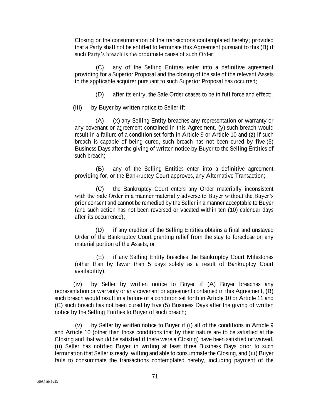 71 #99621647v43 Closing or the consummation of the transactions contemplated hereby; provided that a Party shall not be entitled to terminate this Agreement pursuant to this (B) if such Party’s breach is the proximate cause of such Order; (C) any of the Selling Entities enter into a definitive agreement providing for a Superior Proposal and the closing of the sale of the relevant Assets to the applicable acquirer pursuant to such Superior Proposal has occurred; (D) after its entry, the Sale Order ceases to be in full force and effect; (iii) by Buyer by written notice to Seller if: (A) (x) any Selling Entity breaches any representation or warranty or any covenant or agreement contained in this Agreement, (y) such breach would result in a failure of a condition set forth in Article 9 or Article 10 and (z) if such breach is capable of being cured, such breach has not been cured by five (5) Business Days after the giving of written notice by Buyer to the Selling Entities of such breach; (B) any of the Selling Entities enter into a definitive agreement providing for, or the Bankruptcy Court approves, any Alternative Transaction; (C) the Bankruptcy Court enters any Order materially inconsistent with the Sale Order in a manner materially adverse to Buyer without the Buyer’s prior consent and cannot be remedied by the Seller in a manner acceptable to Buyer (and such action has not been reversed or vacated within ten (10) calendar days after its occurrence); (D) if any creditor of the Selling Entities obtains a final and unstayed Order of the Bankruptcy Court granting relief from the stay to foreclose on any material portion of the Assets; or (E) if any Selling Entity breaches the Bankruptcy Court Milestones (other than by fewer than 5 days solely as a result of Bankruptcy Court availability). (iv) by Seller by written notice to Buyer if (A) Buyer breaches any representation or warranty or any covenant or agreement contained in this Agreement, (B) such breach would result in a failure of a condition set forth in Article 10 or Article 11 and (C) such breach has not been cured by five (5) Business Days after the giving of written notice by the Selling Entities to Buyer of such breach; (v) by Seller by written notice to Buyer if (i) all of the conditions in Article 9 and Article 10 (other than those conditions that by their nature are to be satisfied at the Closing and that would be satisfied if there were a Closing) have been satisfied or waived, (ii) Seller has notified Buyer in writing at least three Business Days prior to such termination that Seller is ready, willing and able to consummate the Closing, and (iii) Buyer fails to consummate the transactions contemplated hereby, including payment of the