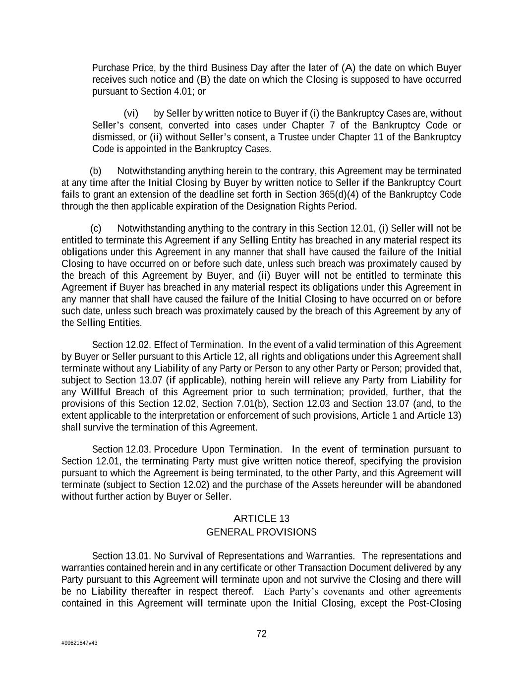 72 #99621647v43 Purchase Price, by the third Business Day after the later of (A) the date on which Buyer receives such notice and (B) the date on which the Closing is supposed to have occurred pursuant to Section 4.01; or (vi) by Seller by written notice to Buyer if (i) the Bankruptcy Cases are, without Seller’s consent, converted into cases under Chapter 7 of the Bankruptcy Code or dismissed, or (ii) without Seller’s consent, a Trustee under Chapter 11 of the Bankruptcy Code is appointed in the Bankruptcy Cases. (b) Notwithstanding anything herein to the contrary, this Agreement may be terminated at any time after the Initial Closing by Buyer by written notice to Seller if the Bankruptcy Court fails to grant an extension of the deadline set forth in Section 365(d)(4) of the Bankruptcy Code through the then applicable expiration of the Designation Rights Period. (c) Notwithstanding anything to the contrary in this Section 12.01, (i) Seller will not be entitled to terminate this Agreement if any Selling Entity has breached in any material respect its obligations under this Agreement in any manner that shall have caused the failure of the Initial Closing to have occurred on or before such date, unless such breach was proximately caused by the breach of this Agreement by Buyer, and (ii) Buyer will not be entitled to terminate this Agreement if Buyer has breached in any material respect its obligations under this Agreement in any manner that shall have caused the failure of the Initial Closing to have occurred on or before such date, unless such breach was proximately caused by the breach of this Agreement by any of the Selling Entities. Section 12.02. Effect of Termination. In the event of a valid termination of this Agreement by Buyer or Seller pursuant to this Article 12, all rights and obligations under this Agreement shall terminate without any Liability of any Party or Person to any other Party or Person; provided that, subject to Section 13.07 (if applicable), nothing herein will relieve any Party from Liability for any Willful Breach of this Agreement prior to such termination; provided, further, that the provisions of this Section 12.02, Section 7.01(b), Section 12.03 and Section 13.07 (and, to the extent applicable to the interpretation or enforcement of such provisions, Article 1 and Article 13) shall survive the termination of this Agreement. Section 12.03. Procedure Upon Termination. In the event of termination pursuant to Section 12.01, the terminating Party must give written notice thereof, specifying the provision pursuant to which the Agreement is being terminated, to the other Party, and this Agreement will terminate (subject to Section 12.02) and the purchase of the Assets hereunder will be abandoned without further action by Buyer or Seller. ARTICLE 13 GENERAL PROVISIONS Section 13.01. No Survival of Representations and Warranties. The representations and warranties contained herein and in any certificate or other Transaction Document delivered by any Party pursuant to this Agreement will terminate upon and not survive the Closing and there will be no Liability thereafter in respect thereof. Each Party’s covenants and other agreements contained in this Agreement will terminate upon the Initial Closing, except the Post-Closing