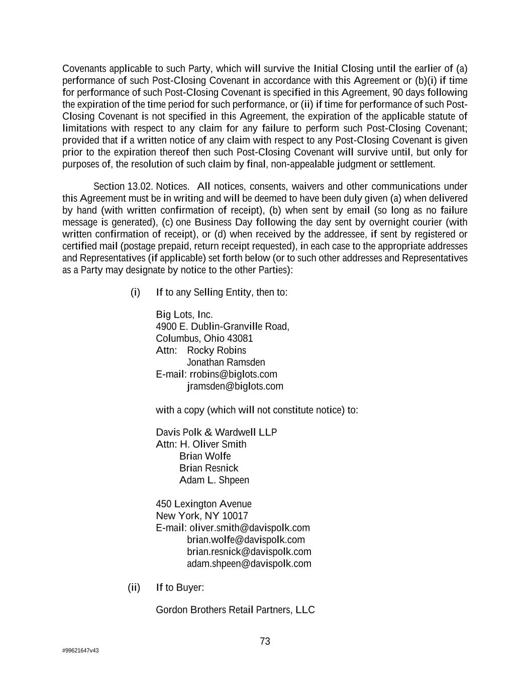 73 #99621647v43 Covenants applicable to such Party, which will survive the Initial Closing until the earlier of (a) performance of such Post-Closing Covenant in accordance with this Agreement or (b)(i) if time for performance of such Post-Closing Covenant is specified in this Agreement, 90 days following the expiration of the time period for such performance, or (ii) if time for performance of such Post- Closing Covenant is not specified in this Agreement, the expiration of the applicable statute of limitations with respect to any claim for any failure to perform such Post-Closing Covenant; provided that if a written notice of any claim with respect to any Post-Closing Covenant is given prior to the expiration thereof then such Post-Closing Covenant will survive until, but only for purposes of, the resolution of such claim by final, non-appealable judgment or settlement. Section 13.02. Notices. All notices, consents, waivers and other communications under this Agreement must be in writing and will be deemed to have been duly given (a) when delivered by hand (with written confirmation of receipt), (b) when sent by email (so long as no failure message is generated), (c) one Business Day following the day sent by overnight courier (with written confirmation of receipt), or (d) when received by the addressee, if sent by registered or certified mail (postage prepaid, return receipt requested), in each case to the appropriate addresses and Representatives (if applicable) set forth below (or to such other addresses and Representatives as a Party may designate by notice to the other Parties): (i) If to any Selling Entity, then to: Big Lots, Inc. 4900 E. Dublin-Granville Road, Columbus, Ohio 43081 Attn: Rocky Robins Jonathan Ramsden E-mail: rrobins@biglots.com jramsden@biglots.com with a copy (which will not constitute notice) to: Davis Polk & Wardwell LLP Attn: H. Oliver Smith Brian Wolfe Brian Resnick Adam L. Shpeen 450 Lexington Avenue New York, NY 10017 E-mail: oliver.smith@davispolk.com brian.wolfe@davispolk.com brian.resnick@davispolk.com adam.shpeen@davispolk.com (ii) If to Buyer: Gordon Brothers Retail Partners, LLC