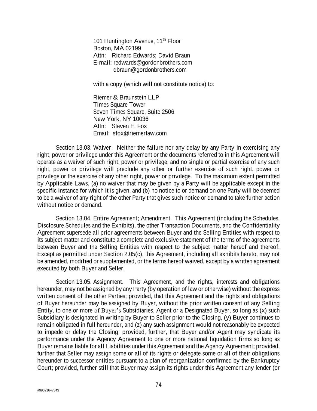74 #99621647v43 101 Huntington Avenue, 11th Floor Boston, MA 02199 Attn: Richard Edwards; David Braun E-mail: redwards@gordonbrothers.com dbraun@gordonbrothers.com with a copy (which will not constitute notice) to: Riemer & Braunstein LLP Times Square Tower Seven Times Square, Suite 2506 New York, NY 10036 Attn: Steven E. Fox Email: sfox@riemerlaw.com Section 13.03. Waiver. Neither the failure nor any delay by any Party in exercising any right, power or privilege under this Agreement or the documents referred to in this Agreement will operate as a waiver of such right, power or privilege, and no single or partial exercise of any such right, power or privilege will preclude any other or further exercise of such right, power or privilege or the exercise of any other right, power or privilege. To the maximum extent permitted by Applicable Laws, (a) no waiver that may be given by a Party will be applicable except in the specific instance for which it is given, and (b) no notice to or demand on one Party will be deemed to be a waiver of any right of the other Party that gives such notice or demand to take further action without notice or demand. Section 13.04. Entire Agreement; Amendment. This Agreement (including the Schedules, Disclosure Schedules and the Exhibits), the other Transaction Documents, and the Confidentiality Agreement supersede all prior agreements between Buyer and the Selling Entities with respect to its subject matter and constitute a complete and exclusive statement of the terms of the agreements between Buyer and the Selling Entities with respect to the subject matter hereof and thereof. Except as permitted under Section 2.05(c), this Agreement, including all exhibits hereto, may not be amended, modified or supplemented, or the terms hereof waived, except by a written agreement executed by both Buyer and Seller. Section 13.05. Assignment. This Agreement, and the rights, interests and obligations hereunder, may not be assigned by any Party (by operation of law or otherwise) without the express written consent of the other Parties; provided, that this Agreement and the rights and obligations of Buyer hereunder may be assigned by Buyer, without the prior written consent of any Selling Entity, to one or more of Buyer’s Subsidiaries, Agent or a Designated Buyer, so long as (x) such Subsidiary is designated in writing by Buyer to Seller prior to the Closing, (y) Buyer continues to remain obligated in full hereunder, and (z) any such assignment would not reasonably be expected to impede or delay the Closing; provided, further, that Buyer and/or Agent may syndicate its performance under the Agency Agreement to one or more national liquidation firms so long as Buyer remains liable for all Liabilities under this Agreement and the Agency Agreement; provided, further that Seller may assign some or all of its rights or delegate some or all of their obligations hereunder to successor entities pursuant to a plan of reorganization confirmed by the Bankruptcy Court; provided, further still that Buyer may assign its rights under this Agreement any lender (or