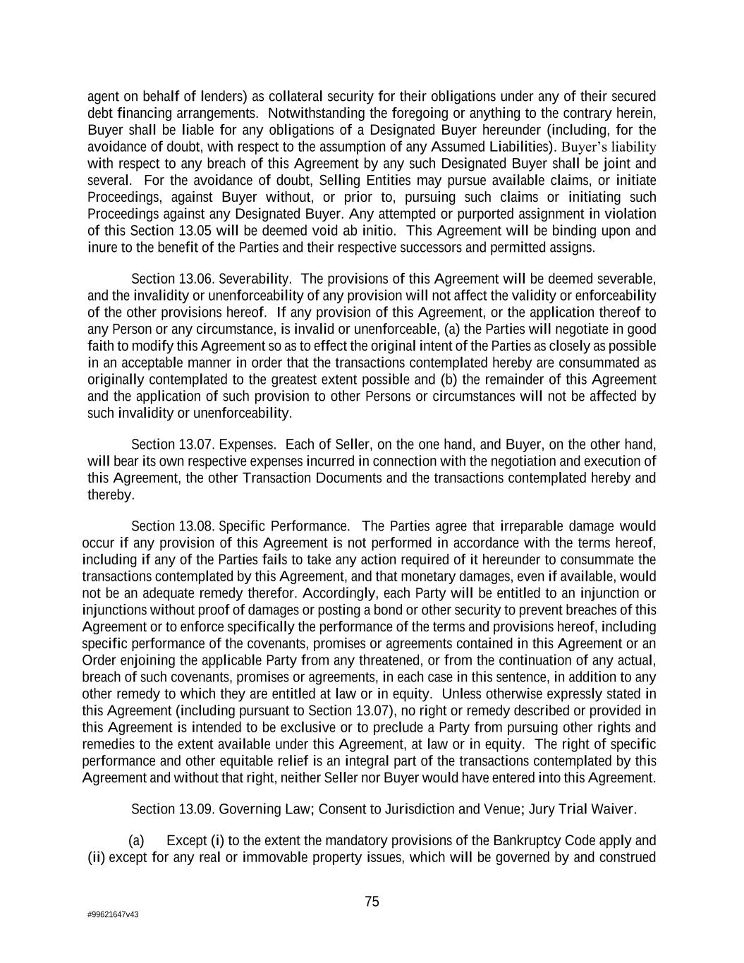 75 #99621647v43 agent on behalf of lenders) as collateral security for their obligations under any of their secured debt financing arrangements. Notwithstanding the foregoing or anything to the contrary herein, Buyer shall be liable for any obligations of a Designated Buyer hereunder (including, for the avoidance of doubt, with respect to the assumption of any Assumed Liabilities). Buyer’s liability with respect to any breach of this Agreement by any such Designated Buyer shall be joint and several. For the avoidance of doubt, Selling Entities may pursue available claims, or initiate Proceedings, against Buyer without, or prior to, pursuing such claims or initiating such Proceedings against any Designated Buyer. Any attempted or purported assignment in violation of this Section 13.05 will be deemed void ab initio. This Agreement will be binding upon and inure to the benefit of the Parties and their respective successors and permitted assigns. Section 13.06. Severability. The provisions of this Agreement will be deemed severable, and the invalidity or unenforceability of any provision will not affect the validity or enforceability of the other provisions hereof. If any provision of this Agreement, or the application thereof to any Person or any circumstance, is invalid or unenforceable, (a) the Parties will negotiate in good faith to modify this Agreement so as to effect the original intent of the Parties as closely as possible in an acceptable manner in order that the transactions contemplated hereby are consummated as originally contemplated to the greatest extent possible and (b) the remainder of this Agreement and the application of such provision to other Persons or circumstances will not be affected by such invalidity or unenforceability. Section 13.07. Expenses. Each of Seller, on the one hand, and Buyer, on the other hand, will bear its own respective expenses incurred in connection with the negotiation and execution of this Agreement, the other Transaction Documents and the transactions contemplated hereby and thereby. Section 13.08. Specific Performance. The Parties agree that irreparable damage would occur if any provision of this Agreement is not performed in accordance with the terms hereof, including if any of the Parties fails to take any action required of it hereunder to consummate the transactions contemplated by this Agreement, and that monetary damages, even if available, would not be an adequate remedy therefor. Accordingly, each Party will be entitled to an injunction or injunctions without proof of damages or posting a bond or other security to prevent breaches of this Agreement or to enforce specifically the performance of the terms and provisions hereof, including specific performance of the covenants, promises or agreements contained in this Agreement or an Order enjoining the applicable Party from any threatened, or from the continuation of any actual, breach of such covenants, promises or agreements, in each case in this sentence, in addition to any other remedy to which they are entitled at law or in equity. Unless otherwise expressly stated in this Agreement (including pursuant to Section 13.07), no right or remedy described or provided in this Agreement is intended to be exclusive or to preclude a Party from pursuing other rights and remedies to the extent available under this Agreement, at law or in equity. The right of specific performance and other equitable relief is an integral part of the transactions contemplated by this Agreement and without that right, neither Seller nor Buyer would have entered into this Agreement. Section 13.09. Governing Law; Consent to Jurisdiction and Venue; Jury Trial Waiver. (a) Except (i) to the extent the mandatory provisions of the Bankruptcy Code apply and (ii) except for any real or immovable property issues, which will be governed by and construed