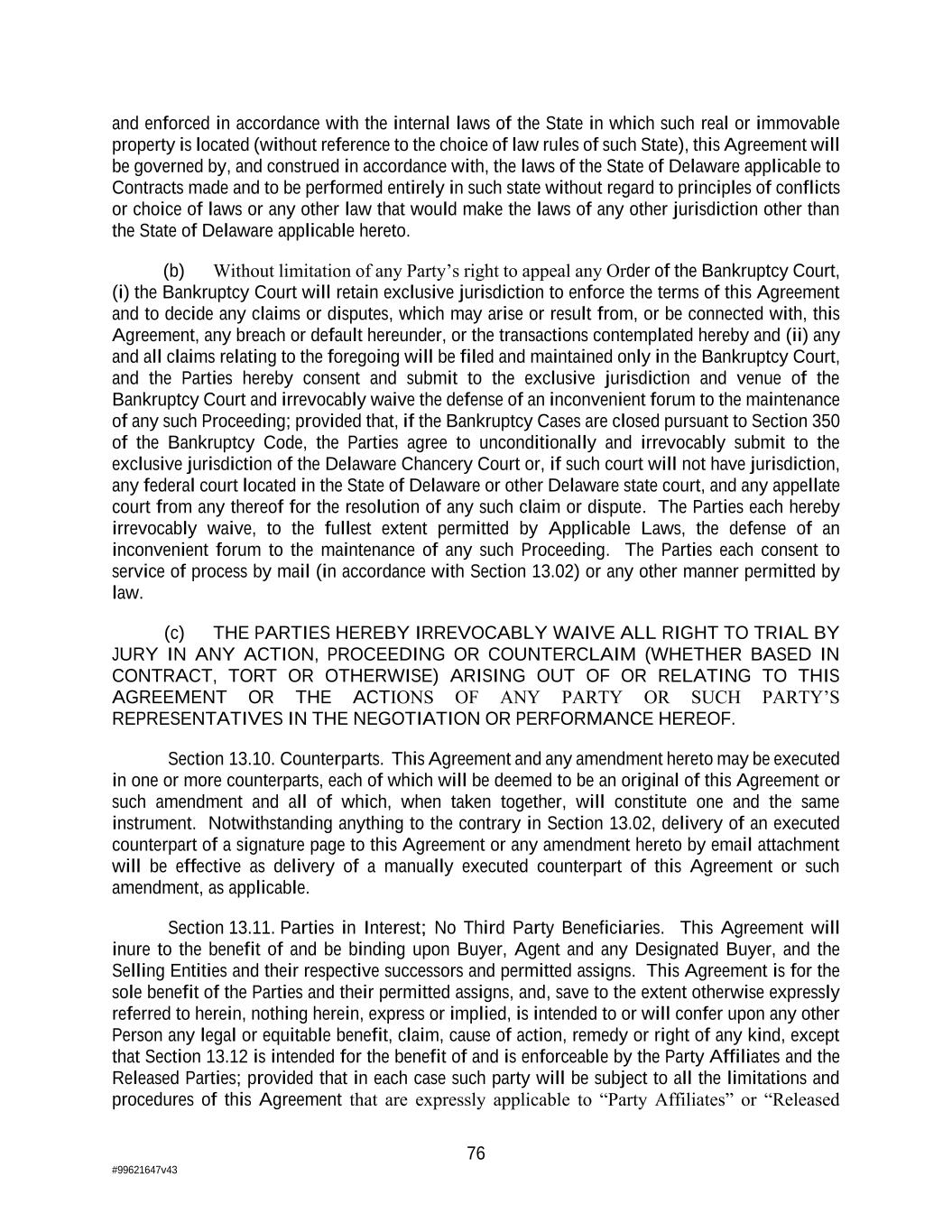 76 #99621647v43 and enforced in accordance with the internal laws of the State in which such real or immovable property is located (without reference to the choice of law rules of such State), this Agreement will be governed by, and construed in accordance with, the laws of the State of Delaware applicable to Contracts made and to be performed entirely in such state without regard to principles of conflicts or choice of laws or any other law that would make the laws of any other jurisdiction other than the State of Delaware applicable hereto. (b) Without limitation of any Party’s right to appeal any Order of the Bankruptcy Court, (i) the Bankruptcy Court will retain exclusive jurisdiction to enforce the terms of this Agreement and to decide any claims or disputes, which may arise or result from, or be connected with, this Agreement, any breach or default hereunder, or the transactions contemplated hereby and (ii) any and all claims relating to the foregoing will be filed and maintained only in the Bankruptcy Court, and the Parties hereby consent and submit to the exclusive jurisdiction and venue of the Bankruptcy Court and irrevocably waive the defense of an inconvenient forum to the maintenance of any such Proceeding; provided that, if the Bankruptcy Cases are closed pursuant to Section 350 of the Bankruptcy Code, the Parties agree to unconditionally and irrevocably submit to the exclusive jurisdiction of the Delaware Chancery Court or, if such court will not have jurisdiction, any federal court located in the State of Delaware or other Delaware state court, and any appellate court from any thereof for the resolution of any such claim or dispute. The Parties each hereby irrevocably waive, to the fullest extent permitted by Applicable Laws, the defense of an inconvenient forum to the maintenance of any such Proceeding. The Parties each consent to service of process by mail (in accordance with Section 13.02) or any other manner permitted by law. (c) THE PARTIES HEREBY IRREVOCABLY WAIVE ALL RIGHT TO TRIAL BY JURY IN ANY ACTION, PROCEEDING OR COUNTERCLAIM (WHETHER BASED IN CONTRACT, TORT OR OTHERWISE) ARISING OUT OF OR RELATING TO THIS AGREEMENT OR THE ACTIONS OF ANY PARTY OR SUCH PARTY’S REPRESENTATIVES IN THE NEGOTIATION OR PERFORMANCE HEREOF. Section 13.10. Counterparts. This Agreement and any amendment hereto may be executed in one or more counterparts, each of which will be deemed to be an original of this Agreement or such amendment and all of which, when taken together, will constitute one and the same instrument. Notwithstanding anything to the contrary in Section 13.02, delivery of an executed counterpart of a signature page to this Agreement or any amendment hereto by email attachment will be effective as delivery of a manually executed counterpart of this Agreement or such amendment, as applicable. Section 13.11. Parties in Interest; No Third Party Beneficiaries. This Agreement will inure to the benefit of and be binding upon Buyer, Agent and any Designated Buyer, and the Selling Entities and their respective successors and permitted assigns. This Agreement is for the sole benefit of the Parties and their permitted assigns, and, save to the extent otherwise expressly referred to herein, nothing herein, express or implied, is intended to or will confer upon any other Person any legal or equitable benefit, claim, cause of action, remedy or right of any kind, except that Section 13.12 is intended for the benefit of and is enforceable by the Party Affiliates and the Released Parties; provided that in each case such party will be subject to all the limitations and procedures of this Agreement that are expressly applicable to “Party Affiliates” or “Released