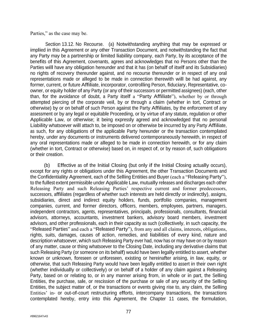 77 #99621647v43 Parties,” as the case may be. Section 13.12. No Recourse. (a) Notwithstanding anything that may be expressed or implied in this Agreement or any other Transaction Document, and notwithstanding the fact that any Party may be a partnership or limited liability company, each Party, by its acceptance of the benefits of this Agreement, covenants, agrees and acknowledges that no Persons other than the Parties will have any obligation hereunder and that it has (on behalf of itself and its Subsidiaries) no rights of recovery thereunder against, and no recourse thereunder or in respect of any oral representations made or alleged to be made in connection therewith will be had against, any former, current, or future Affiliate, incorporator, controlling Person, fiduciary, Representative, co- owner, or equity holder of any Party (or any of their successors or permitted assignees) (each, other than, for the avoidance of doubt, a Party itself a “Party Affiliate”), whether by or through attempted piercing of the corporate veil, by or through a claim (whether in tort, Contract or otherwise) by or on behalf of such Person against the Party Affiliates, by the enforcement of any assessment or by any legal or equitable Proceeding, or by virtue of any statute, regulation or other Applicable Law, or otherwise; it being expressly agreed and acknowledged that no personal Liability whatsoever will attach to, be imposed on or otherwise be incurred by any Party Affiliate, as such, for any obligations of the applicable Party hereunder or the transaction contemplated hereby, under any documents or instruments delivered contemporaneously herewith, in respect of any oral representations made or alleged to be made in connection herewith, or for any claim (whether in tort, Contract or otherwise) based on, in respect of, or by reason of, such obligations or their creation. (b) Effective as of the Initial Closing (but only if the Initial Closing actually occurs), except for any rights or obligations under this Agreement, the other Transaction Documents and the Confidentiality Agreement, each of the Selling Entities and Buyer (each a “Releasing Party”), to the fullest extent permissible under Applicable Law, mutually releases and discharges each other Releasing Party and such Releasing Parties’ respective current and former predecessors, successors, affiliates (regardless of whether such interests are held directly or indirectly), assigns, subsidiaries, direct and indirect equity holders, funds, portfolio companies, management companies, current, and former directors, officers, members, employees, partners, managers, independent contractors, agents, representatives, principals, professionals, consultants, financial advisors, attorneys, accountants, investment bankers, advisory board members, investment advisors, and other professionals, each in their capacity as such (collectively, in such capacity, the “Released Parties” and each a “Released Party”), from any and all claims, interests, obligations, rights, suits, damages, causes of action, remedies, and liabilities of every kind, nature and description whatsoever, which such Releasing Party ever had, now has or may have on or by reason of any matter, cause or thing whatsoever to the Closing Date, including any derivative claims that such Releasing Party (or someone on its behalf) would have been legally entitled to assert, whether known or unknown, foreseen or unforeseen, existing or hereinafter arising, in law, equity, or otherwise, that such Releasing Party would have been legally entitled to assert in their own right (whether individually or collectively) or on behalf of a holder of any claim against a Releasing Party, based on or relating to, or in any manner arising from, in whole or in part, the Selling Entities, the purchase, sale, or rescission of the purchase or sale of any security of the Selling Entities, the subject matter of, or the transactions or events giving rise to, any claim, the Selling Entities’ in- or out-of-court restructuring efforts, intercompany transactions, the transactions contemplated hereby, entry into this Agreement, the Chapter 11 cases, the formulation,