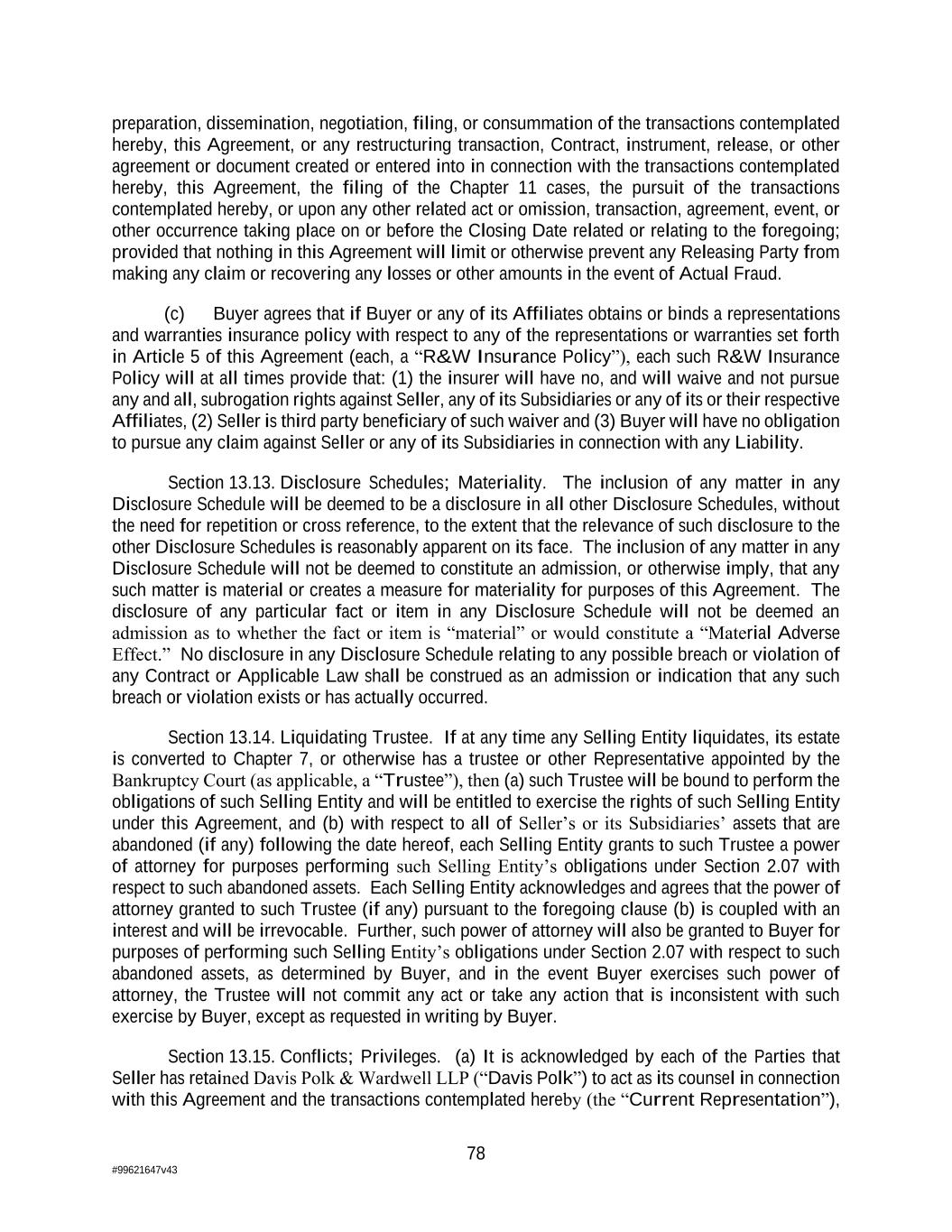 78 #99621647v43 preparation, dissemination, negotiation, filing, or consummation of the transactions contemplated hereby, this Agreement, or any restructuring transaction, Contract, instrument, release, or other agreement or document created or entered into in connection with the transactions contemplated hereby, this Agreement, the filing of the Chapter 11 cases, the pursuit of the transactions contemplated hereby, or upon any other related act or omission, transaction, agreement, event, or other occurrence taking place on or before the Closing Date related or relating to the foregoing; provided that nothing in this Agreement will limit or otherwise prevent any Releasing Party from making any claim or recovering any losses or other amounts in the event of Actual Fraud. (c) Buyer agrees that if Buyer or any of its Affiliates obtains or binds a representations and warranties insurance policy with respect to any of the representations or warranties set forth in Article 5 of this Agreement (each, a “R&W Insurance Policy”), each such R&W Insurance Policy will at all times provide that: (1) the insurer will have no, and will waive and not pursue any and all, subrogation rights against Seller, any of its Subsidiaries or any of its or their respective Affiliates, (2) Seller is third party beneficiary of such waiver and (3) Buyer will have no obligation to pursue any claim against Seller or any of its Subsidiaries in connection with any Liability. Section 13.13. Disclosure Schedules; Materiality. The inclusion of any matter in any Disclosure Schedule will be deemed to be a disclosure in all other Disclosure Schedules, without the need for repetition or cross reference, to the extent that the relevance of such disclosure to the other Disclosure Schedules is reasonably apparent on its face. The inclusion of any matter in any Disclosure Schedule will not be deemed to constitute an admission, or otherwise imply, that any such matter is material or creates a measure for materiality for purposes of this Agreement. The disclosure of any particular fact or item in any Disclosure Schedule will not be deemed an admission as to whether the fact or item is “material” or would constitute a “Material Adverse Effect.” No disclosure in any Disclosure Schedule relating to any possible breach or violation of any Contract or Applicable Law shall be construed as an admission or indication that any such breach or violation exists or has actually occurred. Section 13.14. Liquidating Trustee. If at any time any Selling Entity liquidates, its estate is converted to Chapter 7, or otherwise has a trustee or other Representative appointed by the Bankruptcy Court (as applicable, a “Trustee”), then (a) such Trustee will be bound to perform the obligations of such Selling Entity and will be entitled to exercise the rights of such Selling Entity under this Agreement, and (b) with respect to all of Seller’s or its Subsidiaries’ assets that are abandoned (if any) following the date hereof, each Selling Entity grants to such Trustee a power of attorney for purposes performing such Selling Entity’s obligations under Section 2.07 with respect to such abandoned assets. Each Selling Entity acknowledges and agrees that the power of attorney granted to such Trustee (if any) pursuant to the foregoing clause (b) is coupled with an interest and will be irrevocable. Further, such power of attorney will also be granted to Buyer for purposes of performing such Selling Entity’s obligations under Section 2.07 with respect to such abandoned assets, as determined by Buyer, and in the event Buyer exercises such power of attorney, the Trustee will not commit any act or take any action that is inconsistent with such exercise by Buyer, except as requested in writing by Buyer. Section 13.15. Conflicts; Privileges. (a) It is acknowledged by each of the Parties that Seller has retained Davis Polk & Wardwell LLP (“Davis Polk”) to act as its counsel in connection with this Agreement and the transactions contemplated hereby (the “Current Representation”),