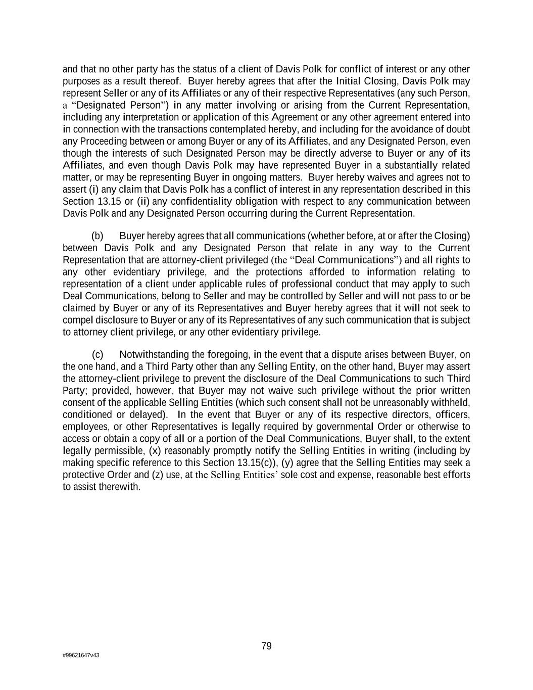 79 #99621647v43 and that no other party has the status of a client of Davis Polk for conflict of interest or any other purposes as a result thereof. Buyer hereby agrees that after the Initial Closing, Davis Polk may represent Seller or any of its Affiliates or any of their respective Representatives (any such Person, a “Designated Person”) in any matter involving or arising from the Current Representation, including any interpretation or application of this Agreement or any other agreement entered into in connection with the transactions contemplated hereby, and including for the avoidance of doubt any Proceeding between or among Buyer or any of its Affiliates, and any Designated Person, even though the interests of such Designated Person may be directly adverse to Buyer or any of its Affiliates, and even though Davis Polk may have represented Buyer in a substantially related matter, or may be representing Buyer in ongoing matters. Buyer hereby waives and agrees not to assert (i) any claim that Davis Polk has a conflict of interest in any representation described in this Section 13.15 or (ii) any confidentiality obligation with respect to any communication between Davis Polk and any Designated Person occurring during the Current Representation. (b) Buyer hereby agrees that all communications (whether before, at or after the Closing) between Davis Polk and any Designated Person that relate in any way to the Current Representation that are attorney-client privileged (the “Deal Communications”) and all rights to any other evidentiary privilege, and the protections afforded to information relating to representation of a client under applicable rules of professional conduct that may apply to such Deal Communications, belong to Seller and may be controlled by Seller and will not pass to or be claimed by Buyer or any of its Representatives and Buyer hereby agrees that it will not seek to compel disclosure to Buyer or any of its Representatives of any such communication that is subject to attorney client privilege, or any other evidentiary privilege. (c) Notwithstanding the foregoing, in the event that a dispute arises between Buyer, on the one hand, and a Third Party other than any Selling Entity, on the other hand, Buyer may assert the attorney-client privilege to prevent the disclosure of the Deal Communications to such Third Party; provided, however, that Buyer may not waive such privilege without the prior written consent of the applicable Selling Entities (which such consent shall not be unreasonably withheld, conditioned or delayed). In the event that Buyer or any of its respective directors, officers, employees, or other Representatives is legally required by governmental Order or otherwise to access or obtain a copy of all or a portion of the Deal Communications, Buyer shall, to the extent legally permissible, (x) reasonably promptly notify the Selling Entities in writing (including by making specific reference to this Section 13.15(c)), (y) agree that the Selling Entities may seek a protective Order and (z) use, at the Selling Entities’ sole cost and expense, reasonable best efforts to assist therewith.
