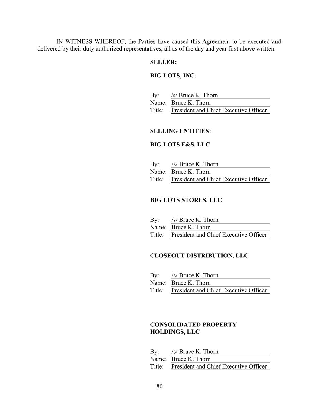 80 IN WITNESS WHEREOF, the Parties have caused this Agreement to be executed and delivered by their duly authorized representatives, all as of the day and year first above written. SELLER: BIG LOTS, INC. By: /s/ Bruce K. Thorn Name: Bruce K. Thorn Title: President and Chief Executive Officer SELLING ENTITIES: BIG LOTS F&S, LLC By: /s/ Bruce K. Thorn Name: Bruce K. Thorn Title: President and Chief Executive Officer BIG LOTS STORES, LLC By: /s/ Bruce K. Thorn Name: Bruce K. Thorn Title: President and Chief Executive Officer CLOSEOUT DISTRIBUTION, LLC By: /s/ Bruce K. Thorn Name: Bruce K. Thorn Title: President and Chief Executive Officer CONSOLIDATED PROPERTY HOLDINGS, LLC By: /s/ Bruce K. Thorn Name: Bruce K. Thorn Title: President and Chief Executive Officer