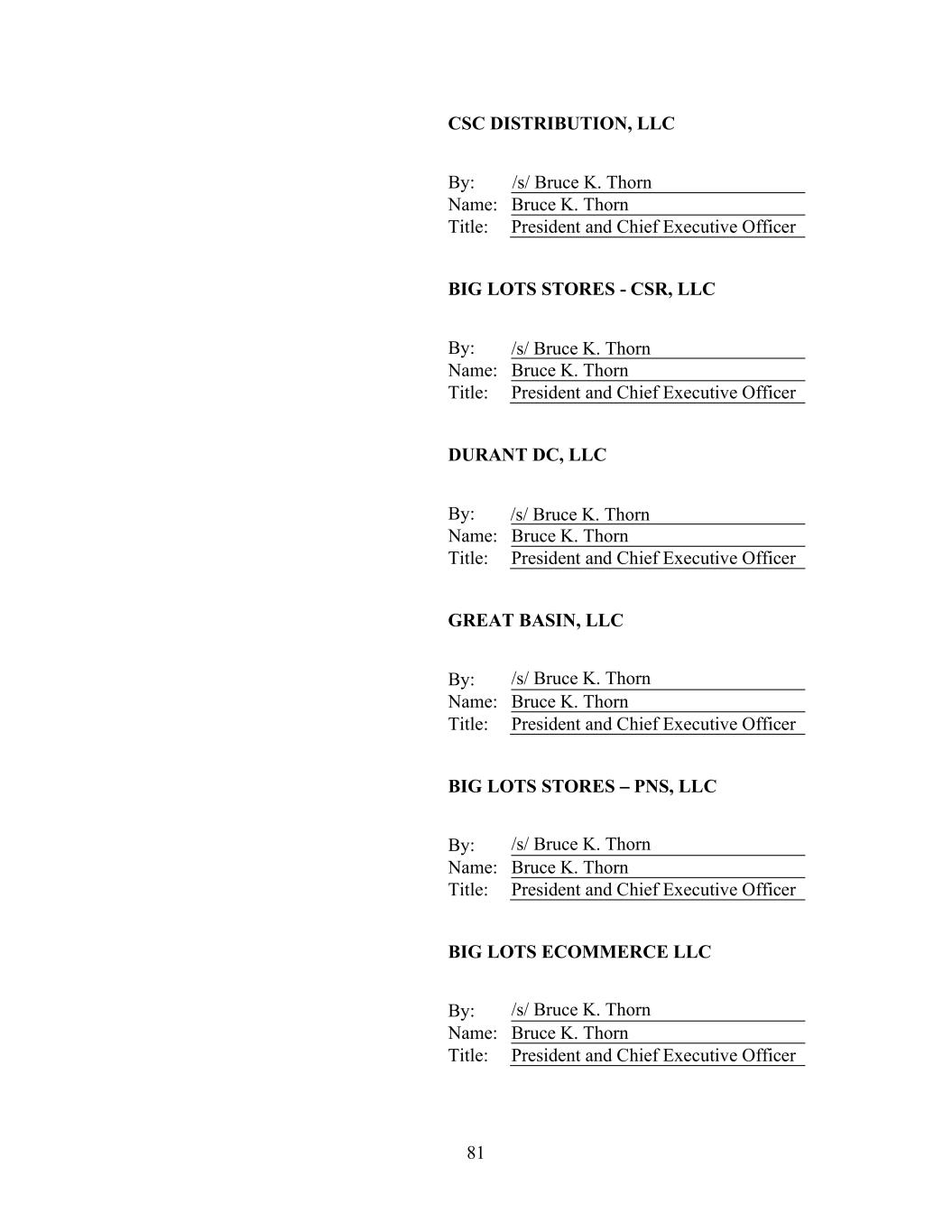 81 CSC DISTRIBUTION, LLC By: /s/ Bruce K. Thorn Name: Bruce K. Thorn Title: President and Chief Executive Officer BIG LOTS STORES - CSR, LLC By: Name: Bruce K. Thorn Title: President and Chief Executive Officer DURANT DC, LLC By: Name: Bruce K. Thorn Title: President and Chief Executive Officer GREAT BASIN, LLC By: Name: Bruce K. Thorn Title: President and Chief Executive Officer BIG LOTS STORES PNS, LLC By: Name: Bruce K. Thorn Title: President and Chief Executive Officer BIG LOTS ECOMMERCE LLC By: Name: Bruce K. Thorn Title: President and Chief Executive Officer /s/ Bruce K. Thorn /s/ Bruce K. Thorn /s/ Bruce K. Thorn /s/ Bruce K. Thorn /s/ Bruce K. Thorn