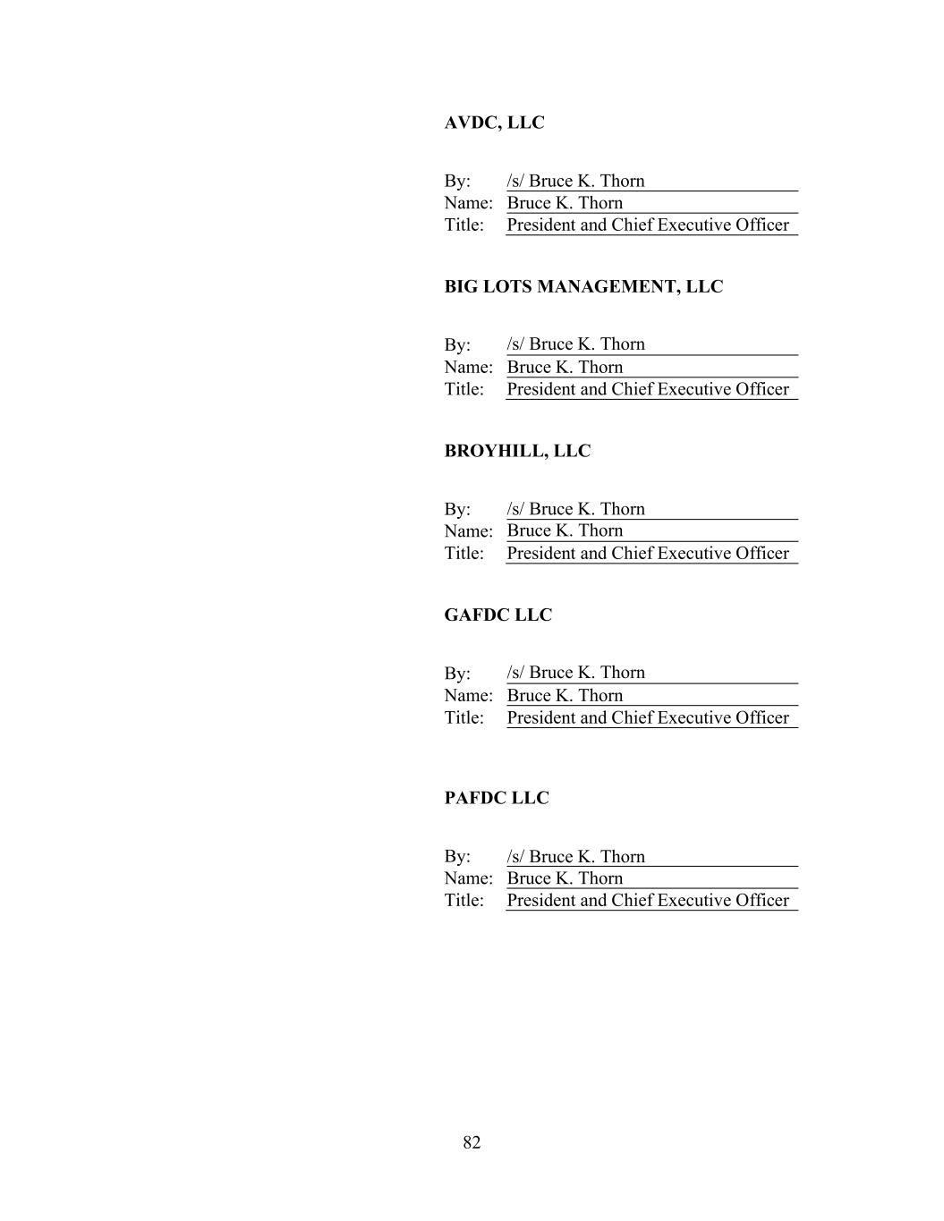 82 AVDC, LLC By: /s/ Bruce K. Thorn Name: Bruce K. Thorn Title: President and Chief Executive Officer BIG LOTS MANAGEMENT, LLC By: Name: Bruce K. Thorn Title: President and Chief Executive Officer BROYHILL, LLC By: Name: Bruce K. Thorn Title: President and Chief Executive Officer GAFDC LLC By: Name: Bruce K. Thorn Title: President and Chief Executive Officer PAFDC LLC By: Name: Bruce K. Thorn Title: President and Chief Executive Officer /s/ Bruce K. Thorn /s/ Bruce K. Thorn /s/ Bruce K. Thorn /s/ Bruce K. Thorn