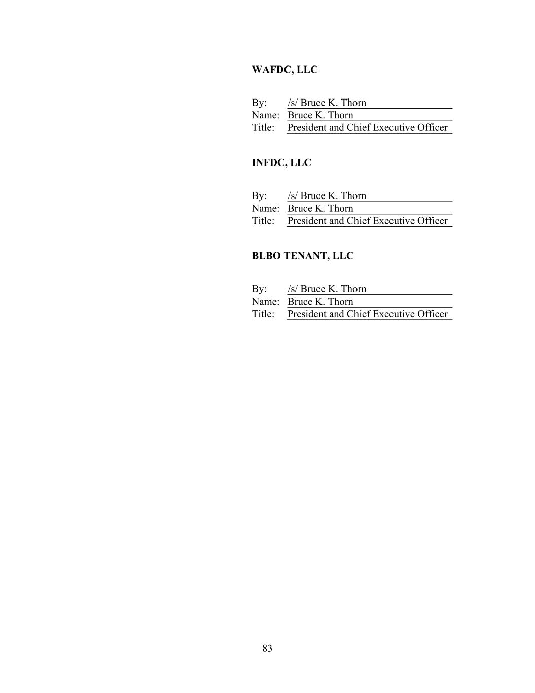 83 WAFDC, LLC By: /s/ Bruce K. Thorn Name: Bruce K. Thorn Title: President and Chief Executive Officer INFDC, LLC By: /s/ Bruce K. Thorn Name: Bruce K. Thorn Title: President and Chief Executive Officer BLBO TENANT, LLC By: /s/ Bruce K. Thorn Name: Bruce K. Thorn Title: President and Chief Executive Officer