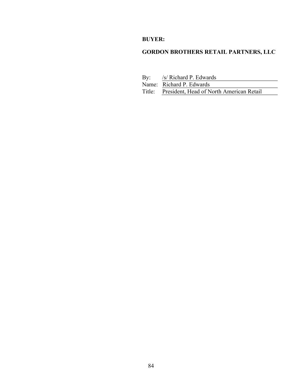 84 BUYER: GORDON BROTHERS RETAIL PARTNERS, LLC By: /s/ Richard P. Edwards Name: Richard P. Edwards Title: President, Head of North American Retail