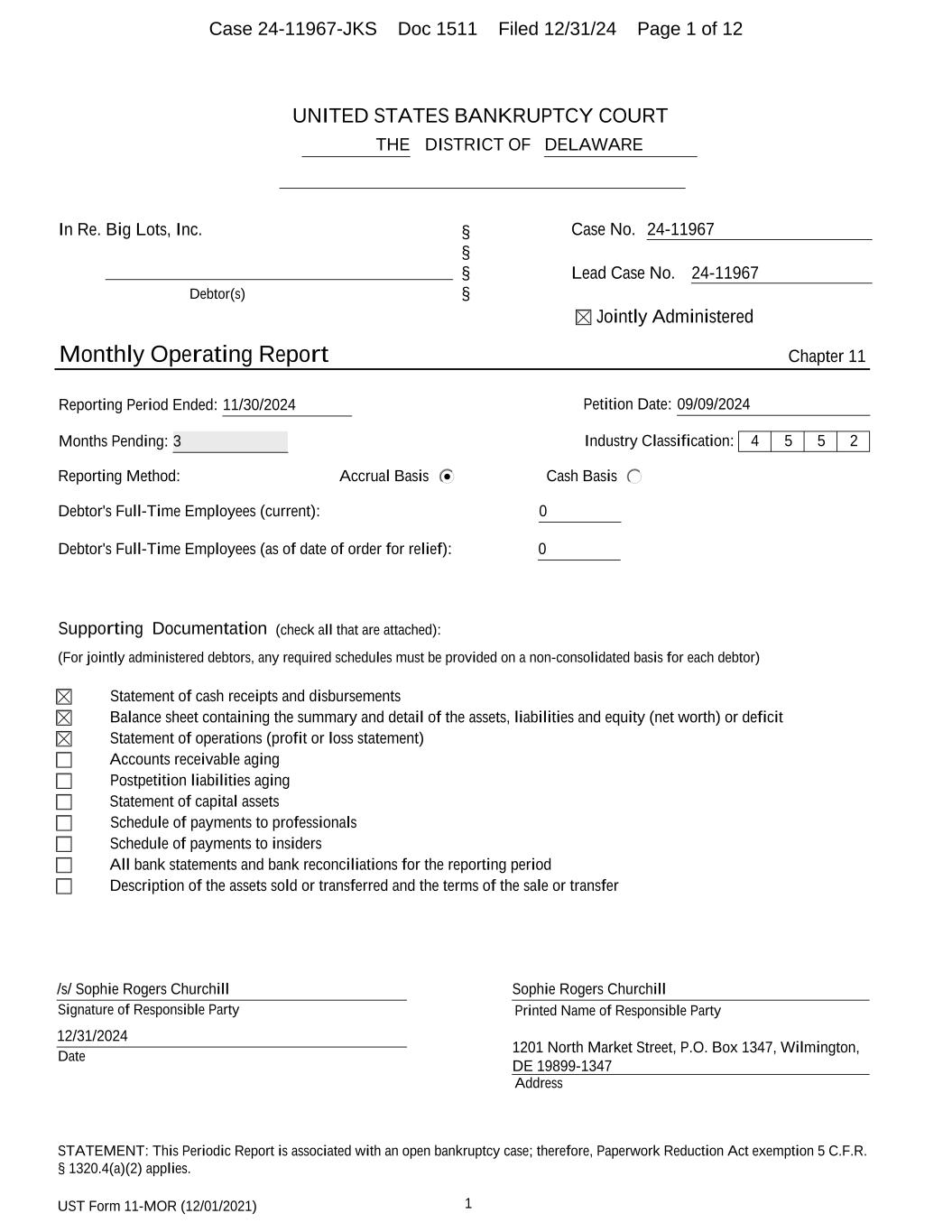 UST Form 11-MOR (12/01/2021) 1 UNITED STATES BANKRUPTCY COURT DISTRICT OFTHE DELAWARE In Re. Big Lots, Inc. Debtor(s) § § § § Case No. 24-11967 Lead Case No. 24-11967 Jointly Administered Monthly Operating Report Chapter 11 Reporting Period Ended: 11/30/2024 Petition Date: 09/09/2024 Months Pending: 3 Industry Classification: 4 5 5 2 Reporting Method: Accrual Basis Cash Basis Debtor's Full-Time Employees (current): 0 Debtor's Full-Time Employees (as of date of order for relief): 0 Supporting Documentation (check all that are attached): (For jointly administered debtors, any required schedules must be provided on a non-consolidated basis for each debtor) Statement of cash receipts and disbursements Balance sheet containing the summary and detail of the assets, liabilities and equity (net worth) or deficit Statement of operations (profit or loss statement) Accounts receivable aging Postpetition liabilities aging Statement of capital assets Schedule of payments to professionals Schedule of payments to insiders All bank statements and bank reconciliations for the reporting period Description of the assets sold or transferred and the terms of the sale or transfer Signature of Responsible Party Printed Name of Responsible Party Date Address /s/ Sophie Rogers Churchill 12/31/2024 Sophie Rogers Churchill 1201 North Market Street, P.O. Box 1347, Wilmington, DE 19899-1347 STATEMENT: This Periodic Report is associated with an open bankruptcy case; therefore, Paperwork Reduction Act exemption 5 C.F.R. § 1320.4(a)(2) applies. Case 24-11967-JKS Doc 1511 Filed 12/31/24 Page 1 of 12