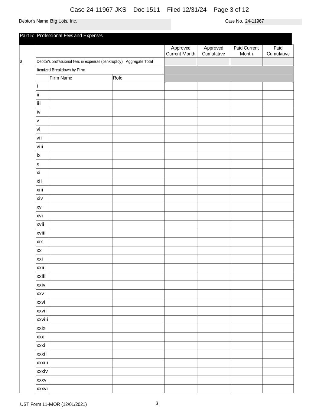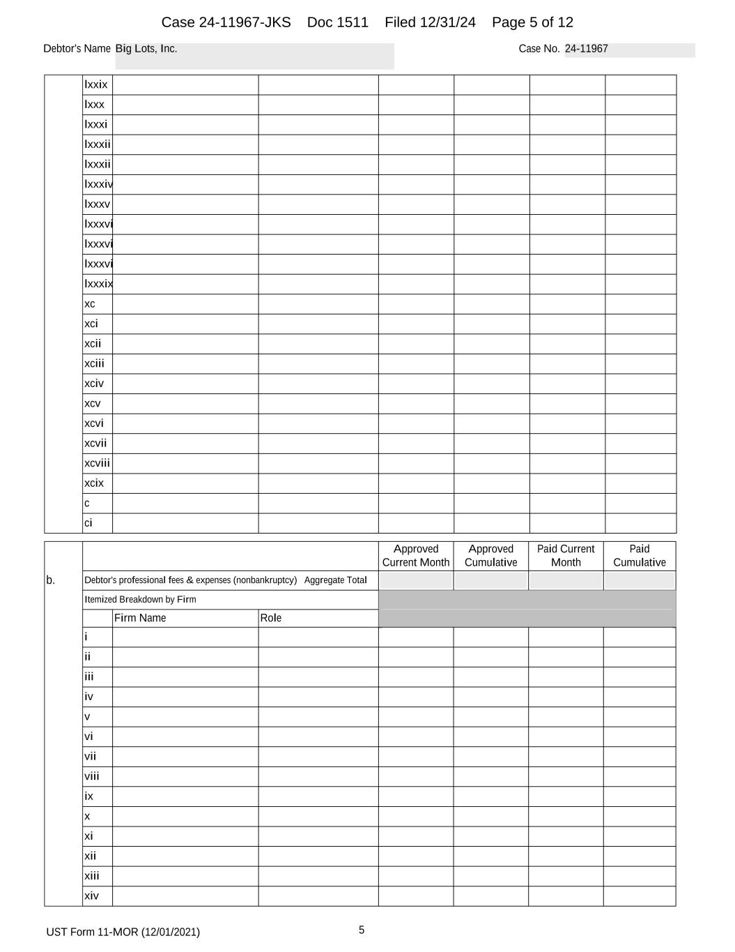 UST Form 11-MOR (12/01/2021) 5 Debtor's Name Big Lots, Inc. Case No. 24-11967 lxxix lxxx lxxxi lxxxii lxxxii lxxxiv lxxxv lxxxvi lxxxvi lxxxvi lxxxix xc xci xcii xciii xciv xcv xcvi xcvii xcviii xcix c ci Approved Current Month Approved Cumulative Paid Current Month Paid Cumulative b. Debtor's professional fees & expenses (nonbankruptcy) Aggregate Total Itemized Breakdown by Firm Firm Name Role i ii iii iv v vi vii viii ix x xi xii xiii xiv Case 24-11967-JKS Doc 1511 Filed 12/31/24 Page 5 of 12