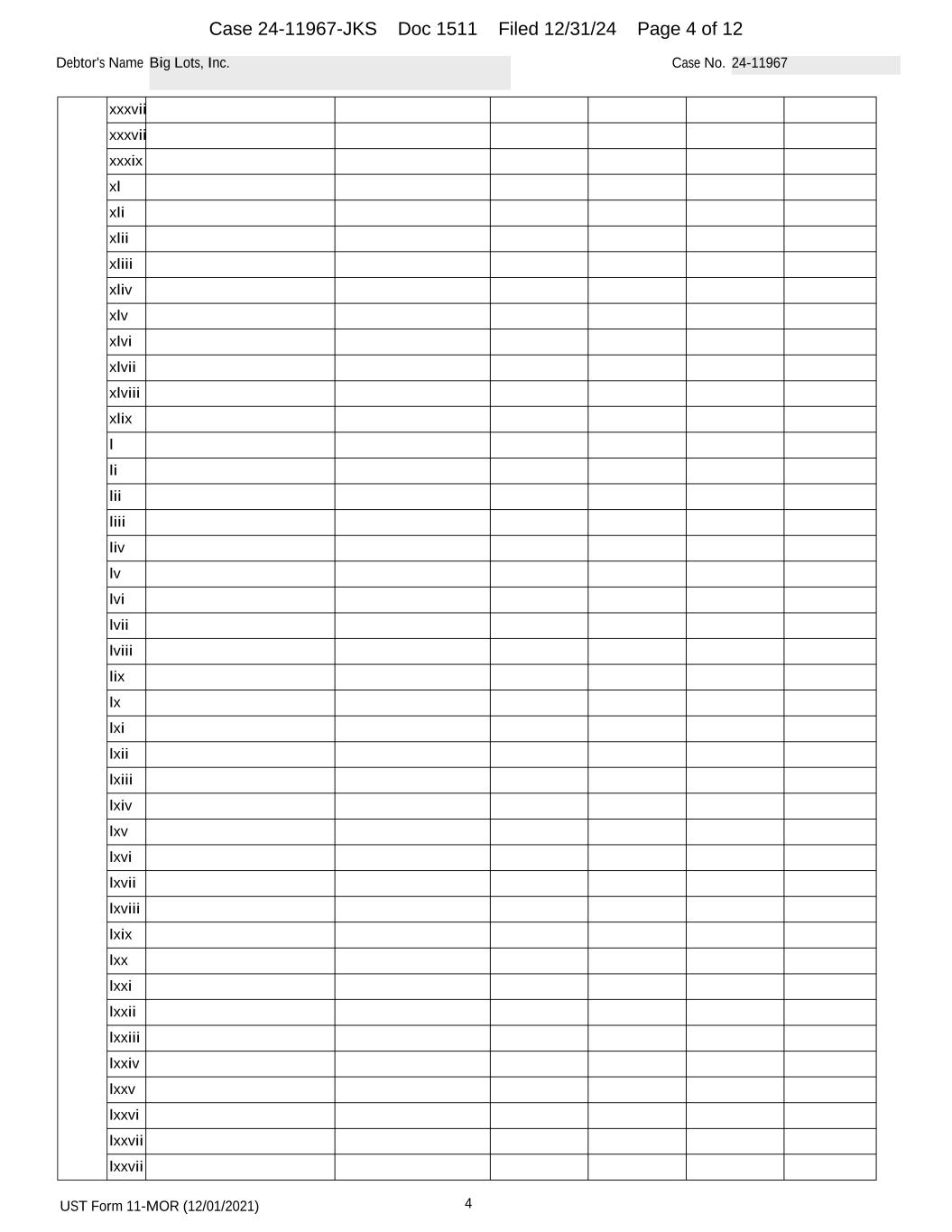 UST Form 11-MOR (12/01/2021) 4 Debtor's Name Big Lots, Inc. Case No. 24-11967 xxxvii xxxvii xxxix xl xli xlii xliii xliv xlv xlvi xlvii xlviii xlix l li lii liii liv lv lvi lvii lviii lix lx lxi lxii lxiii lxiv lxv lxvi lxvii lxviii lxix lxx lxxi lxxii lxxiii lxxiv lxxv lxxvi lxxvii lxxvii Case 24-11967-JKS Doc 1511 Filed 12/31/24 Page 4 of 12