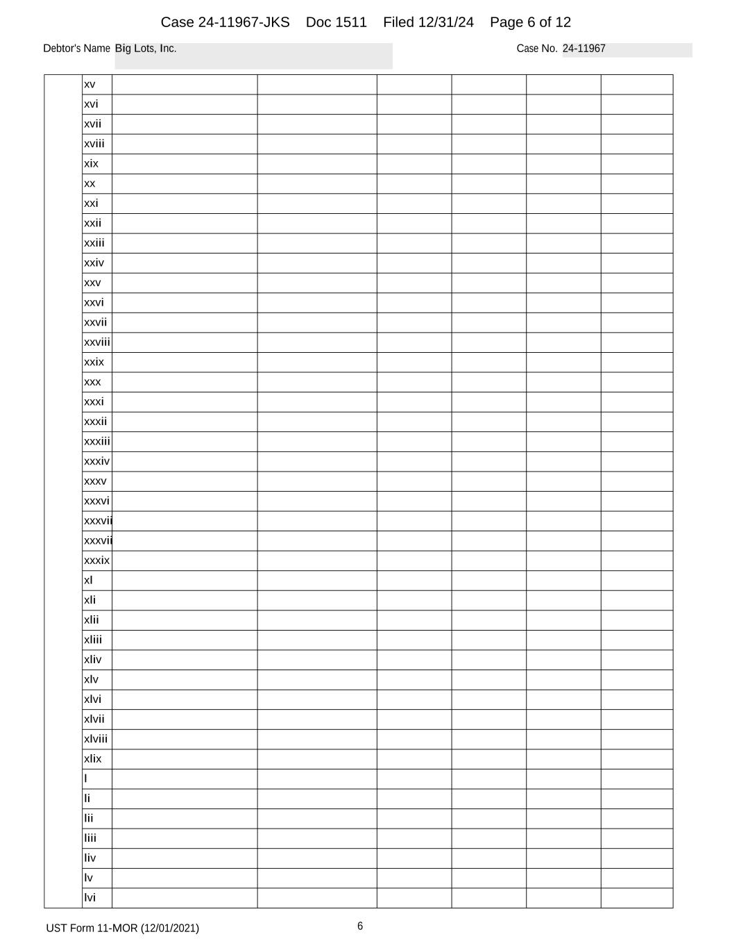 UST Form 11-MOR (12/01/2021) 6 Debtor's Name Big Lots, Inc. Case No. 24-11967 xv xvi xvii xviii xix xx xxi xxii xxiii xxiv xxv xxvi xxvii xxviii xxix xxx xxxi xxxii xxxiii xxxiv xxxv xxxvi xxxvii xxxvii xxxix xl xli xlii xliii xliv xlv xlvi xlvii xlviii xlix l li lii liii liv lv lvi Case 24-11967-JKS Doc 1511 Filed 12/31/24 Page 6 of 12