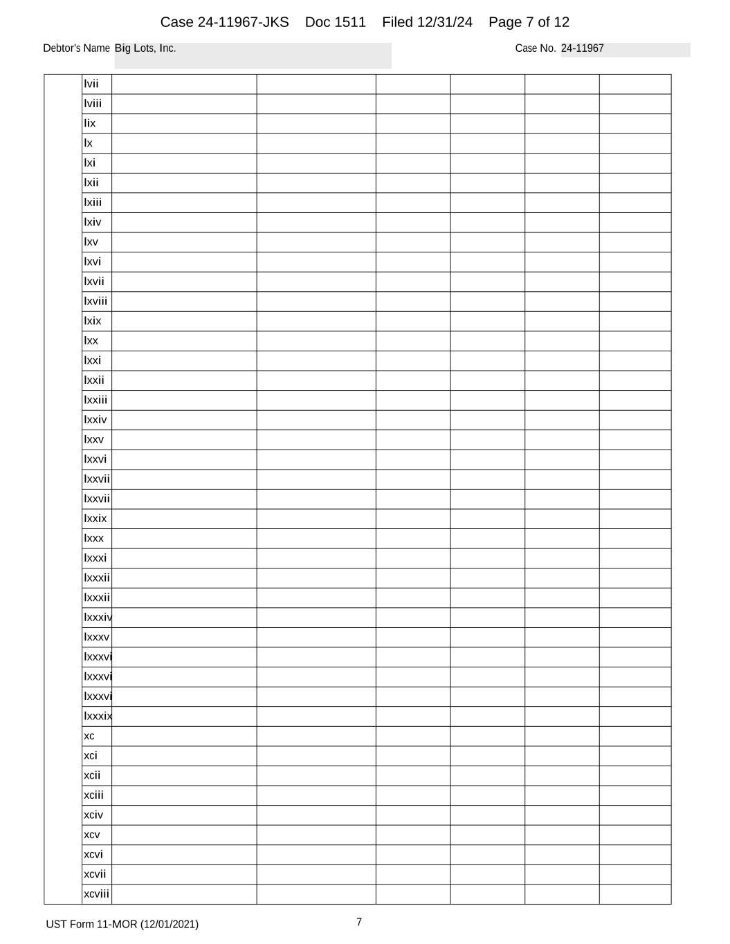 UST Form 11-MOR (12/01/2021) 7 Debtor's Name Big Lots, Inc. Case No. 24-11967 lvii lviii lix lx lxi lxii lxiii lxiv lxv lxvi lxvii lxviii lxix lxx lxxi lxxii lxxiii lxxiv lxxv lxxvi lxxvii lxxvii lxxix lxxx lxxxi lxxxii lxxxii lxxxiv lxxxv lxxxvi lxxxvi lxxxvi lxxxix xc xci xcii xciii xciv xcv xcvi xcvii xcviii Case 24-11967-JKS Doc 1511 Filed 12/31/24 Page 7 of 12