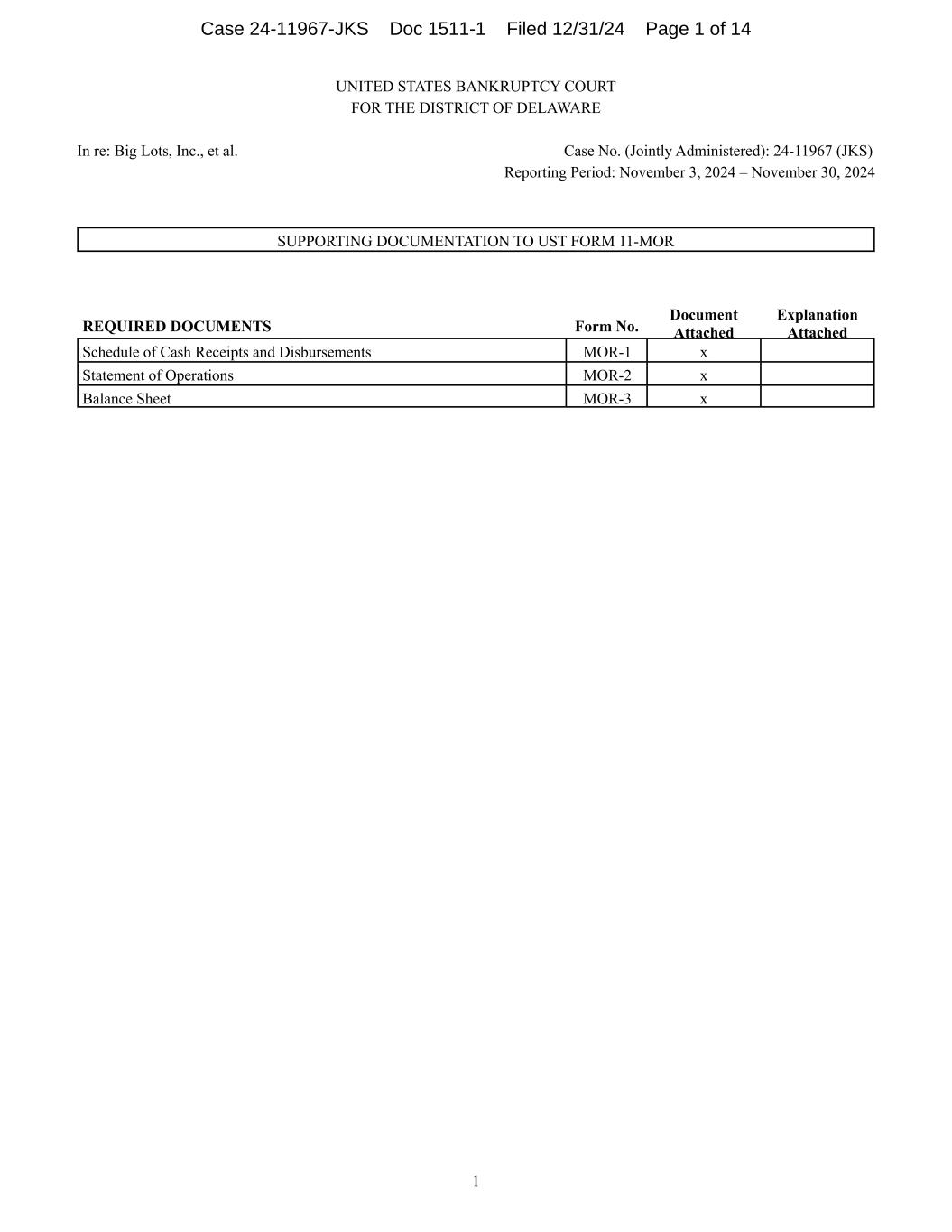UNITED STATES BANKRUPTCY COURT FOR THE DISTRICT OF DELAWARE In re: Big Lots, Inc., et al. Case No. (Jointly Administered): 24-11967 (JKS) Reporting Period: November 3, 2024 – November 30, 2024 1 SUPPORTING DOCUMENTATION TO UST FORM 11-MOR REQUIRED DOCUMENTS Form No. Document Attached Explanation Attached Schedule of Cash Receipts and Disbursements MOR-1 x Statement of Operations MOR-2 x Balance Sheet MOR-3 x Case 24-11967-JKS Doc 1511-1 Filed 12/31/24 Page 1 of 14