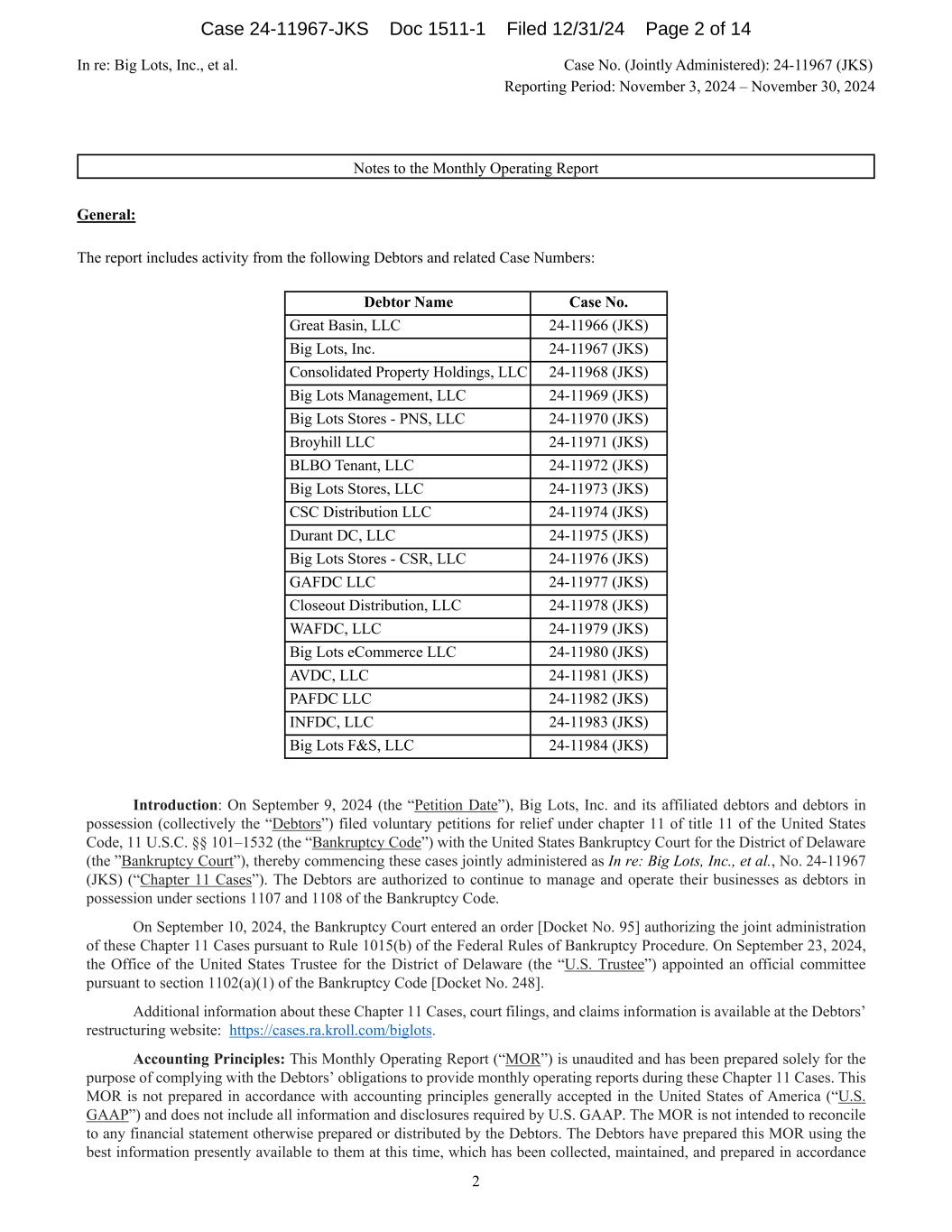 In re: Big Lots, Inc., et al. Case No. (Jointly Administered): 24-11967 (JKS) Reporting Period: November 3, 2024 – November 30, 2024 2 Notes to the Monthly Operating Report General: The report includes activity from the following Debtors and related Case Numbers: Debtor Name Case No. Great Basin, LLC 24-11966 (JKS) Big Lots, Inc. 24-11967 (JKS) Consolidated Property Holdings, LLC 24-11968 (JKS) Big Lots Management, LLC 24-11969 (JKS) Big Lots Stores - PNS, LLC 24-11970 (JKS) Broyhill LLC 24-11971 (JKS) BLBO Tenant, LLC 24-11972 (JKS) Big Lots Stores, LLC 24-11973 (JKS) CSC Distribution LLC 24-11974 (JKS) Durant DC, LLC 24-11975 (JKS) Big Lots Stores - CSR, LLC 24-11976 (JKS) GAFDC LLC 24-11977 (JKS) Closeout Distribution, LLC 24-11978 (JKS) WAFDC, LLC 24-11979 (JKS) Big Lots eCommerce LLC 24-11980 (JKS) AVDC, LLC 24-11981 (JKS) PAFDC LLC 24-11982 (JKS) INFDC, LLC 24-11983 (JKS) Big Lots F&S, LLC 24-11984 (JKS) Introduction: On September 9, 2024 (the “Petition Date”), Big Lots, Inc. and its affiliated debtors and debtors in possession (collectively the “Debtors”) filed voluntary petitions for relief under chapter 11 of title 11 of the United States Code, 11 U.S.C. §§ 101–1532 (the “Bankruptcy Code”) with the United States Bankruptcy Court for the District of Delaware (the ”Bankruptcy Court”), thereby commencing these cases jointly administered as In re: Big Lots, Inc., et al., No. 24-11967 (JKS) (“Chapter 11 Cases”). The Debtors are authorized to continue to manage and operate their businesses as debtors in possession under sections 1107 and 1108 of the Bankruptcy Code. On September 10, 2024, the Bankruptcy Court entered an order [Docket No. 95] authorizing the joint administration of these Chapter 11 Cases pursuant to Rule 1015(b) of the Federal Rules of Bankruptcy Procedure. On September 23, 2024, the Office of the United States Trustee for the District of Delaware (the “U.S. Trustee”) appointed an official committee pursuant to section 1102(a)(1) of the Bankruptcy Code [Docket No. 248]. Additional information about these Chapter 11 Cases, court filings, and claims information is available at the Debtors’ restructuring website: https://cases.ra.kroll.com/biglots. Accounting Principles: This Monthly Operating Report (“MOR”) is unaudited and has been prepared solely for the purpose of complying with the Debtors’ obligations to provide monthly operating reports during these Chapter 11 Cases. This MOR is not prepared in accordance with accounting principles generally accepted in the United States of America (“U.S. GAAP”) and does not include all information and disclosures required by U.S. GAAP. The MOR is not intended to reconcile to any financial statement otherwise prepared or distributed by the Debtors. The Debtors have prepared this MOR using the best information presently available to them at this time, which has been collected, maintained, and prepared in accordance Case 24-11967-JKS Doc 1511-1 Filed 12/31/24 Page 2 of 14