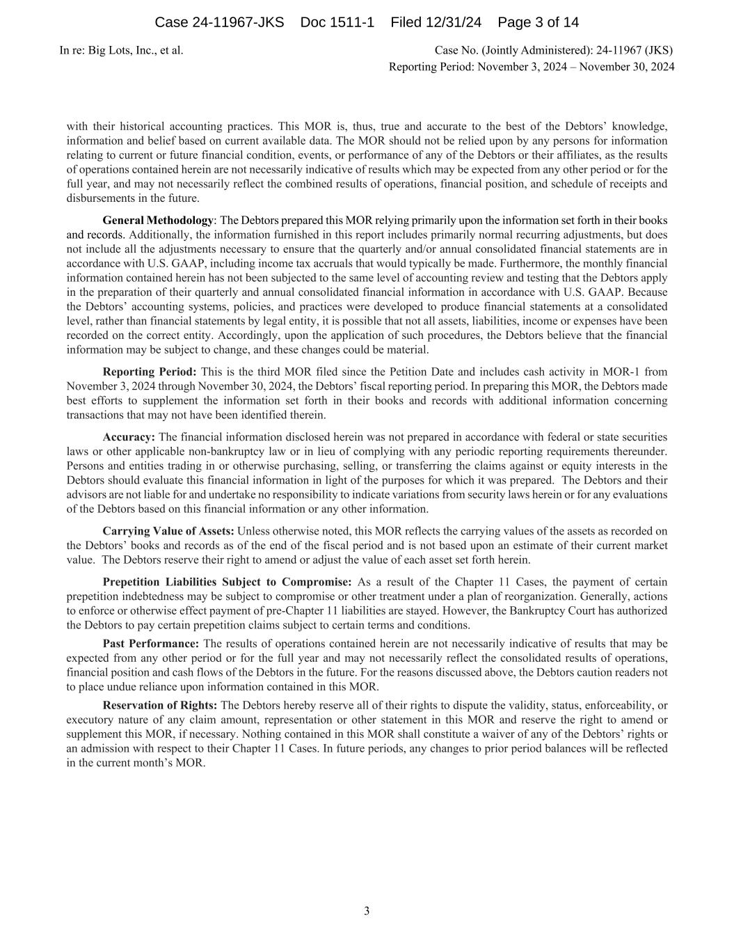 In re: Big Lots, Inc., et al. Case No. (Jointly Administered): 24-11967 (JKS) Reporting Period: November 3, 2024 – November 30, 2024 3 with their historical accounting practices. This MOR is, thus, true and accurate to the best of the Debtors’ knowledge, information and belief based on current available data. The MOR should not be relied upon by any persons for information relating to current or future financial condition, events, or performance of any of the Debtors or their affiliates, as the results of operations contained herein are not necessarily indicative of results which may be expected from any other period or for the full year, and may not necessarily reflect the combined results of operations, financial position, and schedule of receipts and disbursements in the future. General Methodology: The Debtors prepared this MOR relying primarily upon the information set forth in their books and records. Additionally, the information furnished in this report includes primarily normal recurring adjustments, but does not include all the adjustments necessary to ensure that the quarterly and/or annual consolidated financial statements are in accordance with U.S. GAAP, including income tax accruals that would typically be made. Furthermore, the monthly financial information contained herein has not been subjected to the same level of accounting review and testing that the Debtors apply in the preparation of their quarterly and annual consolidated financial information in accordance with U.S. GAAP. Because the Debtors’ accounting systems, policies, and practices were developed to produce financial statements at a consolidated level, rather than financial statements by legal entity, it is possible that not all assets, liabilities, income or expenses have been recorded on the correct entity. Accordingly, upon the application of such procedures, the Debtors believe that the financial information may be subject to change, and these changes could be material. Reporting Period: This is the third MOR filed since the Petition Date and includes cash activity in MOR-1 from November 3, 2024 through November 30, 2024, the Debtors’ fiscal reporting period. In preparing this MOR, the Debtors made best efforts to supplement the information set forth in their books and records with additional information concerning transactions that may not have been identified therein. Accuracy: The financial information disclosed herein was not prepared in accordance with federal or state securities laws or other applicable non-bankruptcy law or in lieu of complying with any periodic reporting requirements thereunder. Persons and entities trading in or otherwise purchasing, selling, or transferring the claims against or equity interests in the Debtors should evaluate this financial information in light of the purposes for which it was prepared. The Debtors and their advisors are not liable for and undertake no responsibility to indicate variations from security laws herein or for any evaluations of the Debtors based on this financial information or any other information. Carrying Value of Assets: Unless otherwise noted, this MOR reflects the carrying values of the assets as recorded on the Debtors’ books and records as of the end of the fiscal period and is not based upon an estimate of their current market value. The Debtors reserve their right to amend or adjust the value of each asset set forth herein. Prepetition Liabilities Subject to Compromise: As a result of the Chapter 11 Cases, the payment of certain prepetition indebtedness may be subject to compromise or other treatment under a plan of reorganization. Generally, actions to enforce or otherwise effect payment of pre-Chapter 11 liabilities are stayed. However, the Bankruptcy Court has authorized the Debtors to pay certain prepetition claims subject to certain terms and conditions. Past Performance: The results of operations contained herein are not necessarily indicative of results that may be expected from any other period or for the full year and may not necessarily reflect the consolidated results of operations, financial position and cash flows of the Debtors in the future. For the reasons discussed above, the Debtors caution readers not to place undue reliance upon information contained in this MOR. Reservation of Rights: The Debtors hereby reserve all of their rights to dispute the validity, status, enforceability, or executory nature of any claim amount, representation or other statement in this MOR and reserve the right to amend or supplement this MOR, if necessary. Nothing contained in this MOR shall constitute a waiver of any of the Debtors’ rights or an admission with respect to their Chapter 11 Cases. In future periods, any changes to prior period balances will be reflected in the current month’s MOR. Case 24-11967-JKS Doc 1511-1 Filed 12/31/24 Page 3 of 14