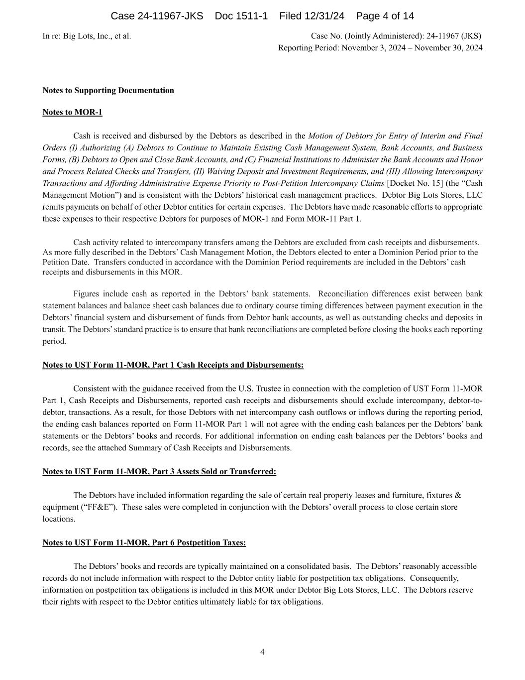 In re: Big Lots, Inc., et al. Case No. (Jointly Administered): 24-11967 (JKS) Reporting Period: November 3, 2024 – November 30, 2024 4 Notes to Supporting Documentation Notes to MOR-1 Cash is received and disbursed by the Debtors as described in the Motion of Debtors for Entry of Interim and Final Orders (I) Authorizing (A) Debtors to Continue to Maintain Existing Cash Management System, Bank Accounts, and Business Forms, (B) Debtors to Open and Close Bank Accounts, and (C) Financial Institutions to Administer the Bank Accounts and Honor and Process Related Checks and Transfers, (II) Waiving Deposit and Investment Requirements, and (III) Allowing Intercompany Transactions and Affording Administrative Expense Priority to Post-Petition Intercompany Claims [Docket No. 15] (the “Cash Management Motion”) and is consistent with the Debtors’ historical cash management practices. Debtor Big Lots Stores, LLC remits payments on behalf of other Debtor entities for certain expenses. The Debtors have made reasonable efforts to appropriate these expenses to their respective Debtors for purposes of MOR-1 and Form MOR-11 Part 1. Cash activity related to intercompany transfers among the Debtors are excluded from cash receipts and disbursements. As more fully described in the Debtors’ Cash Management Motion, the Debtors elected to enter a Dominion Period prior to the Petition Date. Transfers conducted in accordance with the Dominion Period requirements are included in the Debtors’ cash receipts and disbursements in this MOR. Figures include cash as reported in the Debtors’ bank statements. Reconciliation differences exist between bank statement balances and balance sheet cash balances due to ordinary course timing differences between payment execution in the Debtors’ financial system and disbursement of funds from Debtor bank accounts, as well as outstanding checks and deposits in transit. The Debtors’ standard practice is to ensure that bank reconciliations are completed before closing the books each reporting period. Notes to UST Form 11-MOR, Part 1 Cash Receipts and Disbursements: Consistent with the guidance received from the U.S. Trustee in connection with the completion of UST Form 11-MOR Part 1, Cash Receipts and Disbursements, reported cash receipts and disbursements should exclude intercompany, debtor-to- debtor, transactions. As a result, for those Debtors with net intercompany cash outflows or inflows during the reporting period, the ending cash balances reported on Form 11-MOR Part 1 will not agree with the ending cash balances per the Debtors’ bank statements or the Debtors’ books and records. For additional information on ending cash balances per the Debtors’ books and records, see the attached Summary of Cash Receipts and Disbursements. Notes to UST Form 11-MOR, Part 3 Assets Sold or Transferred: The Debtors have included information regarding the sale of certain real property leases and furniture, fixtures & equipment (“FF&E”). These sales were completed in conjunction with the Debtors’ overall process to close certain store locations. Notes to UST Form 11-MOR, Part 6 Postpetition Taxes: The Debtors’ books and records are typically maintained on a consolidated basis. The Debtors’ reasonably accessible records do not include information with respect to the Debtor entity liable for postpetition tax obligations. Consequently, information on postpetition tax obligations is included in this MOR under Debtor Big Lots Stores, LLC. The Debtors reserve their rights with respect to the Debtor entities ultimately liable for tax obligations. Case 24-11967-JKS Doc 1511-1 Filed 12/31/24 Page 4 of 14