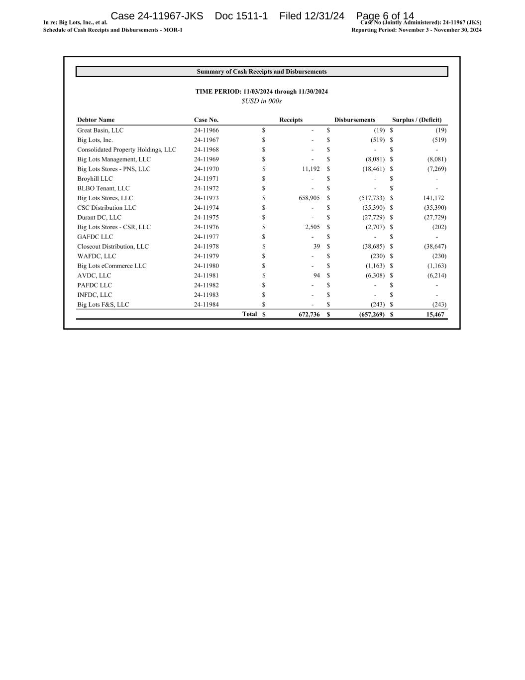 In re: Big Lots, Inc., et al. Schedule of Cash Receipts and Disbursements - MOR-1 Case No (Jointly Administered): 24-11967 (JKS) Reporting Period: November 3 - November 30, 2024 Summary of Cash Receipts and Disbursements TIME PERIOD: 11/03/2024 through 11/30/2024 Debtor Name Case No. Receipts Disbursements Surplus / (Deficit) Great Basin, LLC 24-11966 -$ (19)$ (19)$ Big Lots, Inc. 24-11967 -$ (519)$ (519)$ Consolidated Property Holdings, LLC 24-11968 -$ -$ -$ Big Lots Management, LLC 24-11969 -$ (8,081)$ (8,081)$ Big Lots Stores - PNS, LLC 24-11970 11,192$ (18,461)$ (7,269)$ Broyhill LLC 24-11971 -$ -$ -$ BLBO Tenant, LLC 24-11972 -$ -$ -$ Big Lots Stores, LLC 24-11973 658,905$ (517,733)$ 141,172$ CSC Distribution LLC 24-11974 -$ (35,390)$ (35,390)$ Durant DC, LLC 24-11975 -$ (27,729)$ (27,729)$ Big Lots Stores - CSR, LLC 24-11976 2,505$ (2,707)$ (202)$ GAFDC LLC 24-11977 -$ -$ -$ Closeout Distribution, LLC 24-11978 39$ (38,685)$ (38,647)$ WAFDC, LLC 24-11979 -$ (230)$ (230)$ Big Lots eCommerce LLC 24-11980 -$ (1,163)$ (1,163)$ AVDC, LLC 24-11981 94$ (6,308)$ (6,214)$ PAFDC LLC 24-11982 -$ -$ -$ INFDC, LLC 24-11983 -$ -$ -$ Big Lots F&S, LLC 24-11984 -$ (243)$ (243)$ Total 672,736$ (657,269)$ 15,467$ $USD in 000s Case 24-11967-JKS Doc 1511-1 Filed 12/31/24 Page 6 of 14