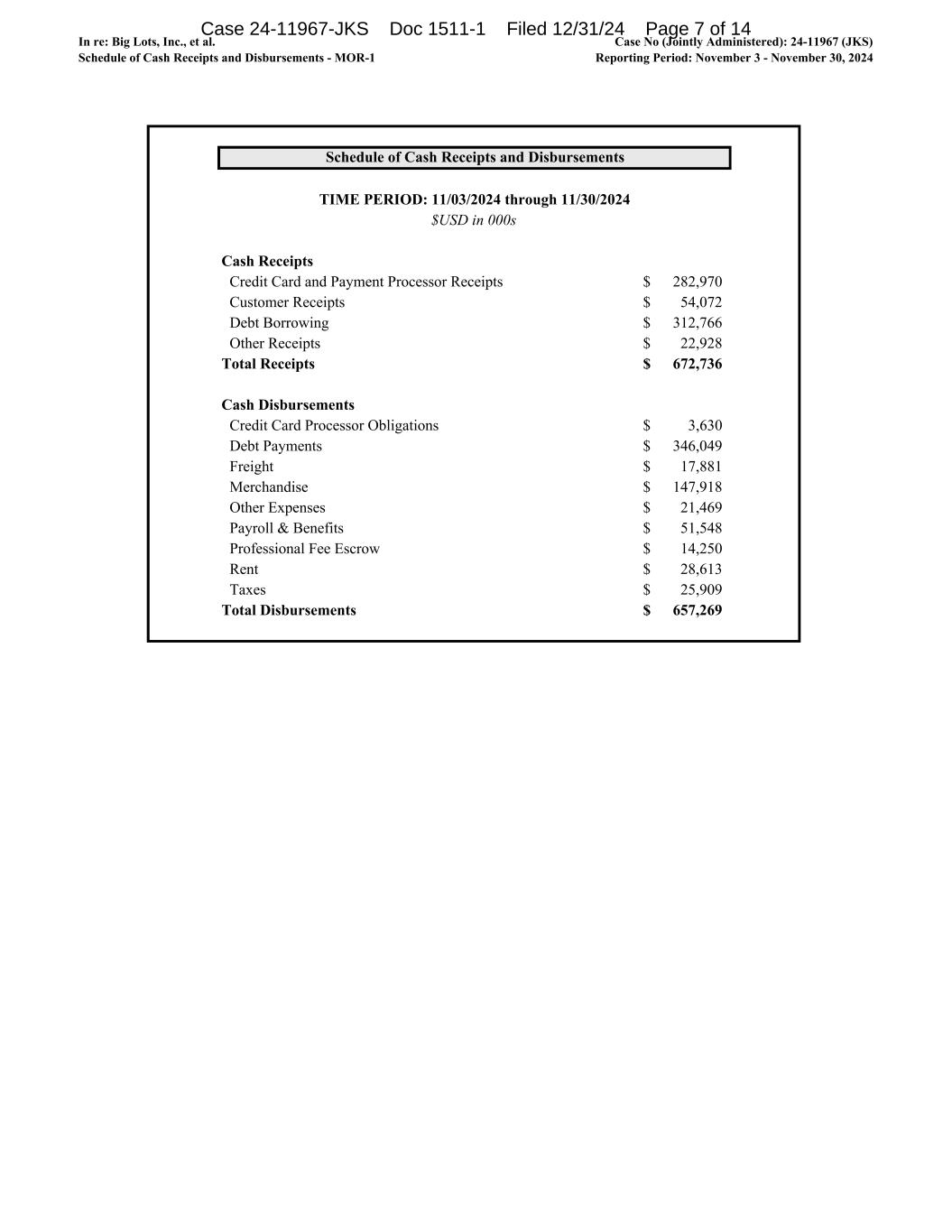 In re: Big Lots, Inc., et al. Schedule of Cash Receipts and Disbursements - MOR-1 Case No (Jointly Administered): 24-11967 (JKS) Reporting Period: November 3 - November 30, 2024 Schedule of Cash Receipts and Disbursements TIME PERIOD: 11/03/2024 through 11/30/2024 Cash Receipts Credit Card and Payment Processor Receipts 282,970$ Customer Receipts 54,072$ Debt Borrowing 312,766$ Other Receipts 22,928$ Total Receipts 672,736$ Cash Disbursements Credit Card Processor Obligations 3,630$ Debt Payments 346,049$ Freight 17,881$ Merchandise 147,918$ Other Expenses 21,469$ Payroll & Benefits 51,548$ Professional Fee Escrow 14,250$ Rent 28,613$ Taxes 25,909$ Total Disbursements 657,269$ $USD in 000s Case 24-11967-JKS Doc 1511-1 Filed 12/31/24 Page 7 of 14