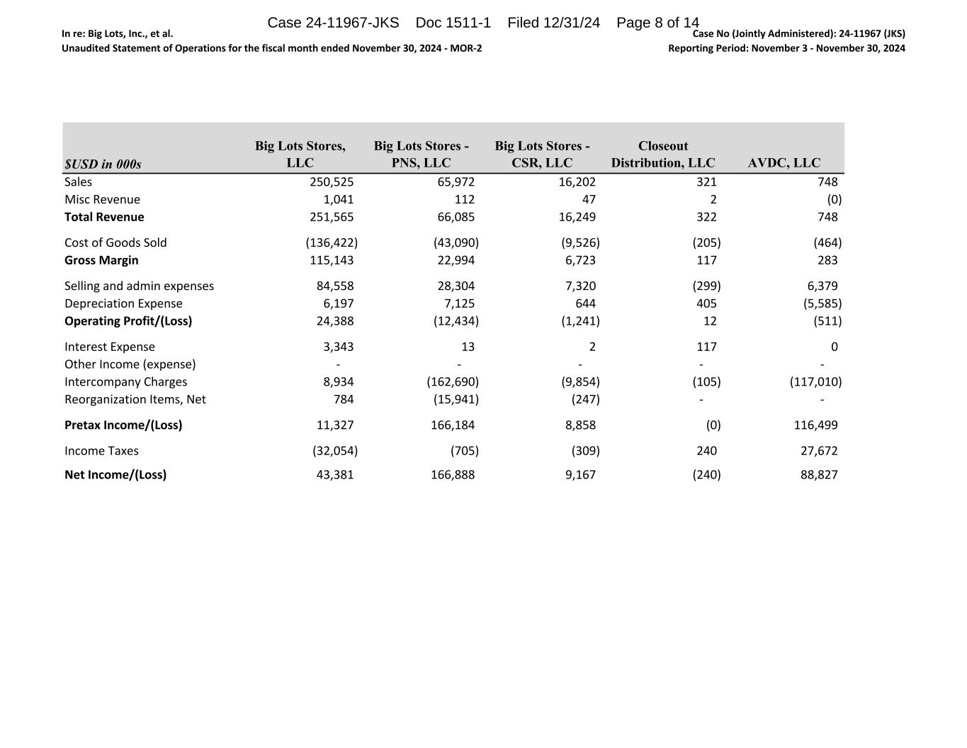 In re: Big Lots, Inc., et al. Unaudited Statement of Operations for the fiscal month ended November 30, 2024 ‐ MOR‐2 Case No (Jointly Administered): 24‐11967 (JKS) Reporting Period: November 3 ‐ November 30, 2024 $USD in 000s Big Lots Stores, LLC Big Lots Stores - PNS, LLC Big Lots Stores - CSR, LLC Closeout Distribution, LLC AVDC, LLC Sales 250,525                       65,972                         16,202                         321                               748                               Misc Revenue 1,041                            112                               47                                 2                                    (0)                                  Total Revenue 251,565                       66,085                         16,249                         322                               748                               Cost of Goods Sold (136,422)                      (43,090)                        (9,526)                          (205)                              (464)                              Gross Margin  115,143                       22,994                         6,723                            117                               283                               Selling and admin expenses 84,558                         28,304                         7,320                            (299)                              6,379                            Depreciation Expense 6,197                            7,125                            644                               405                               (5,585)                          Operating Profit/(Loss) 24,388                         (12,434)                        (1,241)                          12                                 (511)                              Interest Expense 3,343                            13                                 2                                    117                               0                                    Other Income (expense) ‐                                ‐                                ‐                                ‐                                ‐                                Intercompany Charges 8,934                            (162,690)                      (9,854)                          (105)                              (117,010)                      Reorganization Items, Net 784                               (15,941)                        (247)                              ‐                                ‐                                Pretax Income/(Loss) 11,327                         166,184                       8,858                            (0)                                  116,499                       Income Taxes (32,054)                        (705)                              (309)                              240                               27,672                         Net Income/(Loss) 43,381                         166,888                       9,167                            (240)                              88,827                         Case 24-11967-JKS Doc 1511-1 Filed 12/31/24 Page 8 of 14