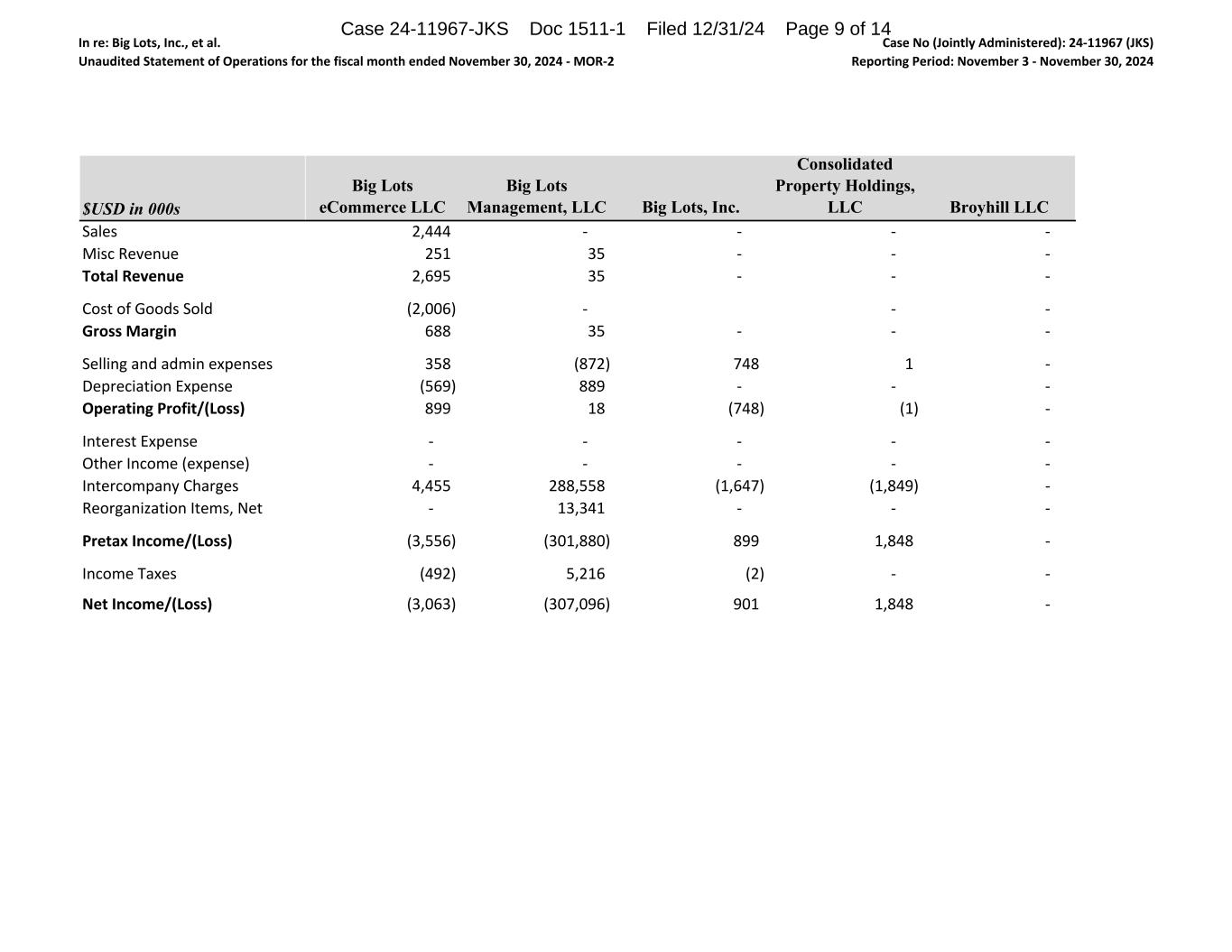 In re: Big Lots, Inc., et al. Unaudited Statement of Operations for the fiscal month ended November 30, 2024 ‐ MOR‐2 Case No (Jointly Administered): 24‐11967 (JKS) Reporting Period: November 3 ‐ November 30, 2024 $USD in 000s Sales Misc Revenue Total Revenue Cost of Goods Sold Gross Margin  Selling and admin expenses Depreciation Expense Operating Profit/(Loss) Interest Expense Other Income (expense) Intercompany Charges Reorganization Items, Net Pretax Income/(Loss) Income Taxes Net Income/(Loss) Big Lots eCommerce LLC Big Lots Management, LLC Big Lots, Inc. Consolidated Property Holdings, LLC Broyhill LLC 2,444                            ‐                                ‐                                ‐                                ‐                                251                               35                                 ‐                                ‐                                ‐                                2,695                            35                                 ‐                                ‐                                ‐                                (2,006)                          ‐                                ‐                                ‐                                688                               35                                 ‐                                ‐                                ‐                                358                               (872)                              748                               1                                    ‐                                (569)                              889                               ‐                                ‐                                ‐                                899                               18                                 (748)                              (1)                                  ‐                                ‐                                ‐                                ‐                                ‐                                ‐                                ‐                                ‐                                ‐                                ‐                                ‐                                4,455                            288,558                       (1,647)                          (1,849)                          ‐                                ‐                                13,341                         ‐                                ‐                                ‐                                (3,556)                          (301,880)                      899                               1,848                            ‐                                (492)                              5,216                            (2)                                  ‐                                ‐                                (3,063)                          (307,096)                      901                               1,848                            ‐                                Case 24-11967-JKS Doc 1511-1 Filed 12/31/24 Page 9 of 14