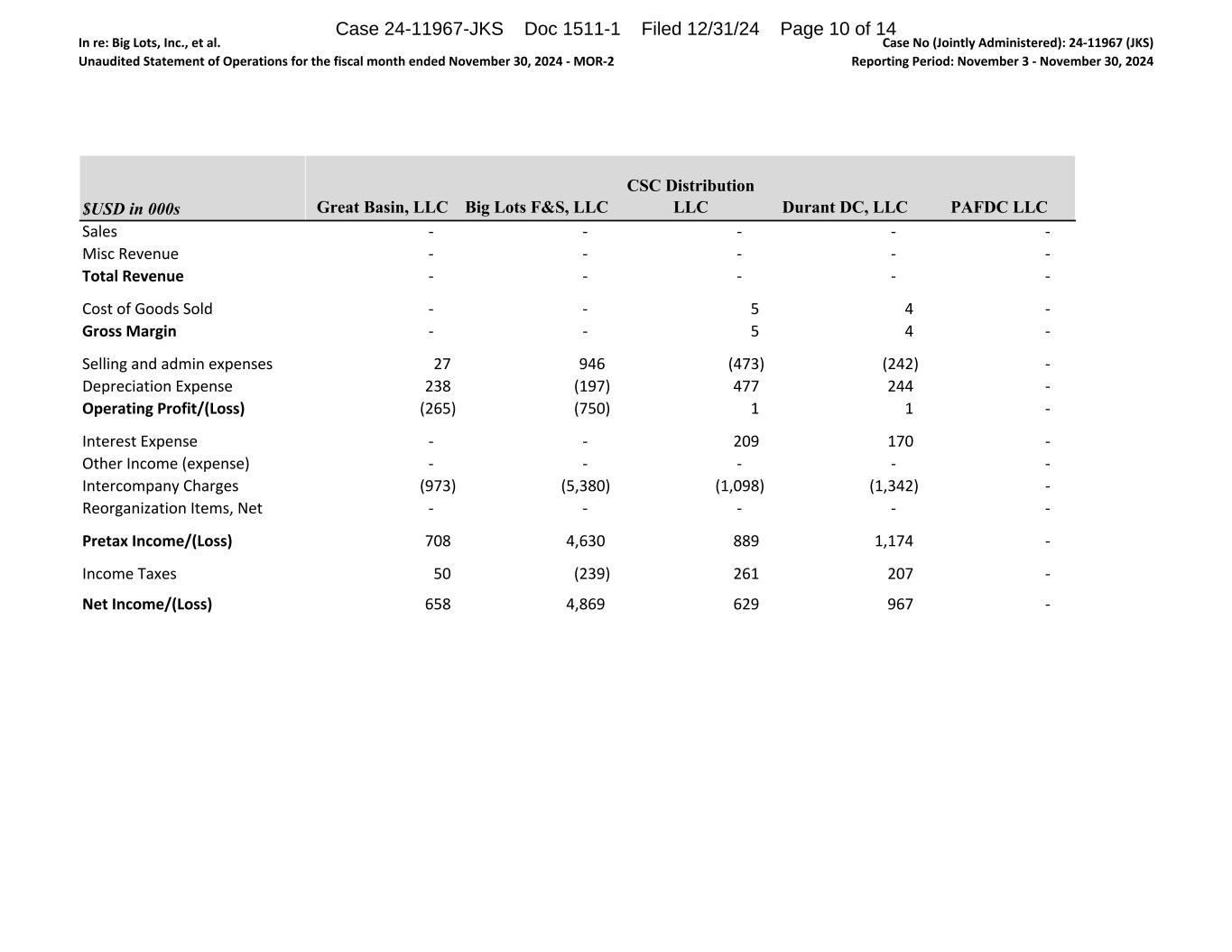 In re: Big Lots, Inc., et al. Unaudited Statement of Operations for the fiscal month ended November 30, 2024 ‐ MOR‐2 Case No (Jointly Administered): 24‐11967 (JKS) Reporting Period: November 3 ‐ November 30, 2024 $USD in 000s Sales Misc Revenue Total Revenue Cost of Goods Sold Gross Margin  Selling and admin expenses Depreciation Expense Operating Profit/(Loss) Interest Expense Other Income (expense) Intercompany Charges Reorganization Items, Net Pretax Income/(Loss) Income Taxes Net Income/(Loss) Great Basin, LLC Big Lots F&S, LLC CSC Distribution LLC Durant DC, LLC PAFDC LLC ‐                                ‐                                ‐                                ‐                                ‐                                ‐                                ‐                                ‐                                ‐                                ‐                                ‐                                ‐                                ‐                                ‐                                ‐                                ‐                                ‐                                5                                    4                                    ‐                                ‐                                ‐                                5                                    4                                    ‐                                27                                 946                               (473)                              (242)                              ‐                                238                               (197)                              477                               244                               ‐                                (265)                              (750)                              1                                    1                                    ‐                                ‐                                ‐                                209                               170                               ‐                                ‐                                ‐                                ‐                                ‐                                ‐                                (973)                              (5,380)                          (1,098)                          (1,342)                          ‐                                ‐                                ‐                                ‐                                ‐                                ‐                                708                               4,630                            889                               1,174                            ‐                                50                                 (239)                              261                               207                               ‐                                658                               4,869                            629                               967                               ‐                                Case 24-11967-JKS Doc 1511-1 Filed 12/31/24 Page 10 of 14