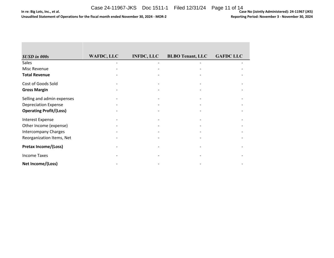 In re: Big Lots, Inc., et al. Unaudited Statement of Operations for the fiscal month ended November 30, 2024 ‐ MOR‐2 Case No (Jointly Administered): 24‐11967 (JKS) Reporting Period: November 3 ‐ November 30, 2024 $USD in 000s Sales Misc Revenue Total Revenue Cost of Goods Sold Gross Margin  Selling and admin expenses Depreciation Expense Operating Profit/(Loss) Interest Expense Other Income (expense) Intercompany Charges Reorganization Items, Net Pretax Income/(Loss) Income Taxes Net Income/(Loss) WAFDC, LLC INFDC, LLC BLBO Tenant, LLC GAFDC LLC ‐                                ‐                                ‐                                ‐                                ‐                                ‐                                ‐                                ‐                                ‐                                ‐                                ‐                                ‐                                ‐                                ‐                                ‐                                ‐                                ‐                                ‐                                ‐                                ‐                                ‐                                ‐                                ‐                                ‐                                ‐                                ‐                                ‐                                ‐                                ‐                                ‐                                ‐                                ‐                                ‐                                ‐                                ‐                                ‐                                ‐                                ‐                                ‐                                ‐                                ‐                                ‐                                ‐                                ‐                                ‐                                ‐                                ‐                                ‐                                ‐                                ‐                                ‐                                ‐                                ‐                                ‐                                ‐                                ‐                                ‐                                ‐                                ‐                                ‐                                Case 24-11967-JKS Doc 1511-1 Filed 12/31/24 Page 11 of 14