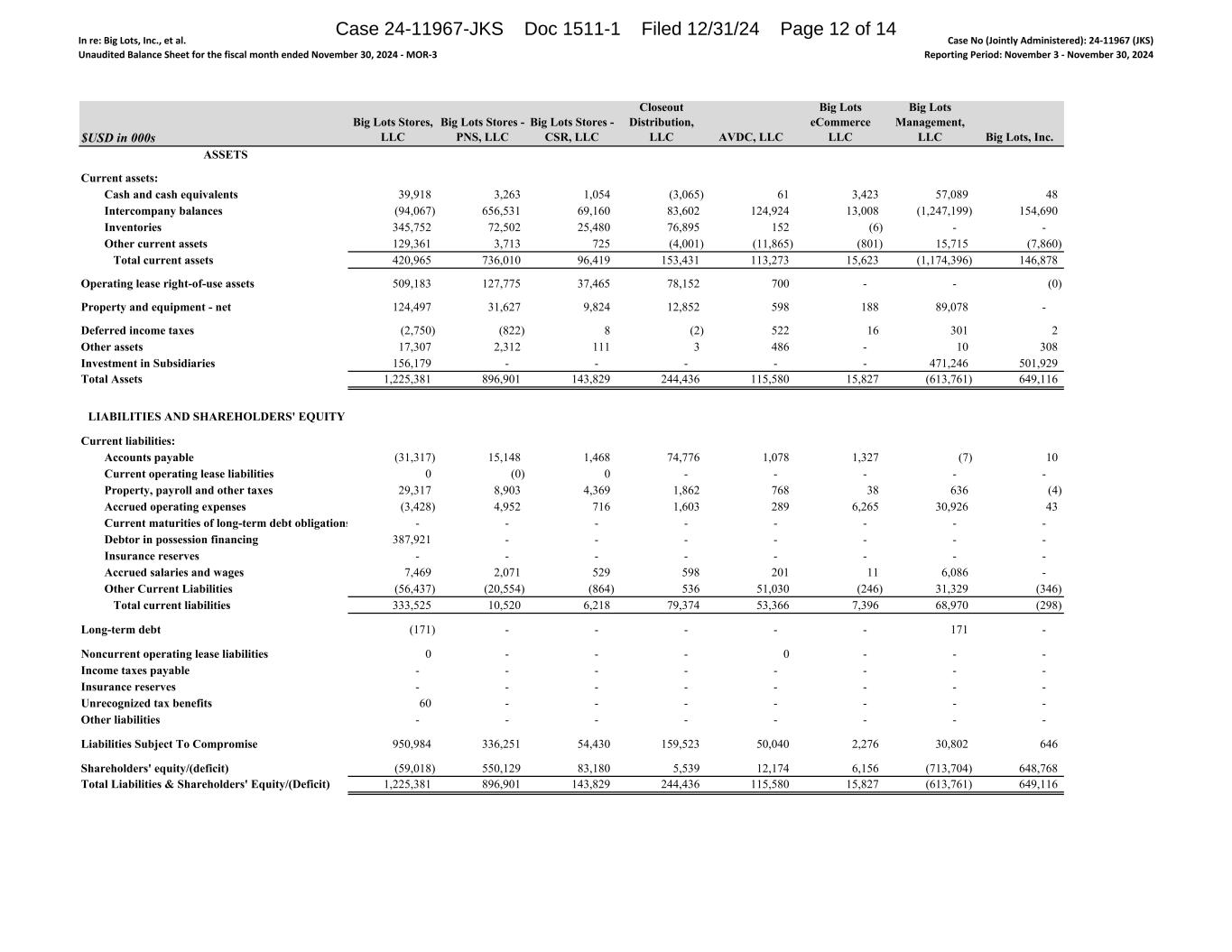 In re: Big Lots, Inc., et al. Unaudited Balance Sheet for the fiscal month ended November 30, 2024 ‐ MOR‐3 Case No (Jointly Administered): 24‐11967 (JKS) Reporting Period: November 3 ‐ November 30, 2024 $USD in 000s Big Lots Stores, LLC Big Lots Stores - PNS, LLC Big Lots Stores - CSR, LLC Closeout Distribution, LLC AVDC, LLC Big Lots eCommerce LLC Big Lots Management, LLC Big Lots, Inc. ASSETS Current assets: Cash and cash equivalents 39,918 3,263 1,054 (3,065) 61 3,423 57,089 48 Intercompany balances (94,067) 656,531 69,160 83,602 124,924 13,008 (1,247,199) 154,690 Inventories 345,752 72,502 25,480 76,895 152 (6) - - Other current assets 129,361 3,713 725 (4,001) (11,865) (801) 15,715 (7,860) Total current assets 420,965 736,010 96,419 153,431 113,273 15,623 (1,174,396) 146,878 Operating lease right-of-use assets 509,183 127,775 37,465 78,152 700 - - (0) Property and equipment - net 124,497 31,627 9,824 12,852 598 188 89,078 - Deferred income taxes (2,750) (822) 8 (2) 522 16 301 2 Other assets 17,307 2,312 111 3 486 - 10 308 Investment in Subsidiaries 156,179 - - - - - 471,246 501,929 Total Assets 1,225,381 896,901 143,829 244,436 115,580 15,827 (613,761) 649,116 LIABILITIES AND SHAREHOLDERS' EQUITY Current liabilities: Accounts payable (31,317) 15,148 1,468 74,776 1,078 1,327 (7) 10 Current operating lease liabilities 0 (0) 0 - - - - - Property, payroll and other taxes 29,317 8,903 4,369 1,862 768 38 636 (4) Accrued operating expenses (3,428) 4,952 716 1,603 289 6,265 30,926 43 Current maturities of long-term debt obligations - - - - - - - - Debtor in possession financing 387,921 - - - - - - - Insurance reserves - - - - - - - - Accrued salaries and wages 7,469 2,071 529 598 201 11 6,086 - Other Current Liabilities (56,437) (20,554) (864) 536 51,030 (246) 31,329 (346) Total current liabilities 333,525 10,520 6,218 79,374 53,366 7,396 68,970 (298) Long-term debt (171) - - - - - 171 - Noncurrent operating lease liabilities 0 - - - 0 - - - Income taxes payable - - - - - - - - Insurance reserves - - - - - - - - Unrecognized tax benefits 60 - - - - - - - Other liabilities - - - - - - - - Liabilities Subject To Compromise 950,984 336,251 54,430 159,523 50,040 2,276 30,802 646 Shareholders' equity/(deficit) (59,018) 550,129 83,180 5,539 12,174 6,156 (713,704) 648,768 Total Liabilities & Shareholders' Equity/(Deficit) 1,225,381 896,901 143,829 244,436 115,580 15,827 (613,761) 649,116 Case 24-11967-JKS Doc 1511-1 Filed 12/31/24 Page 12 of 14