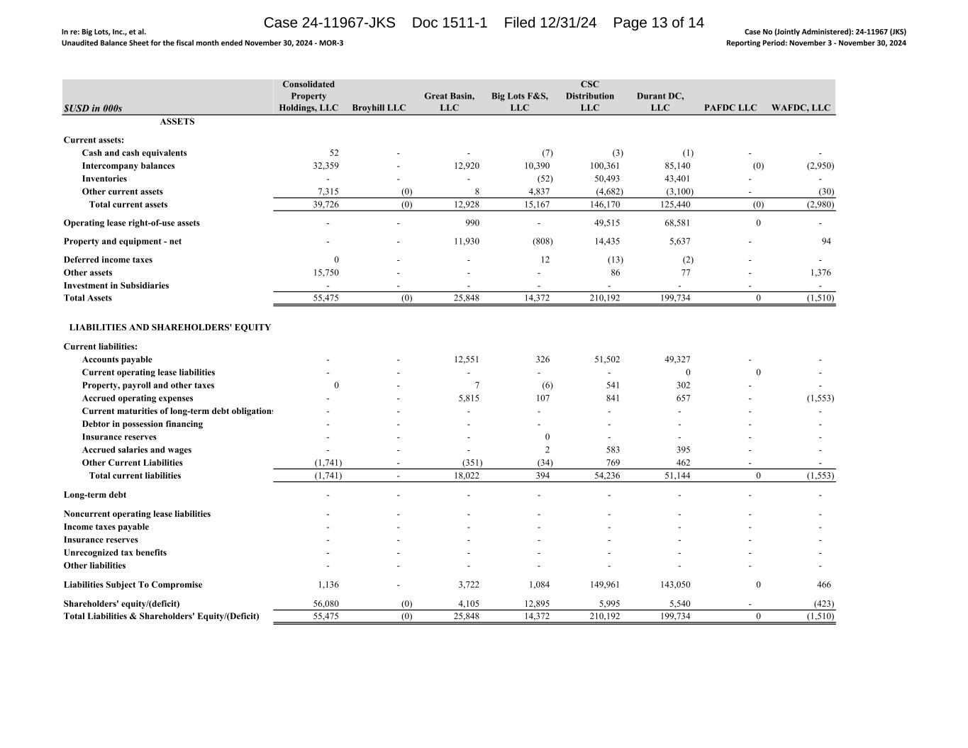 In re: Big Lots, Inc., et al. Unaudited Balance Sheet for the fiscal month ended November 30, 2024 ‐ MOR‐3 Case No (Jointly Administered): 24‐11967 (JKS) Reporting Period: November 3 ‐ November 30, 2024 $USD in 000s ASSETS Current assets: Cash and cash equivalents Intercompany balances Inventories Other current assets Total current assets Operating lease right-of-use assets Property and equipment - net Deferred income taxes Other assets Investment in Subsidiaries Total Assets LIABILITIES AND SHAREHOLDERS' EQUITY Current liabilities: Accounts payable Current operating lease liabilities Property, payroll and other taxes Accrued operating expenses Current maturities of long-term debt obligations Debtor in possession financing Insurance reserves Accrued salaries and wages Other Current Liabilities Total current liabilities Long-term debt Noncurrent operating lease liabilities Income taxes payable Insurance reserves Unrecognized tax benefits Other liabilities Liabilities Subject To Compromise Shareholders' equity/(deficit) Total Liabilities & Shareholders' Equity/(Deficit) Consolidated Property Holdings, LLC Broyhill LLC Great Basin, LLC Big Lots F&S, LLC CSC Distribution LLC Durant DC, LLC PAFDC LLC WAFDC, LLC 52 - - (7) (3) (1) - - 32,359 - 12,920 10,390 100,361 85,140 (0) (2,950) - - - (52) 50,493 43,401 - - 7,315 (0) 8 4,837 (4,682) (3,100) - (30) 39,726 (0) 12,928 15,167 146,170 125,440 (0) (2,980) - - 990 - 49,515 68,581 0 - - - 11,930 (808) 14,435 5,637 - 94 0 - - 12 (13) (2) - - 15,750 - - - 86 77 - 1,376 - - - - - - - - 55,475 (0) 25,848 14,372 210,192 199,734 0 (1,510) - - 12,551 326 51,502 49,327 - - - - - - - 0 0 - 0 - 7 (6) 541 302 - - - - 5,815 107 841 657 - (1,553) - - - - - - - - - - - - - - - - - - - 0 - - - - - - - 2 583 395 - - (1,741) - (351) (34) 769 462 - - (1,741) - 18,022 394 54,236 51,144 0 (1,553) - - - - - - - - - - - - - - - - - - - - - - - - - - - - - - - - - - - - - - - - - - - - - - - - 1,136 - 3,722 1,084 149,961 143,050 0 466 56,080 (0) 4,105 12,895 5,995 5,540 - (423) 55,475 (0) 25,848 14,372 210,192 199,734 0 (1,510) Case 24-11967-JKS Doc 1511-1 Filed 12/31/24 Page 13 of 14