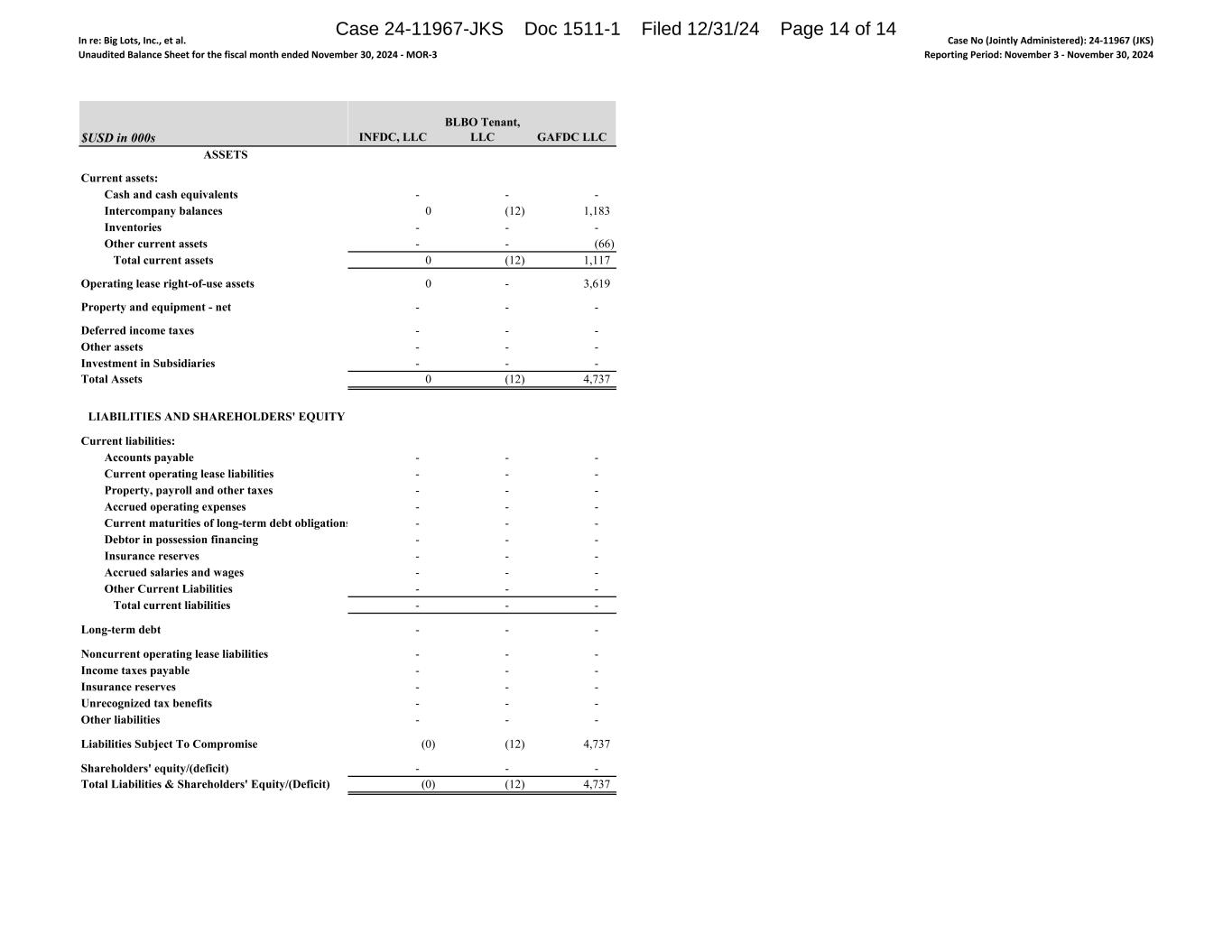 In re: Big Lots, Inc., et al. Unaudited Balance Sheet for the fiscal month ended November 30, 2024 ‐ MOR‐3 Case No (Jointly Administered): 24‐11967 (JKS) Reporting Period: November 3 ‐ November 30, 2024 $USD in 000s ASSETS Current assets: Cash and cash equivalents Intercompany balances Inventories Other current assets Total current assets Operating lease right-of-use assets Property and equipment - net Deferred income taxes Other assets Investment in Subsidiaries Total Assets LIABILITIES AND SHAREHOLDERS' EQUITY Current liabilities: Accounts payable Current operating lease liabilities Property, payroll and other taxes Accrued operating expenses Current maturities of long-term debt obligations Debtor in possession financing Insurance reserves Accrued salaries and wages Other Current Liabilities Total current liabilities Long-term debt Noncurrent operating lease liabilities Income taxes payable Insurance reserves Unrecognized tax benefits Other liabilities Liabilities Subject To Compromise Shareholders' equity/(deficit) Total Liabilities & Shareholders' Equity/(Deficit) INFDC, LLC BLBO Tenant, LLC GAFDC LLC - - - 0 (12) 1,183 - - - - - (66) 0 (12) 1,117 0 - 3,619 - - - - - - - - - - - - 0 (12) 4,737 - - - - - - - - - - - - - - - - - - - - - - - - - - - - - - - - - - - - - - - - - - - - - - - - (0) (12) 4,737 - - - (0) (12) 4,737 Case 24-11967-JKS Doc 1511-1 Filed 12/31/24 Page 14 of 14